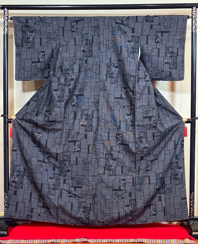 ■品物の様相 沖縄の織物の特徴のひとつに、糸を浮かせて模様を表現する「浮き織」の技法があります。 人間国宝・宮平初子氏の首里花織をはじめ、花織に代表される技法として知られています。 現在では、この浮き織の技法は各地の織物にも応用され、織機による製織も行われるようになりました。 そのため、市場には大量生産された廉価品も存在します。 本品は、花織の意匠と浮き織の表情を活かして織られた一反で、量産品とは異なる、手仕事ならではの織の風合いが感じられる織物です。 現地で織られたもの、または花織技法を習得した織り手により本土で織られたものなど、背景は様々ですが、本品は紬問屋より協賛として提供された展示会用のお品となります。 ※ 南風原花織などの特定産地銘柄を保証するものではございません。 ■評 価 花織の特徴である浮き織を全体に配した、表情豊かな無地感覚の着物です。 紋意匠の無地とは異なり、織そのものの凹凸と風合いが際立ち、着姿に奥行きを与えてくれます。 地色は渋みのある根岸色系で、落ち着いた印象ながら、帯合わせ次第で幅広い年代の方にお楽しみいただけます。 実際に30代後半のスタッフが試着したところ、重くなりすぎず、程よい洒落感が感じられました。 伝統的な技法の味わいが、日常の装いに自然に溶け込む一枚です。 ※ 襟裏にホック跡が一点ございます(画像をご確認ください)。 ■商品説明における状態表示 [*未使用とは人が装っていない未着用のもの] 【未使用】 月日が経過していない未着用保存品。 【未使用に近い】 購入者又は業者が仕立てしたあとの未着用保存品。 【目立った傷や汚れなし】 保存年月が経過している未着用保存品。 又は着用はあれど傷や汚れ汚れがほとんどない未着用に近い品。 【やや傷や汚れあり】 着用の有無、保存期間に関わらない。 傷・汚れ・変色など小々確認できる品。 *着物類は人が着用した場合は身体に密着しますので、必ず汗/タンパク質、筋あと等が残りますことから目利きの基準にしております。 他は商品説明において表示しています。 ■寸法/サイズ(寸→cm 換算0.379/小数点以下四捨五入) 身丈[肩から:4尺3寸3分/164cm] 内揚前後[1寸8分/7cm] *内揚は腰上部分で二重になっています。 --- 肩行[1尺7寸/64cm] 袖付け箇所縫い込み 身側・袖側[1寸3分/5cm] *生地表から手触りでの採寸ですので実際とは違う場合があります。 --- 袖巾[8寸6分/33cm] 袖丈[1尺3寸/49cm] --- 前巾[6寸6分/25cm] 後巾[7寸9分/30cm] --- 褄下[2尺1寸/80cm]