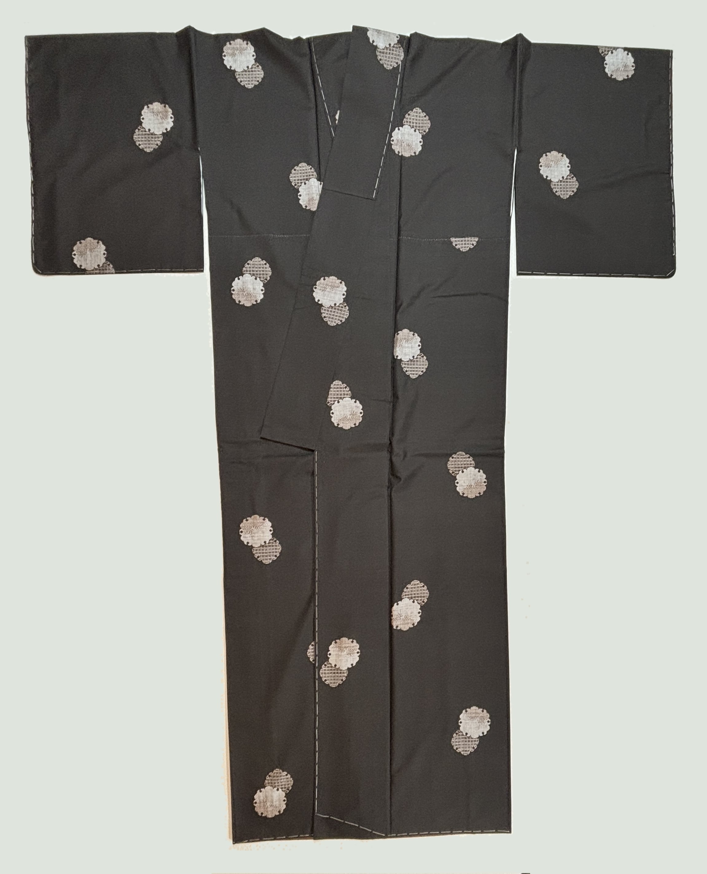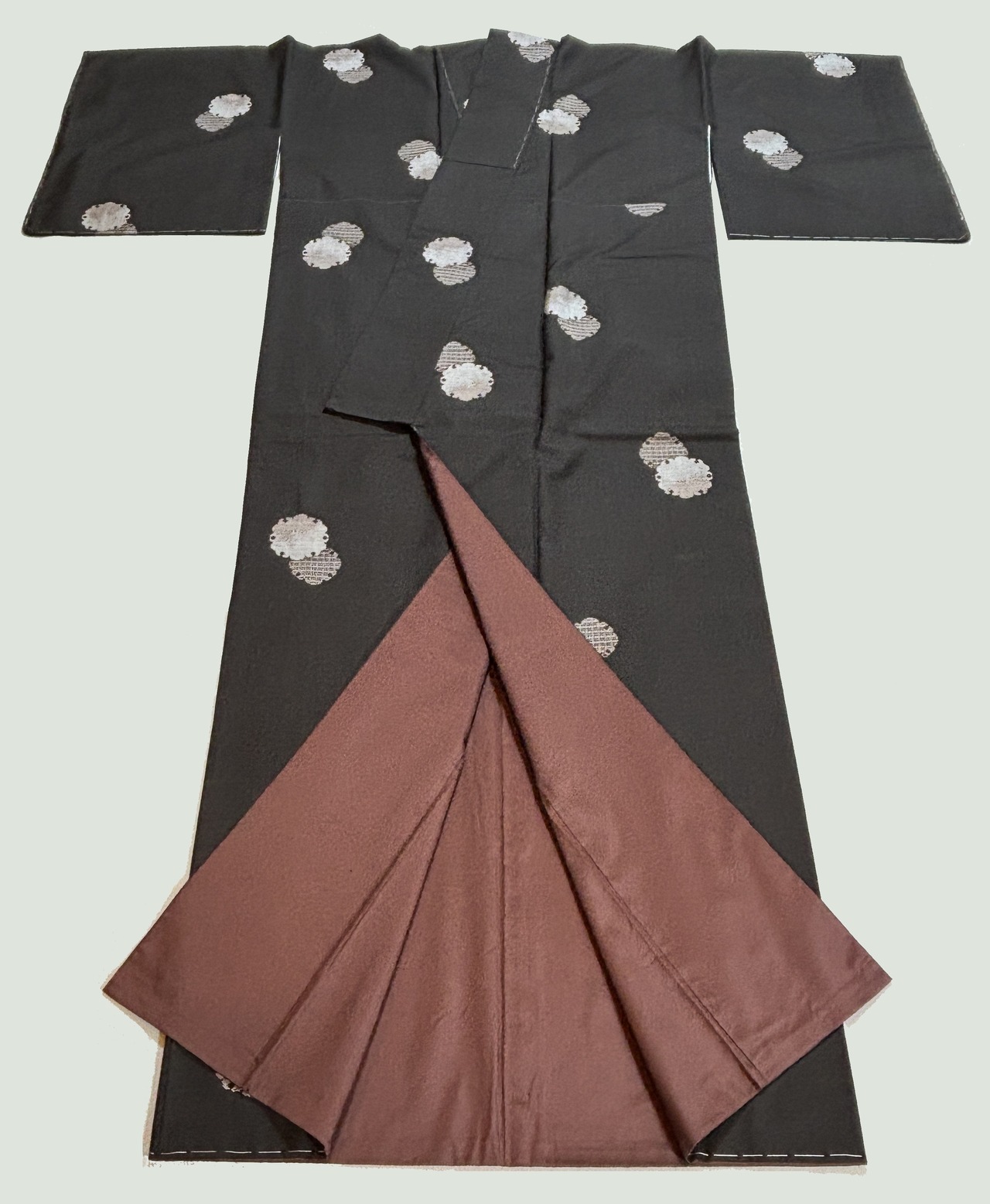 光沢のある黒色をした泥染め、テーチ木(車輪梅)から採れる赤茶色の染料と泥田の鉄分が化学反応を起こし、何十回も繰り返し染めることによって生まれる色で、9マルキカタス絣で柄を『飛び柄/地空き』で表現しています。