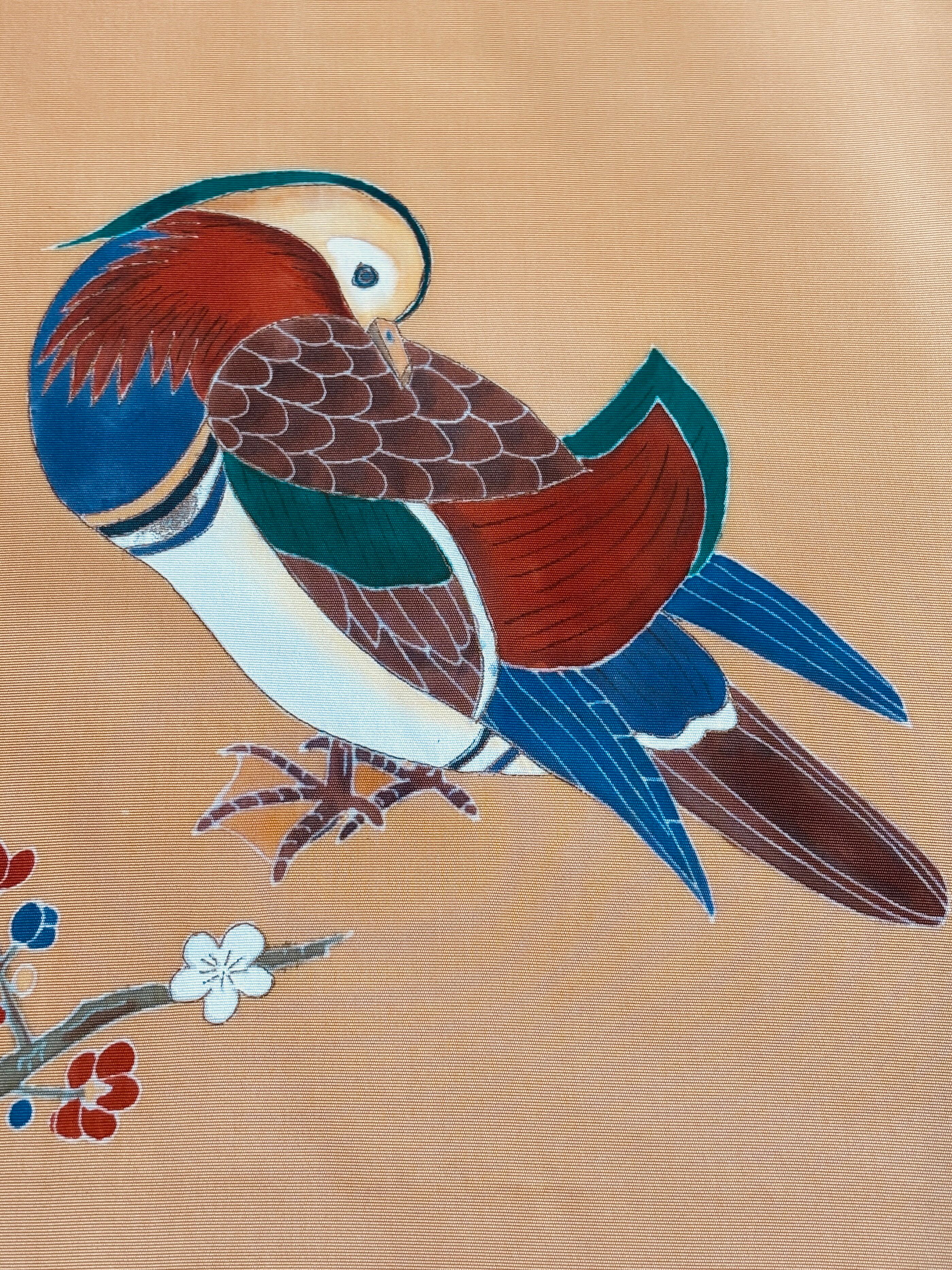 春先の枝花と鴛鴦を優しい色合いとタッチで表現しています。