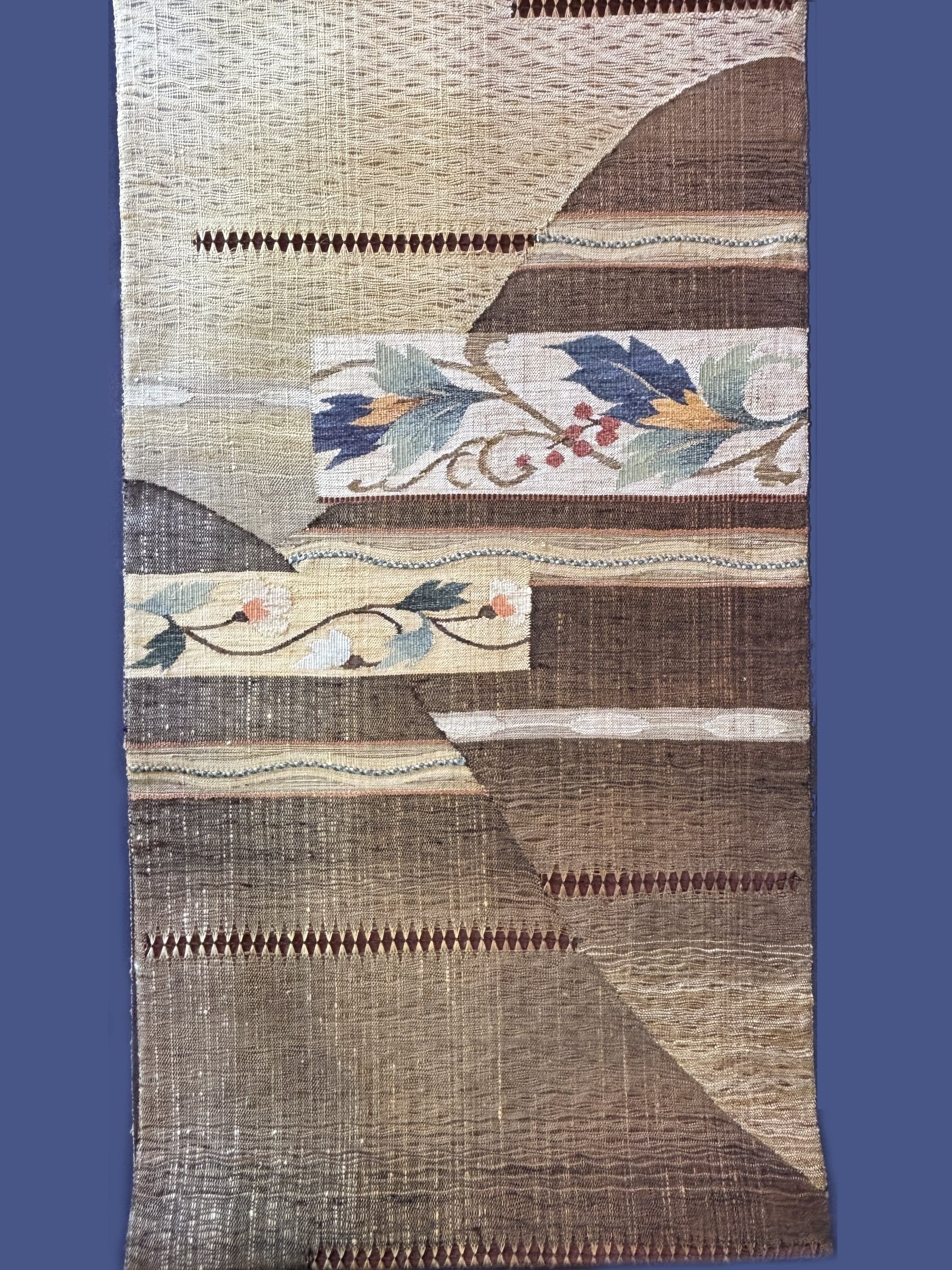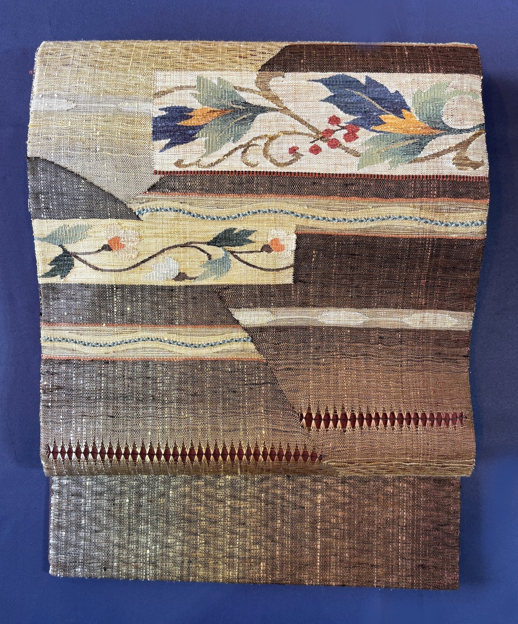 一般的には金銀糸を使わないおしゃれな紬糸などで織られ、比較的カジュアルな装いに合わせる「洒落袋帯」です。