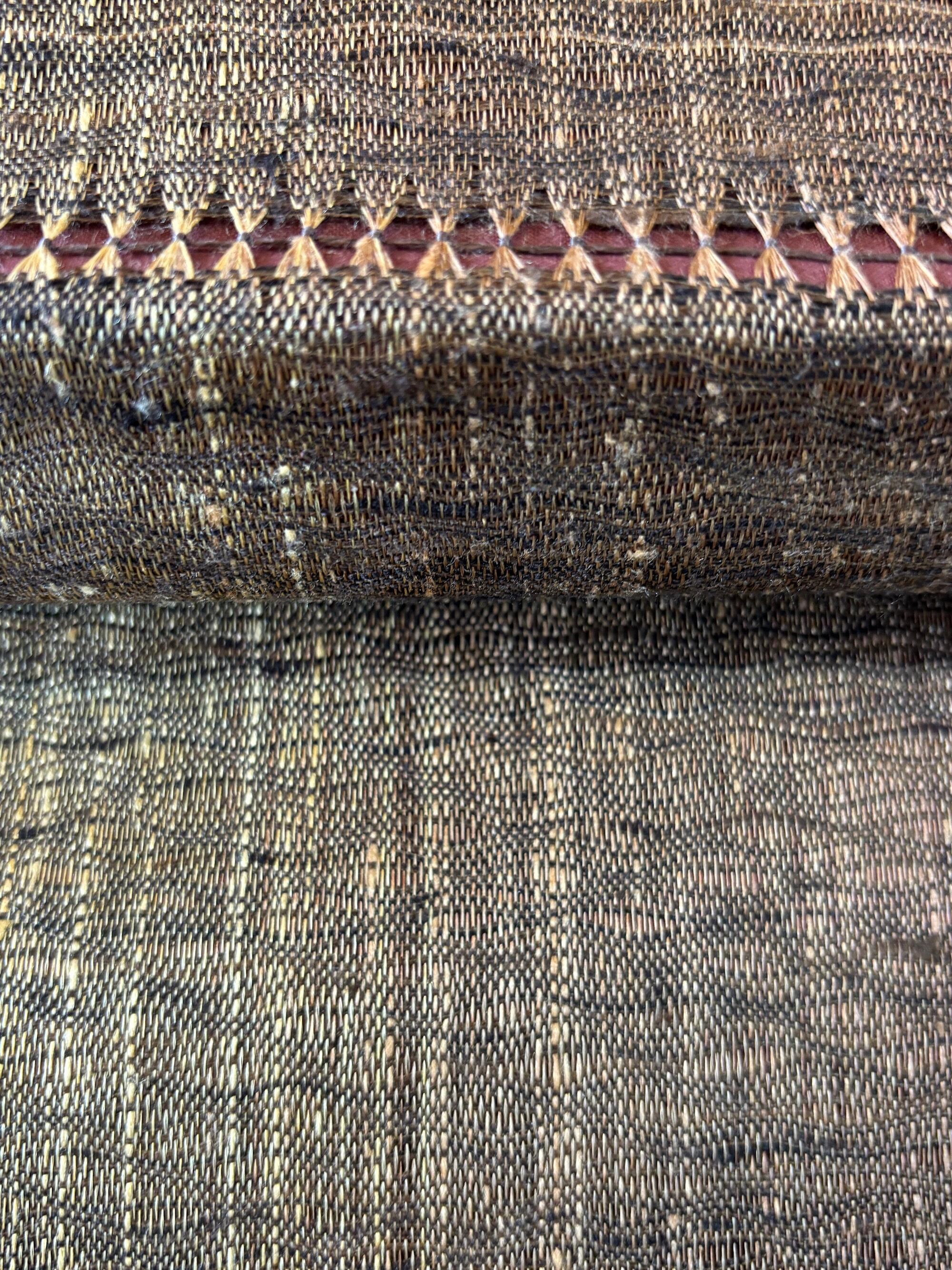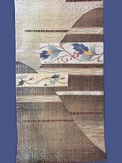 独特の地色にすくい織りでインド唐草を織り上げた袋帯です。