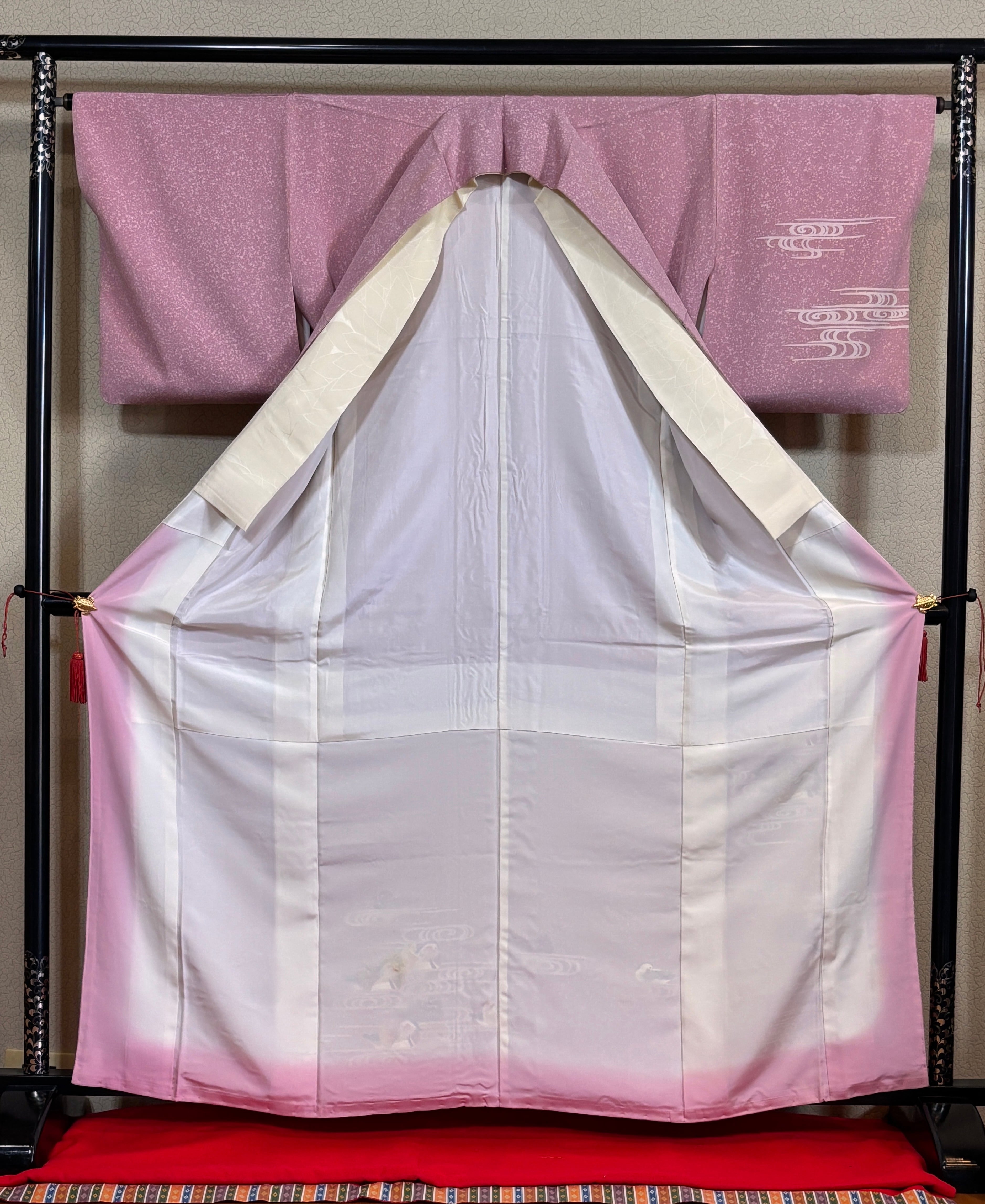 ミスからヤングミセスと、幅広く装っていただけますピンクローズ系の地色(叩き染)で全体を表現していますす。