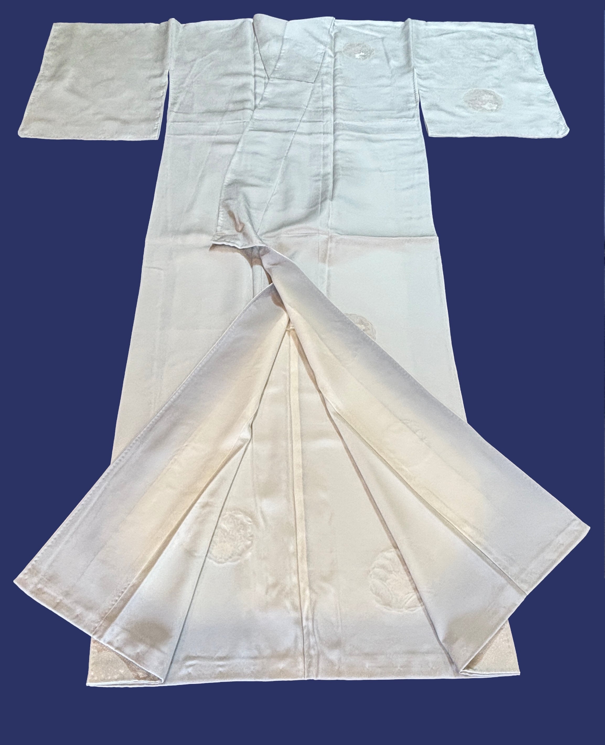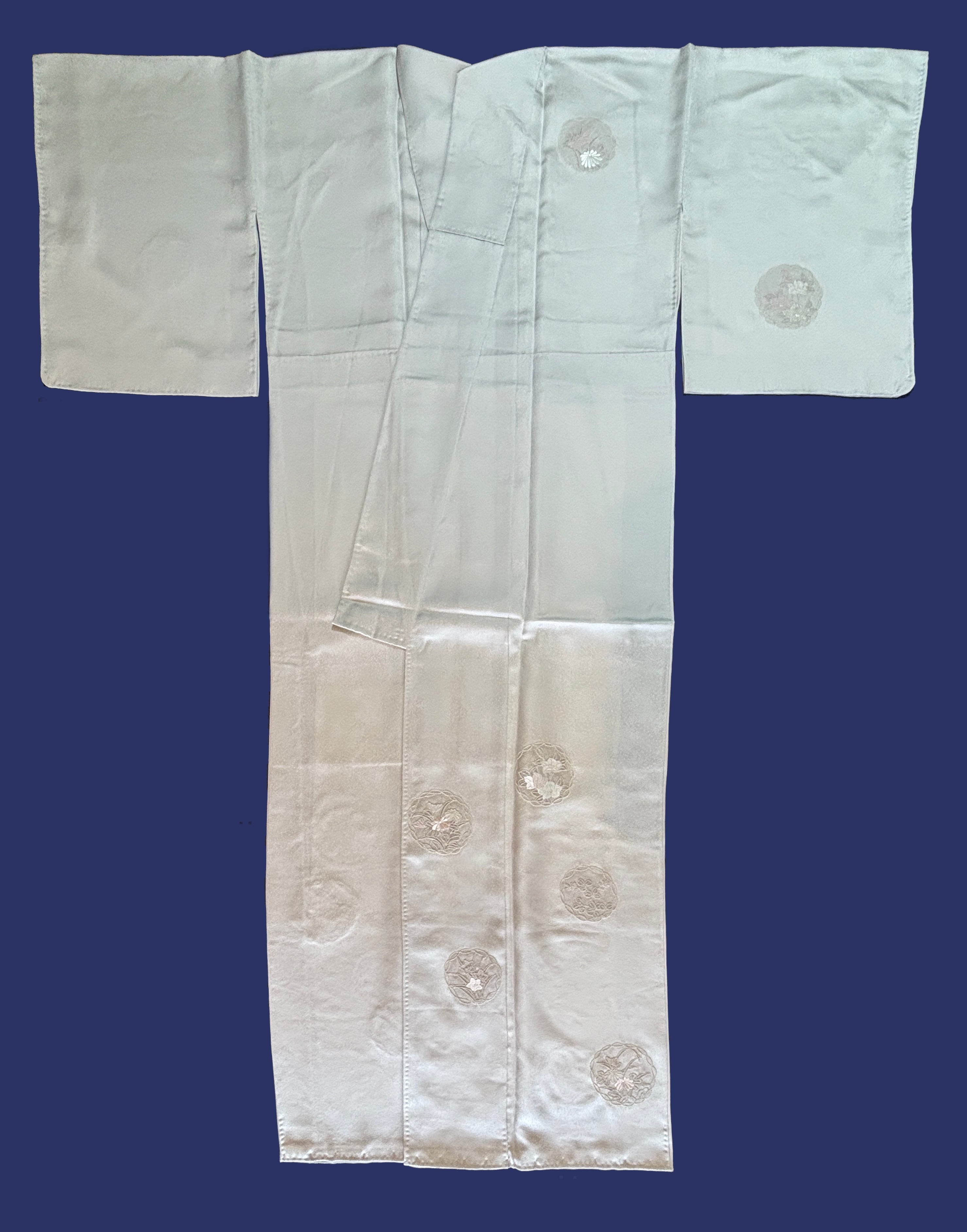 極々薄い少しブルーがかったグレイ色にて地色を染め、八掛も共濃い色にて合わせてあります。
