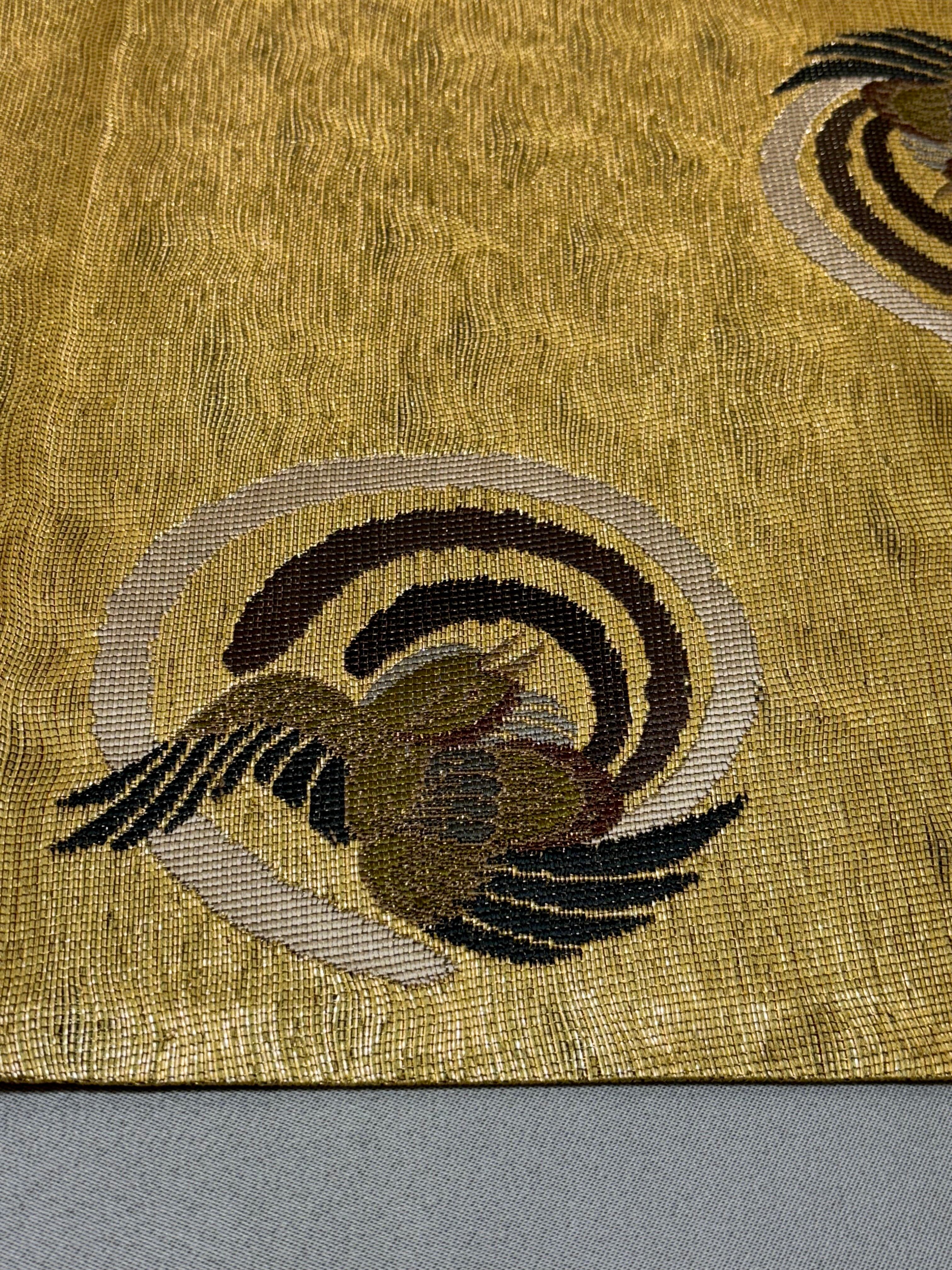 帯地に金箔を織り込んでいますので、締めれば必ず金箔に折れあとが残ります。