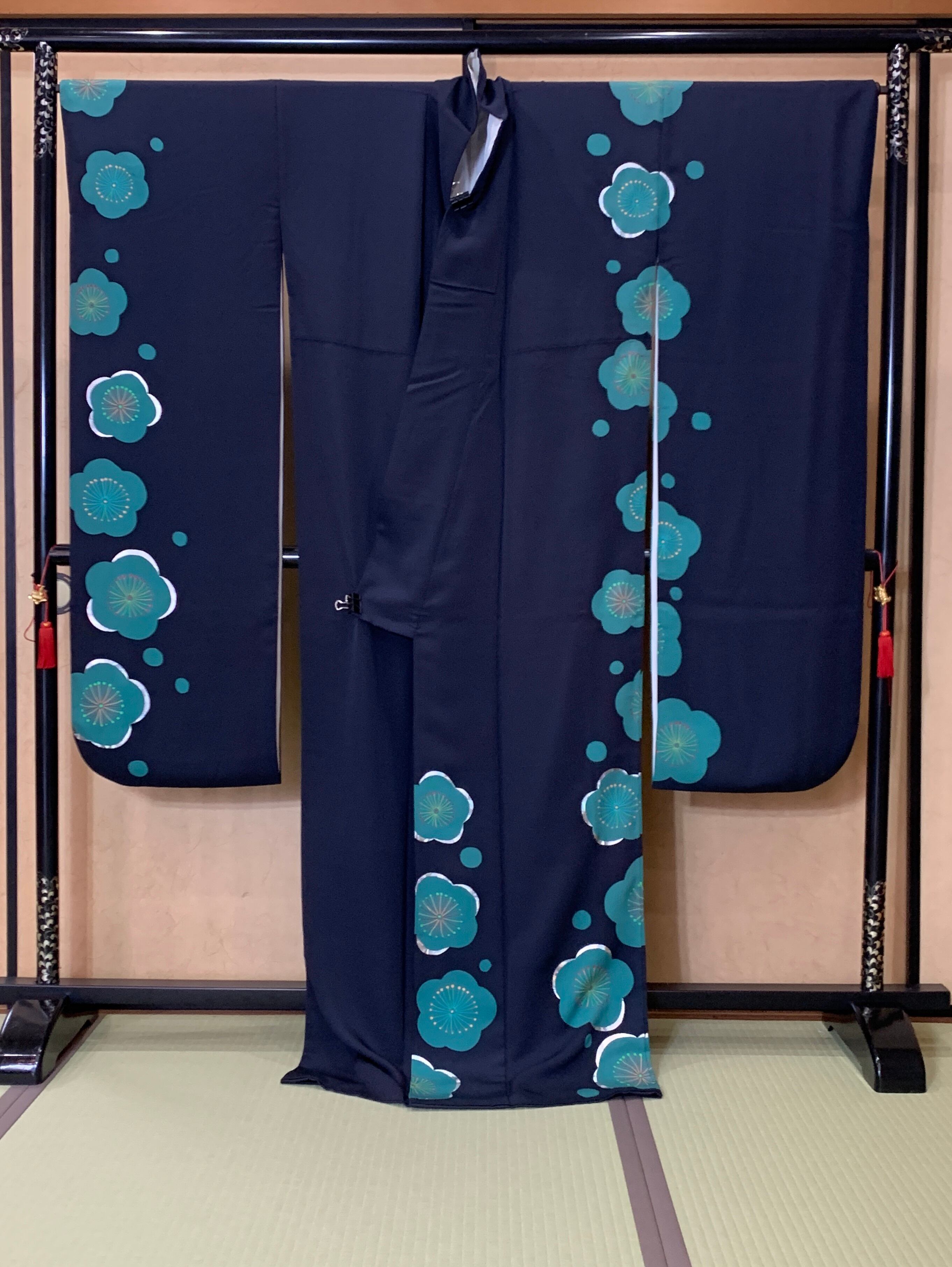 五越しの重めな生地に、紺地に現代風のモダン花を配置した手描きの本友禅の振袖です。 パールトーン加工が施してあります。