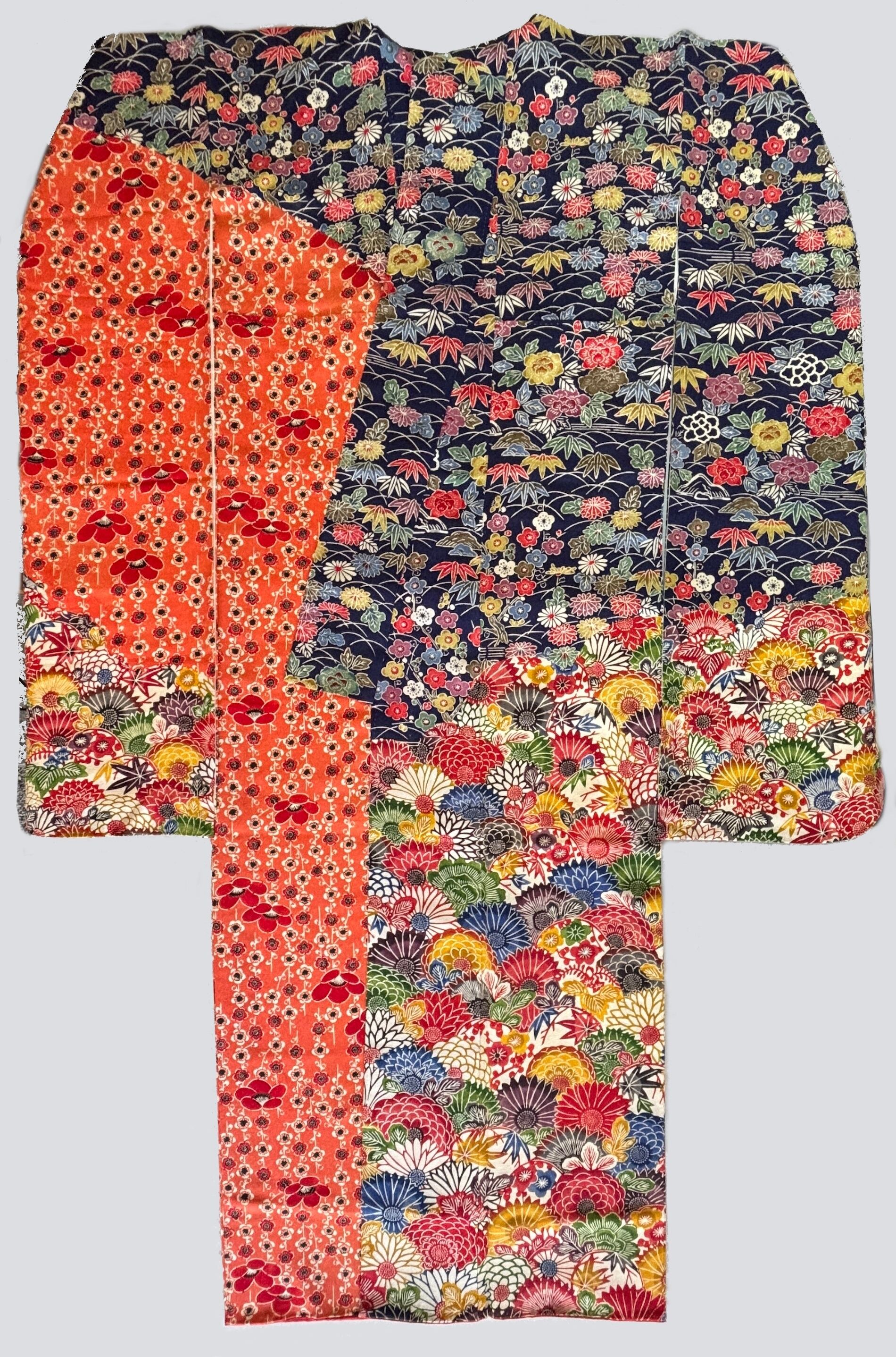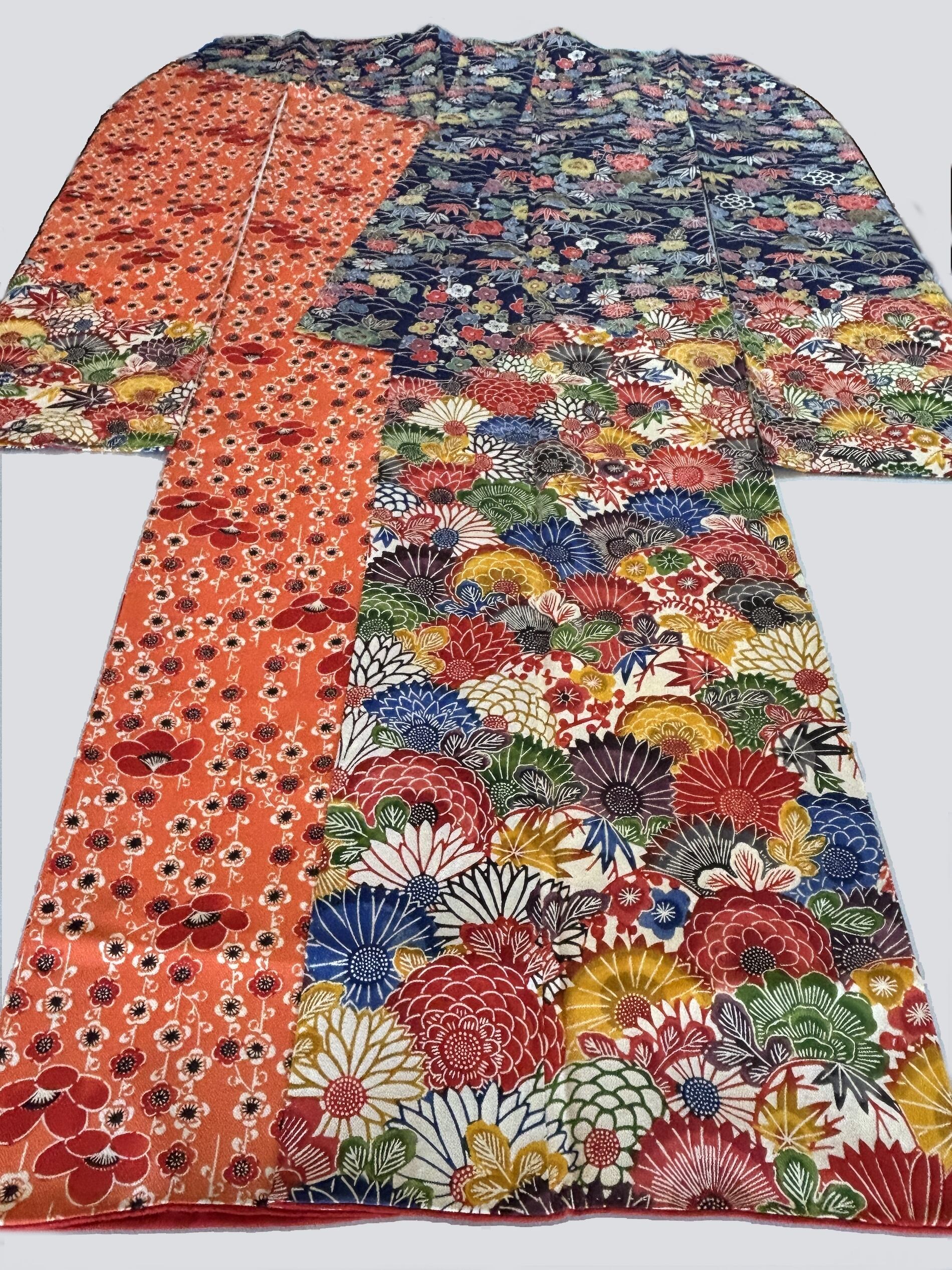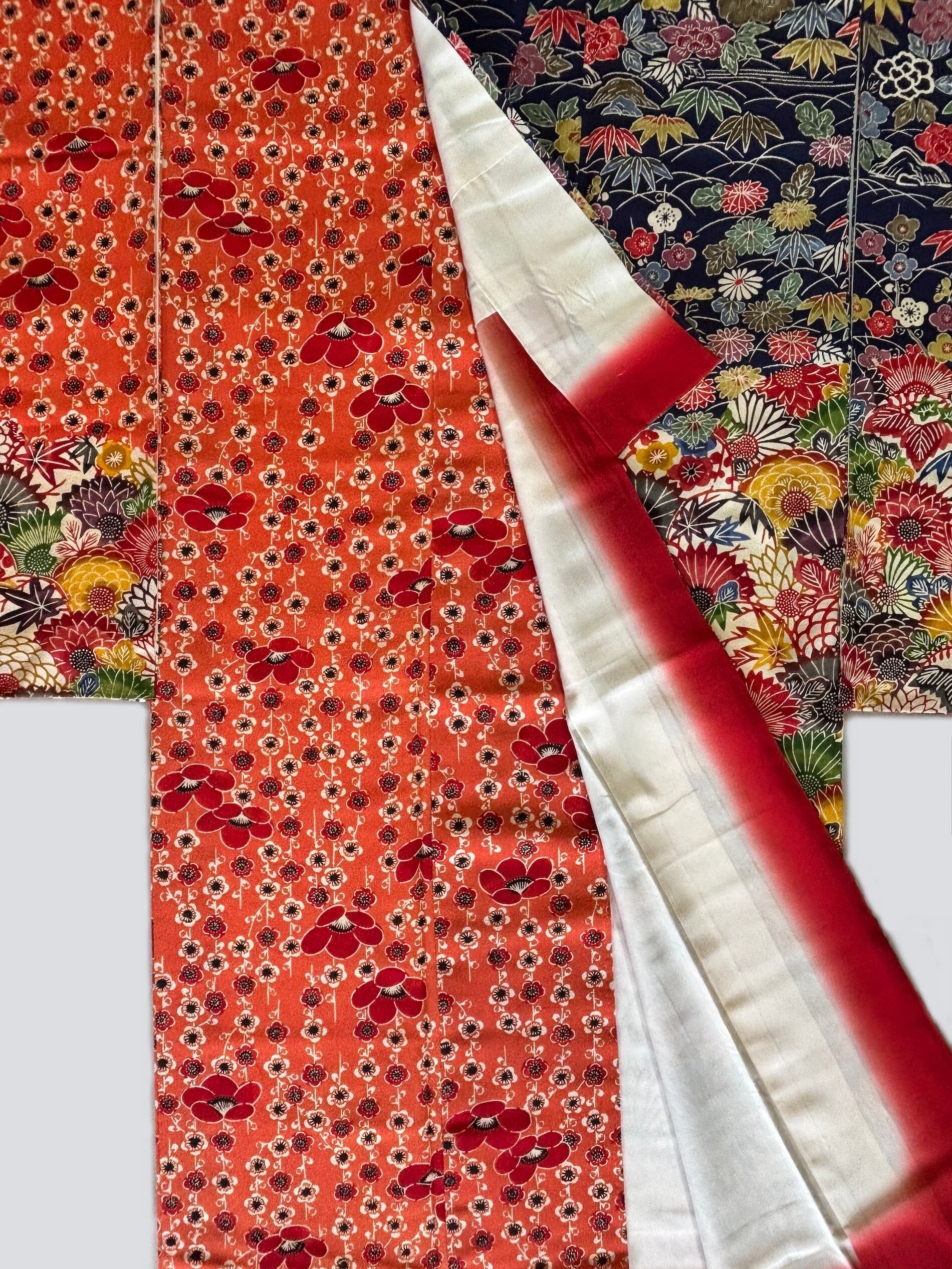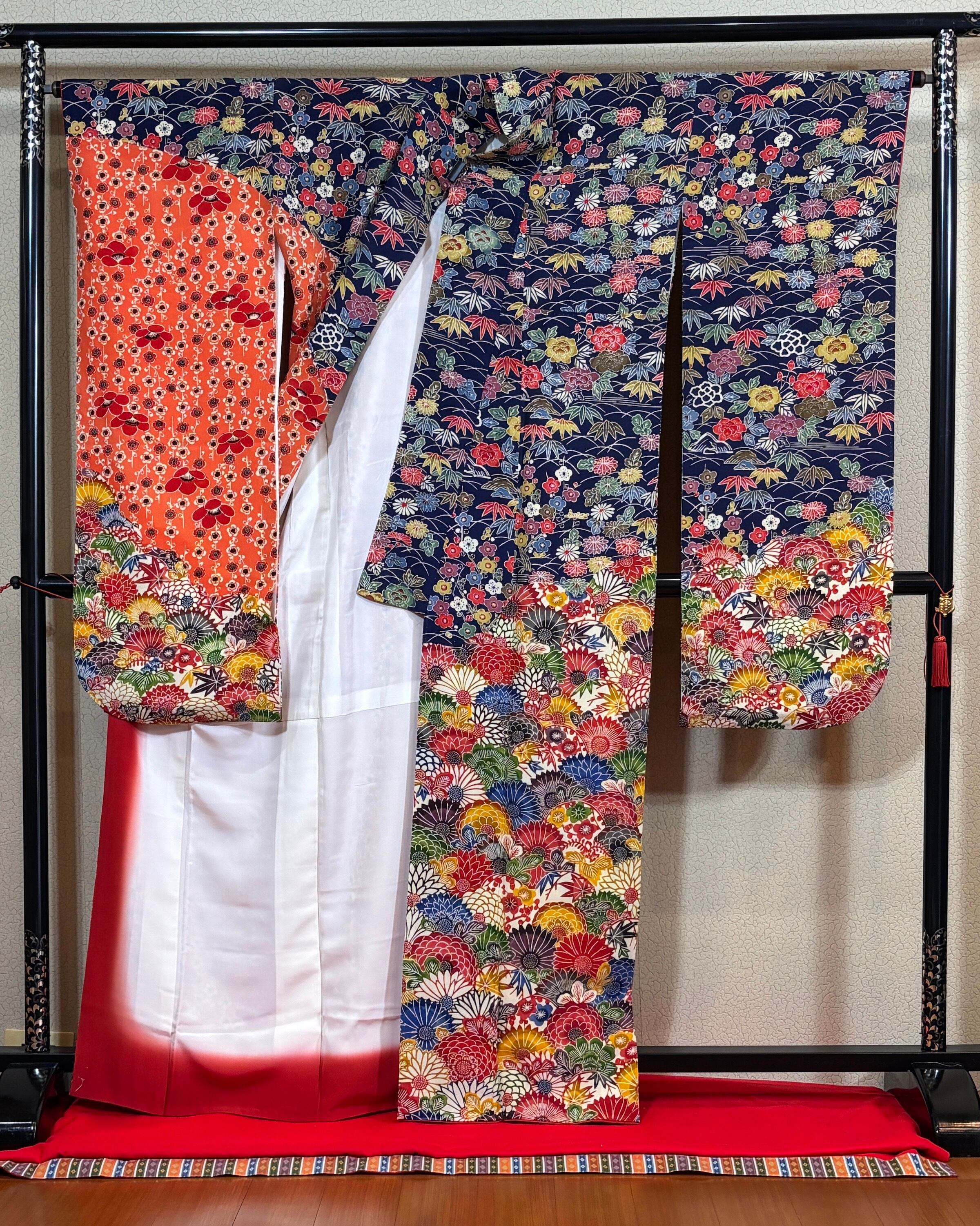 この京紅型も四季の花を豪華に配し、絵羽回りの柄配置にて描いています。