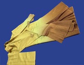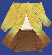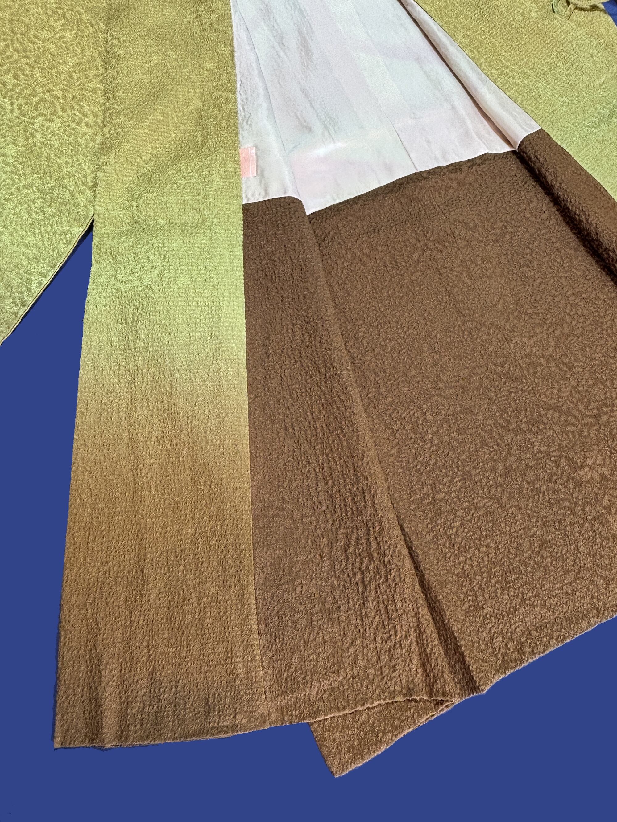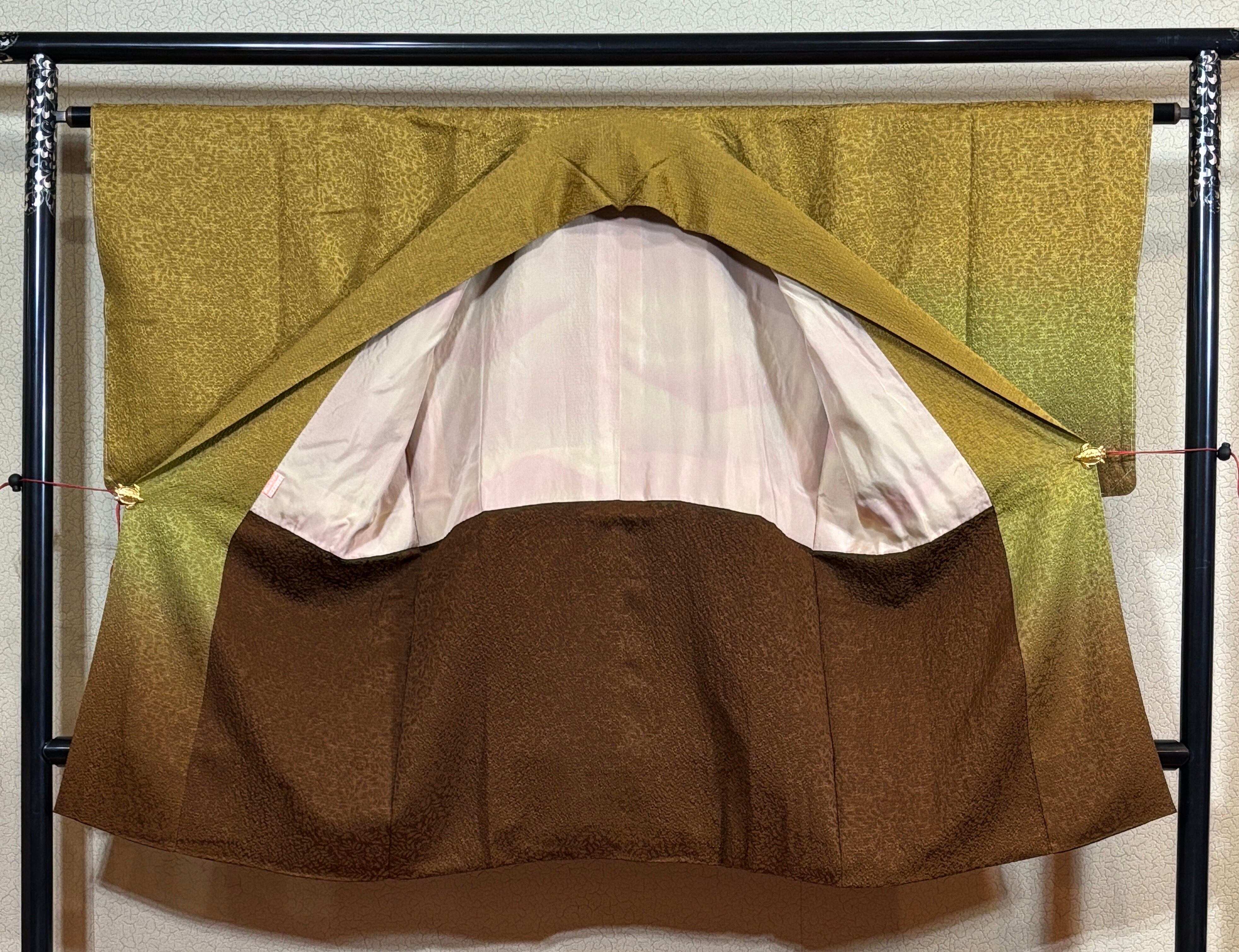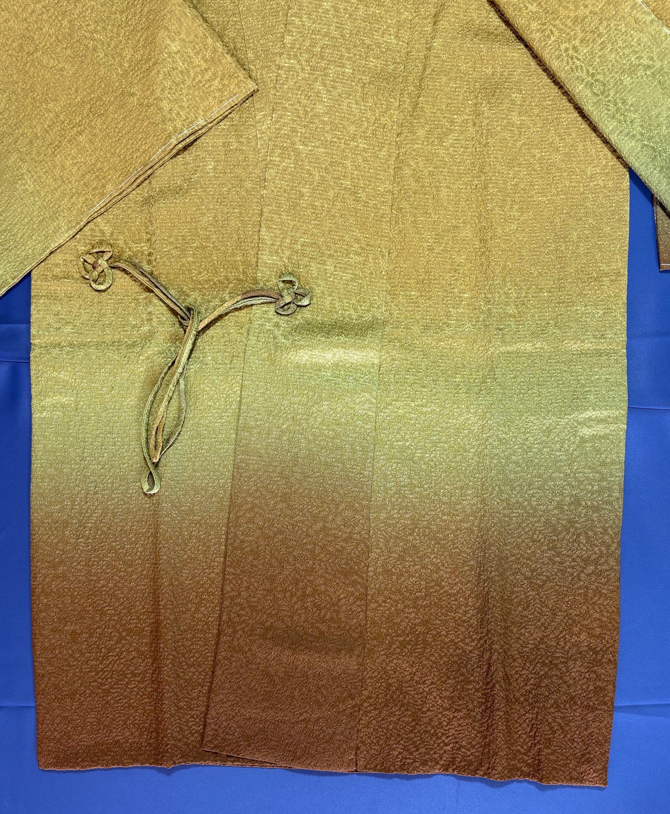 膨れ織地に細かい唐草を織り上げた生地に辛子色と濃茶色で染わけた道中着です。