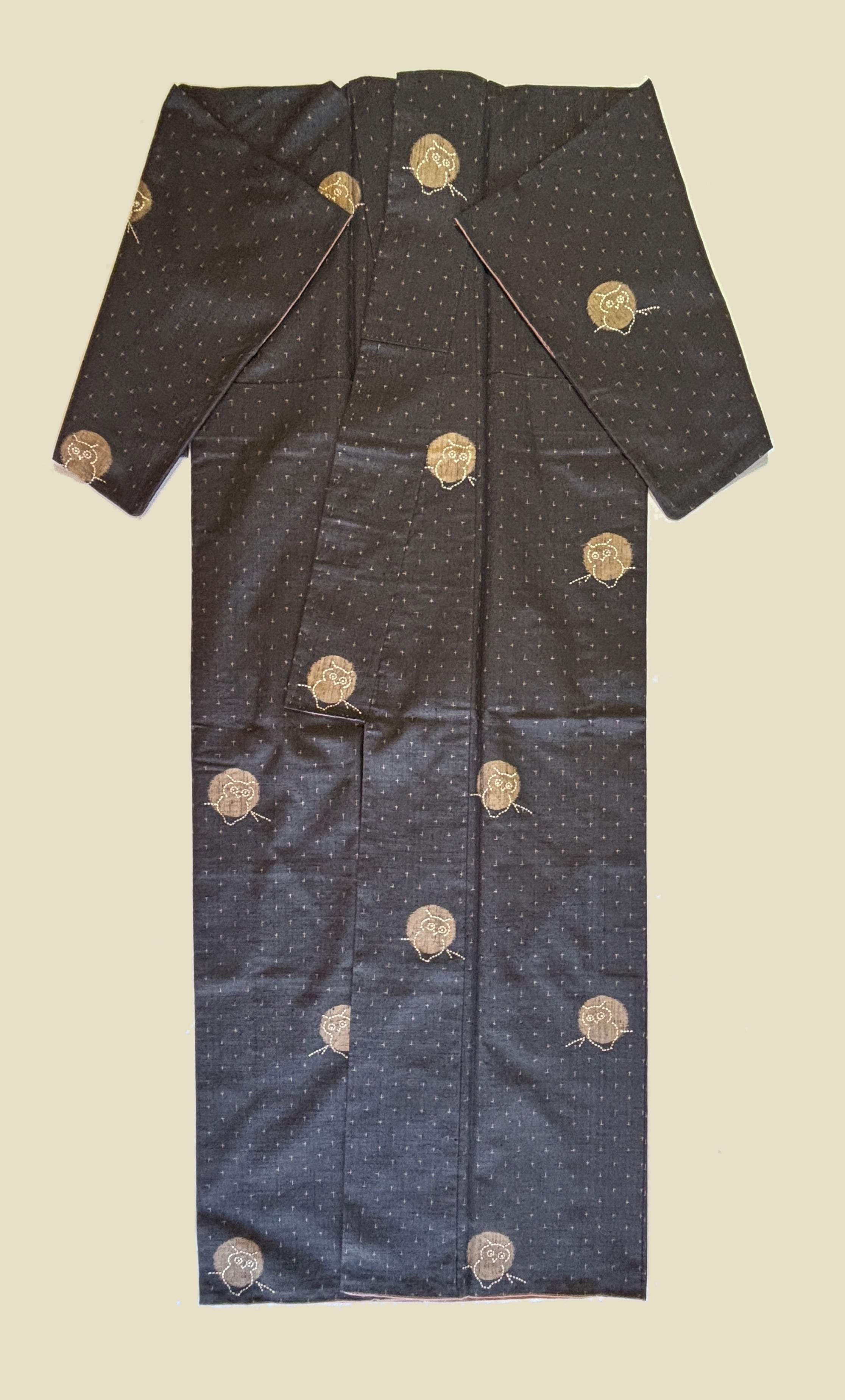 さて目利きしますと、全体に十字絣を織り上げていて、さらに丸場(お月さん)を絣にて織り、ふくろうを刺子で表現しています。