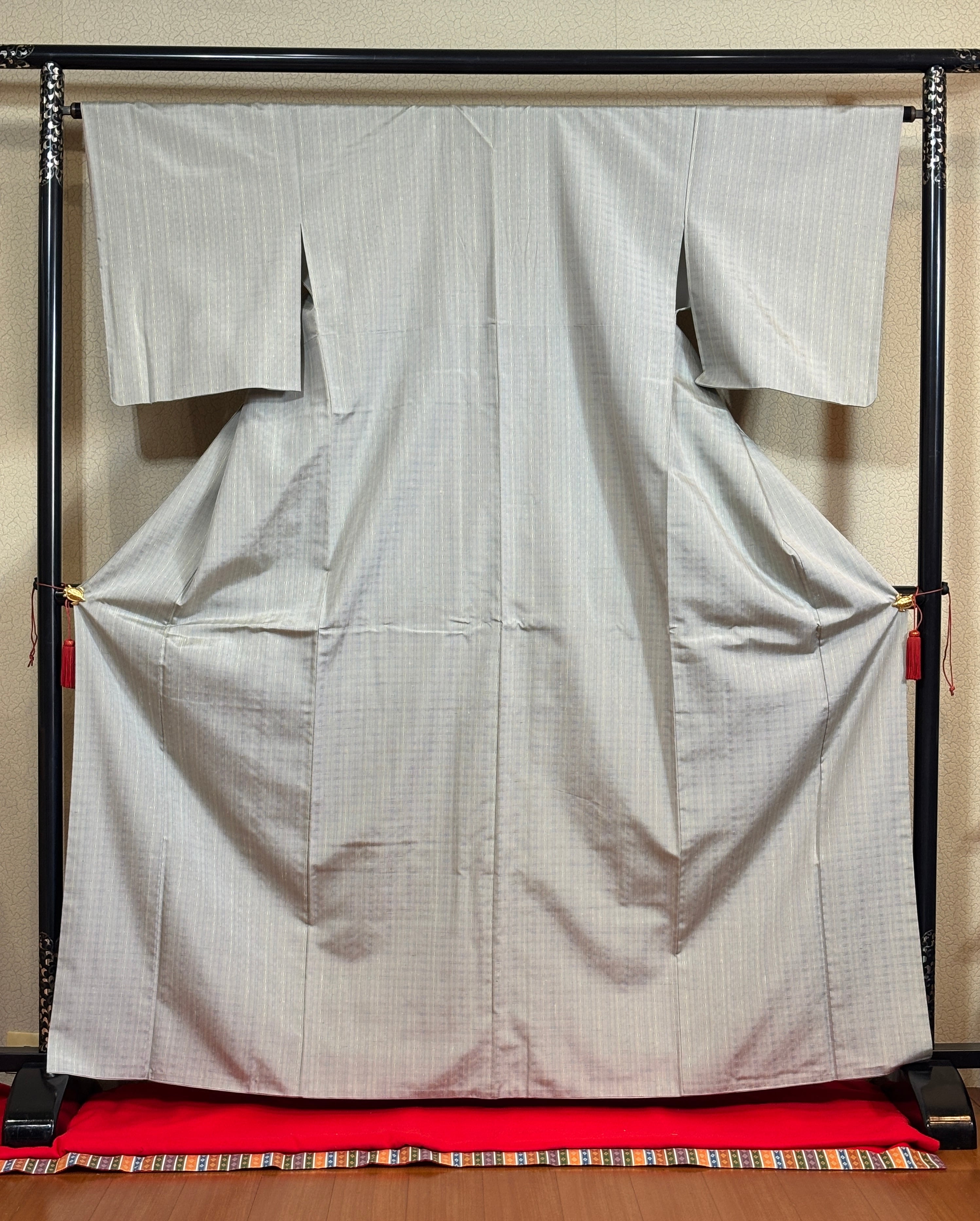 地色も極薄い上品な青磁鼠色系の色合いで、伝統工芸品の良い味が現れている着物です。