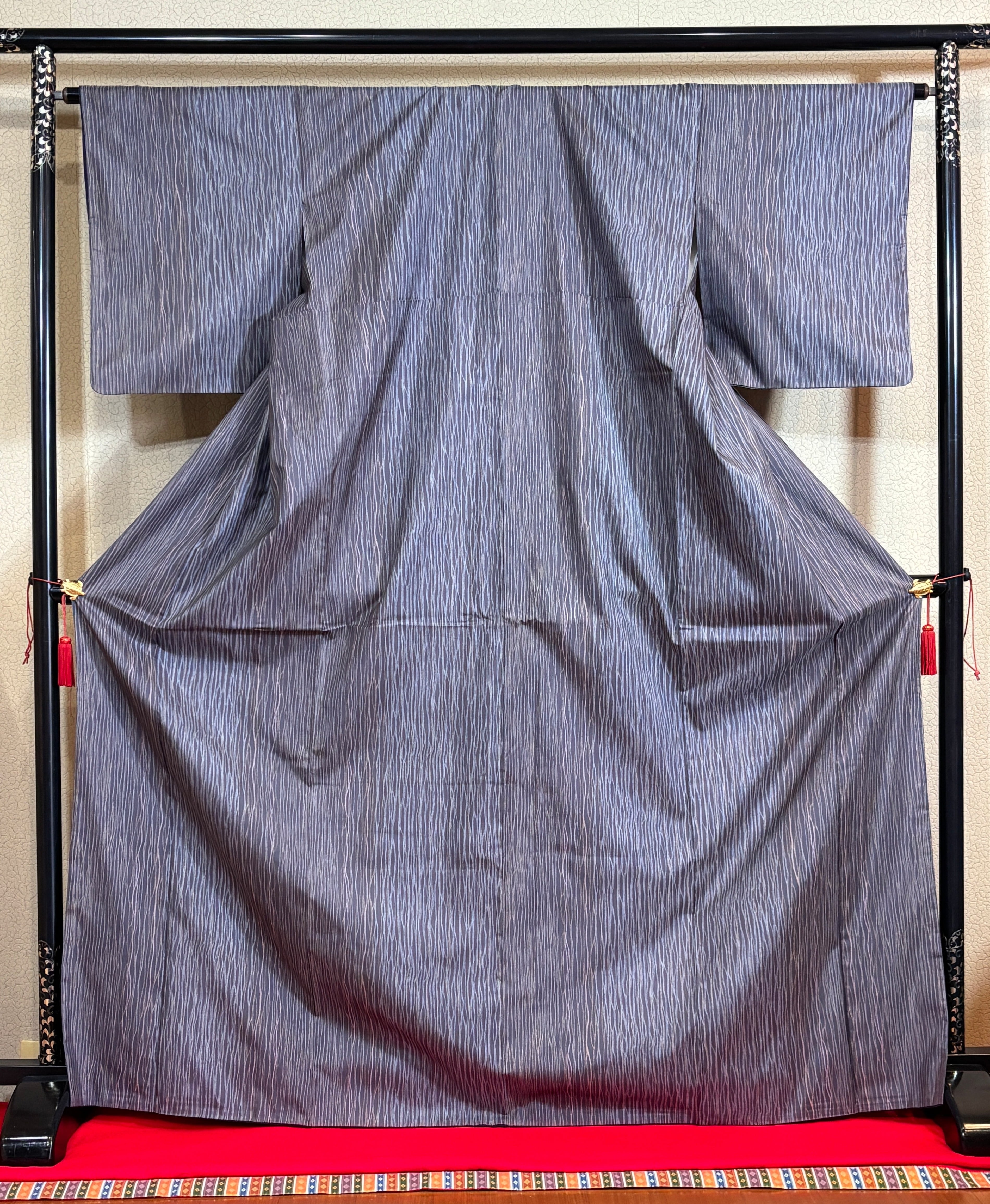 この着物の色合いはローケツ染による雨縞の染め表現のため、光の加減や環境によって色の表情が大きく変わって見えます。