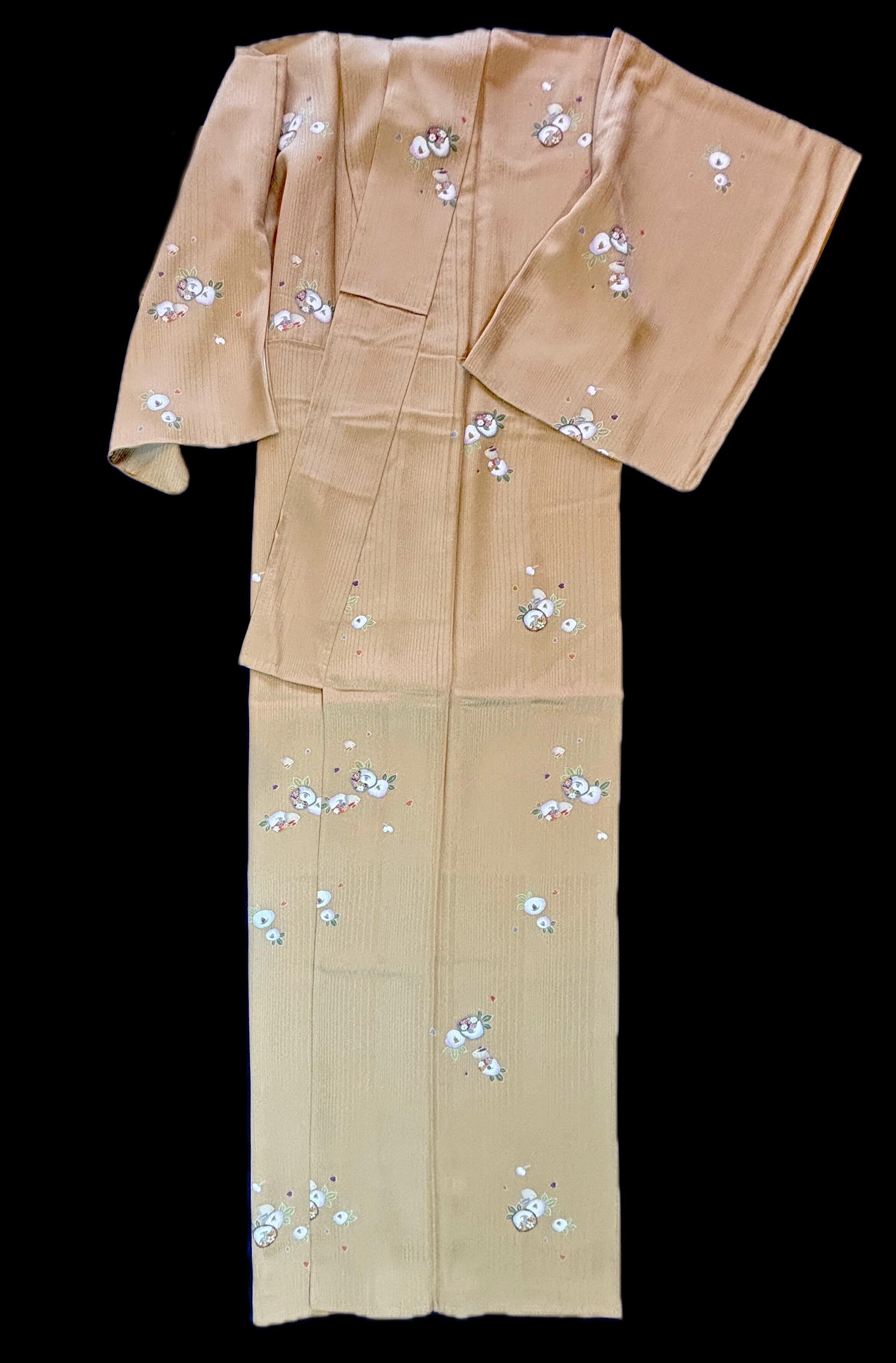 やや渋みを含んだ黄土系の地色に、白や淡紫、草色などのやわらかな配色で文様が描かれ、全体として落ち着きの中に可憐さを感じさせる柄行となっています。