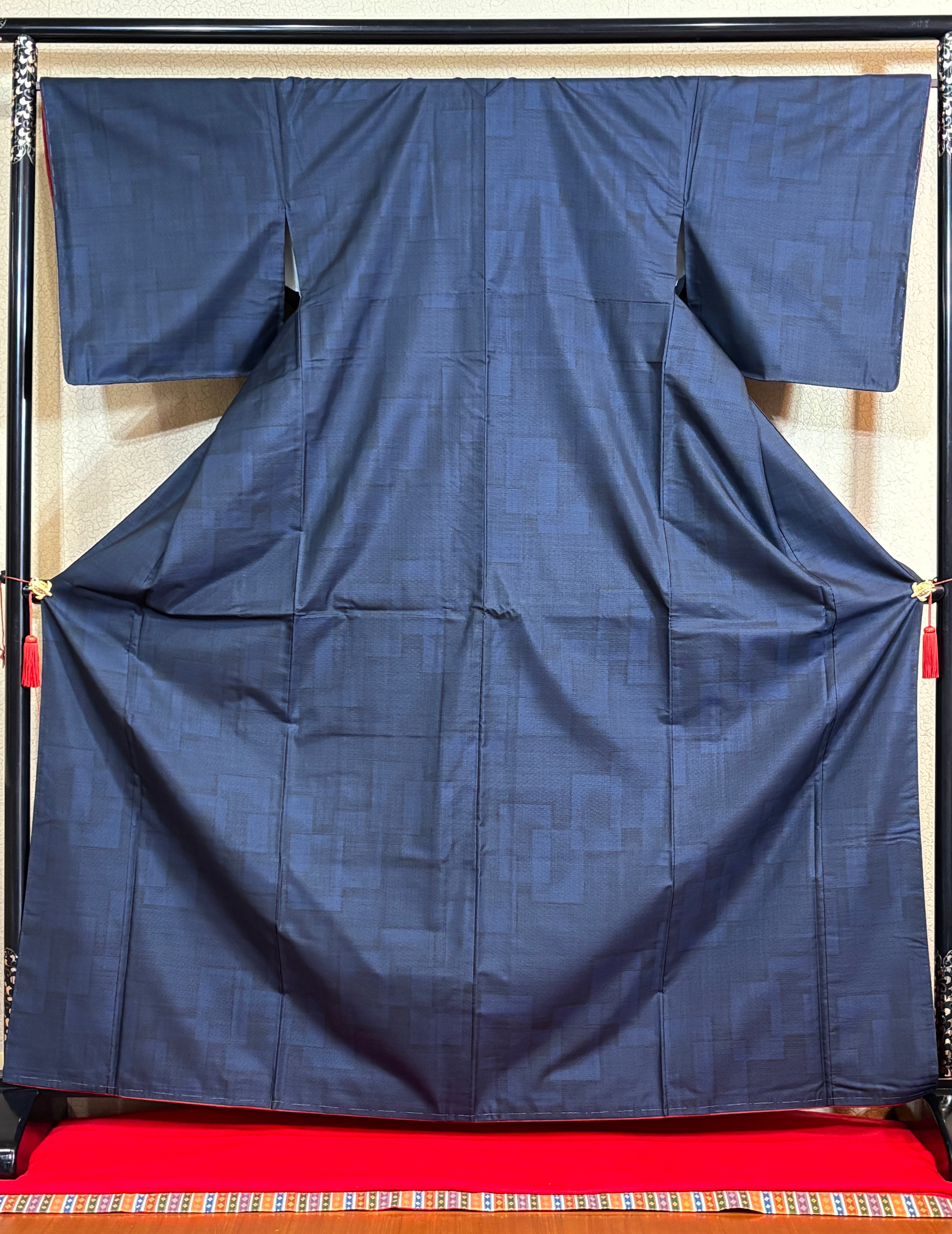 落ち着いた藍色の地に、織りによる幾何調の柄行がさりげなく表されており、無地感覚に近いすっきりとした表情を見せています。