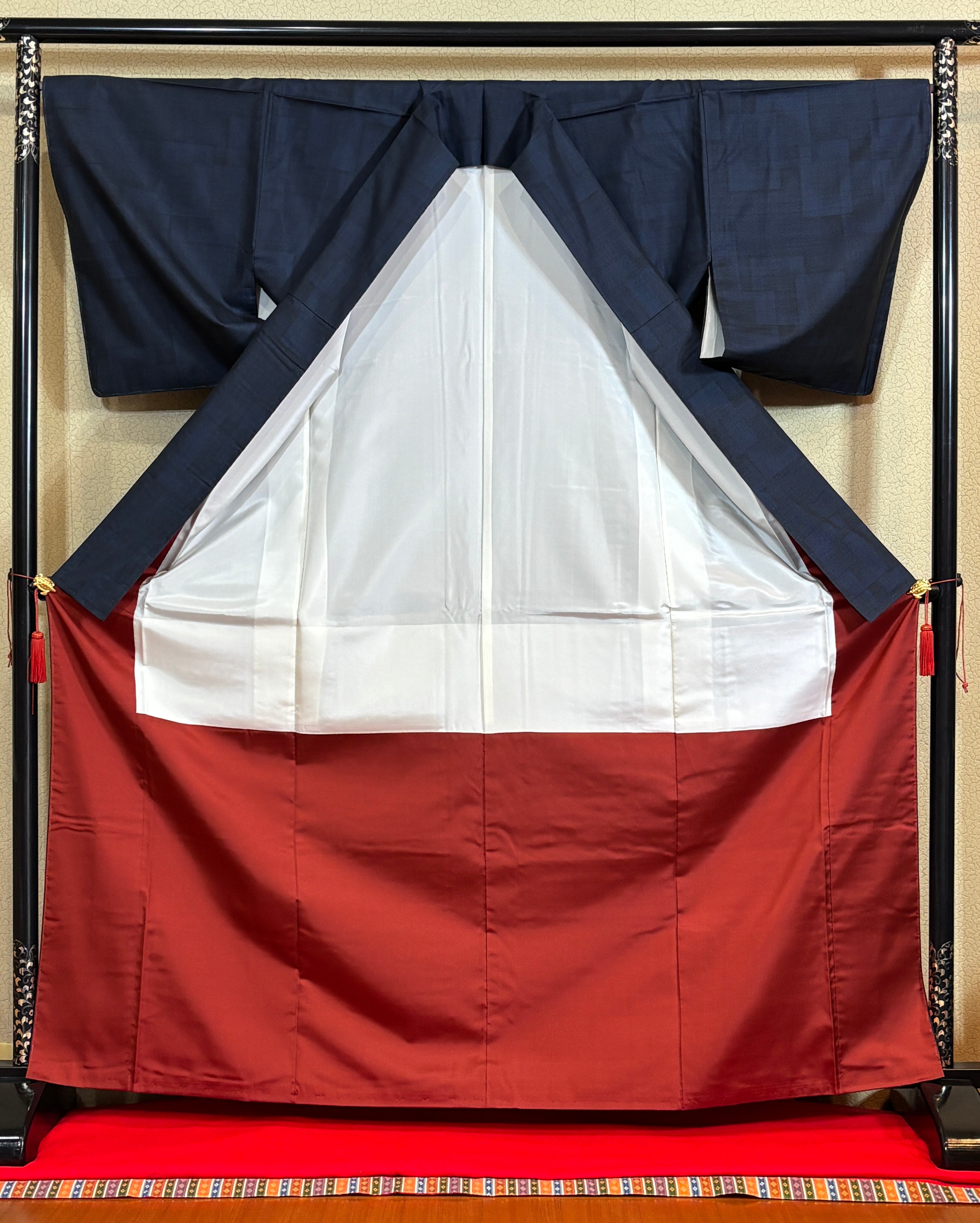 八掛には赤みを帯びた無地八掛が合わせられ、藍地との対比も印象的です。