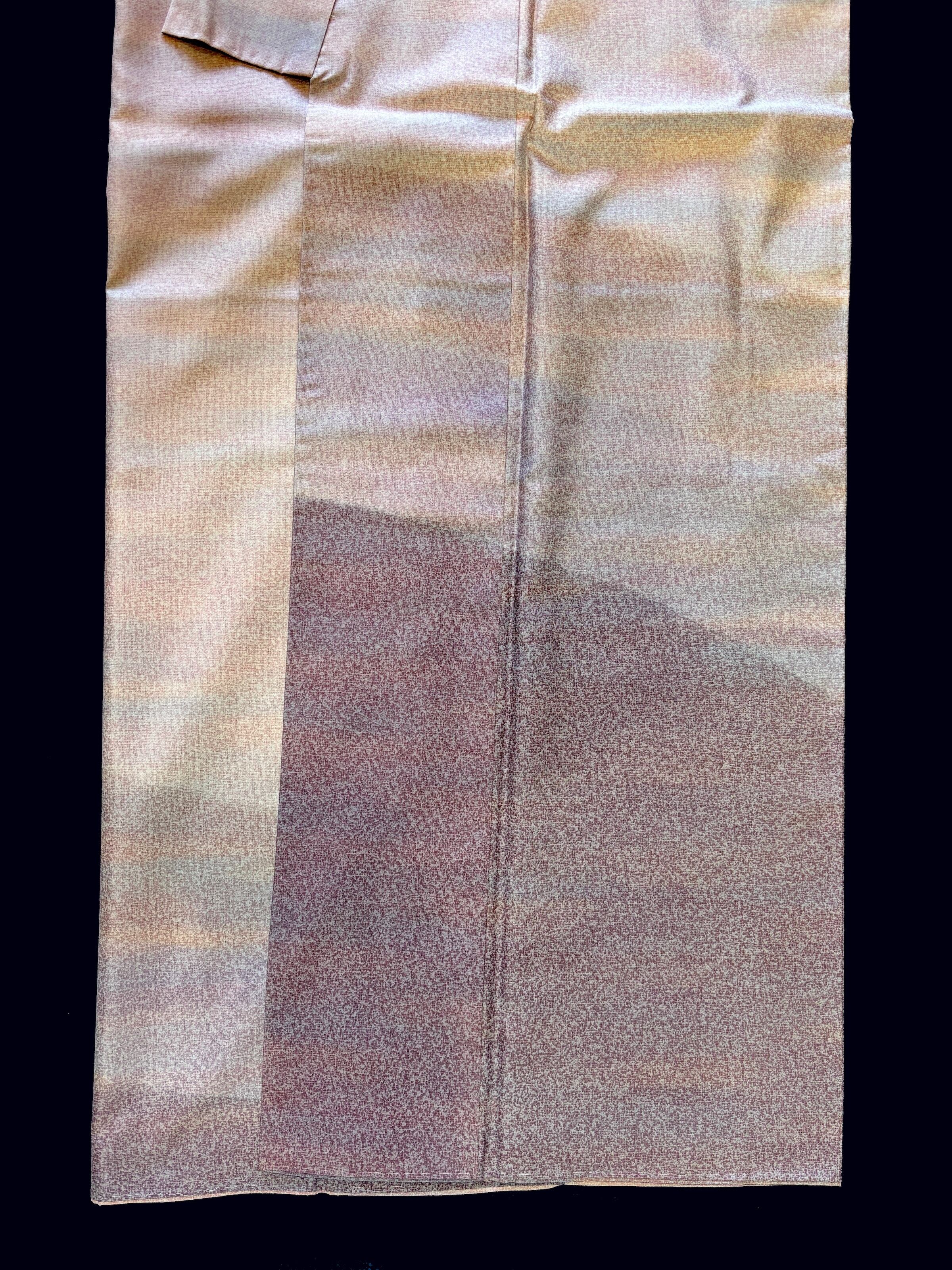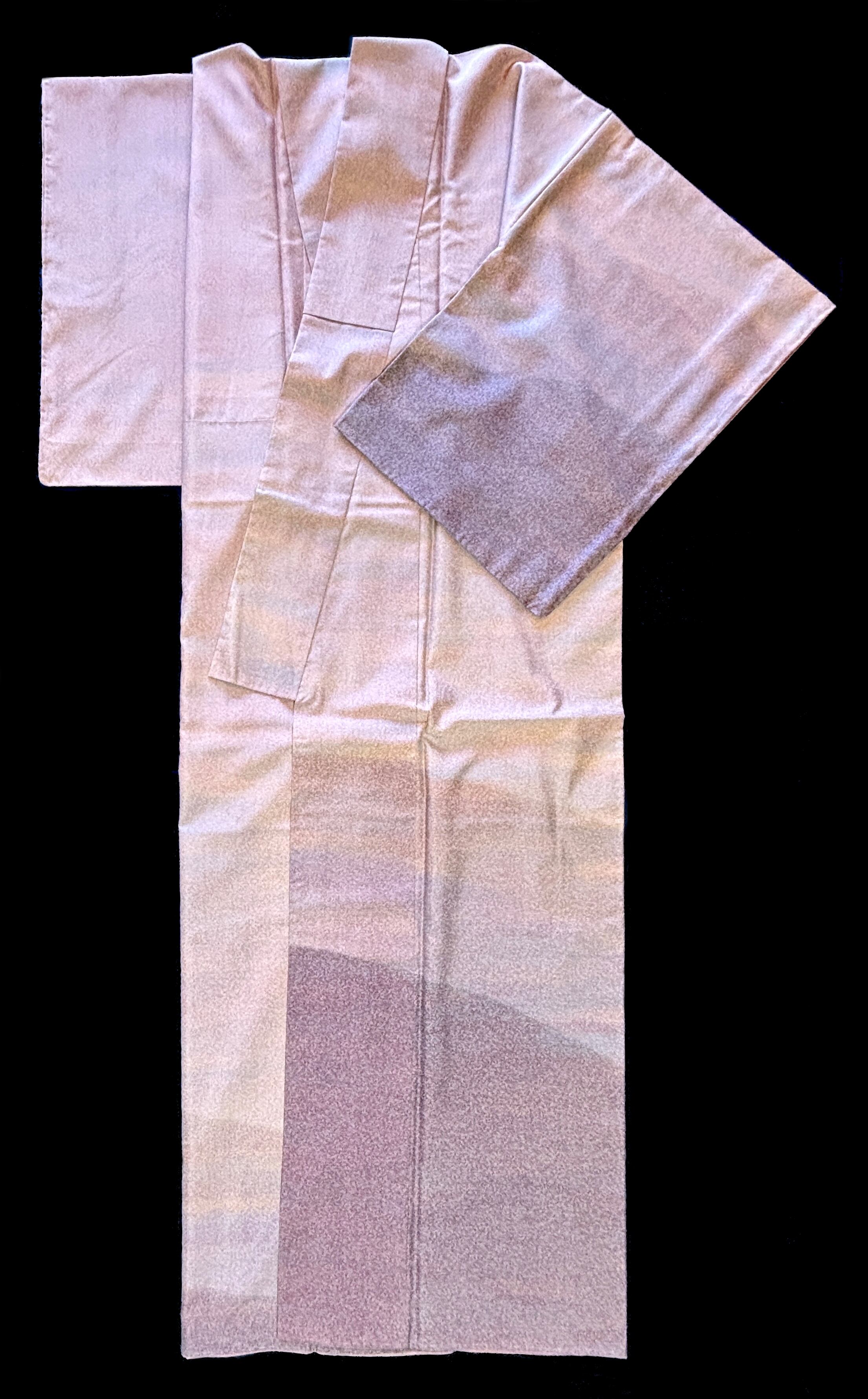 極めて繊細な点描状の染めが地に染み込み、光の加減によって淡い青みや桃色がやわらかく揺らぎ、裾に向かって濃淡が静かに深まり、全体を引き締める構成となっております。
