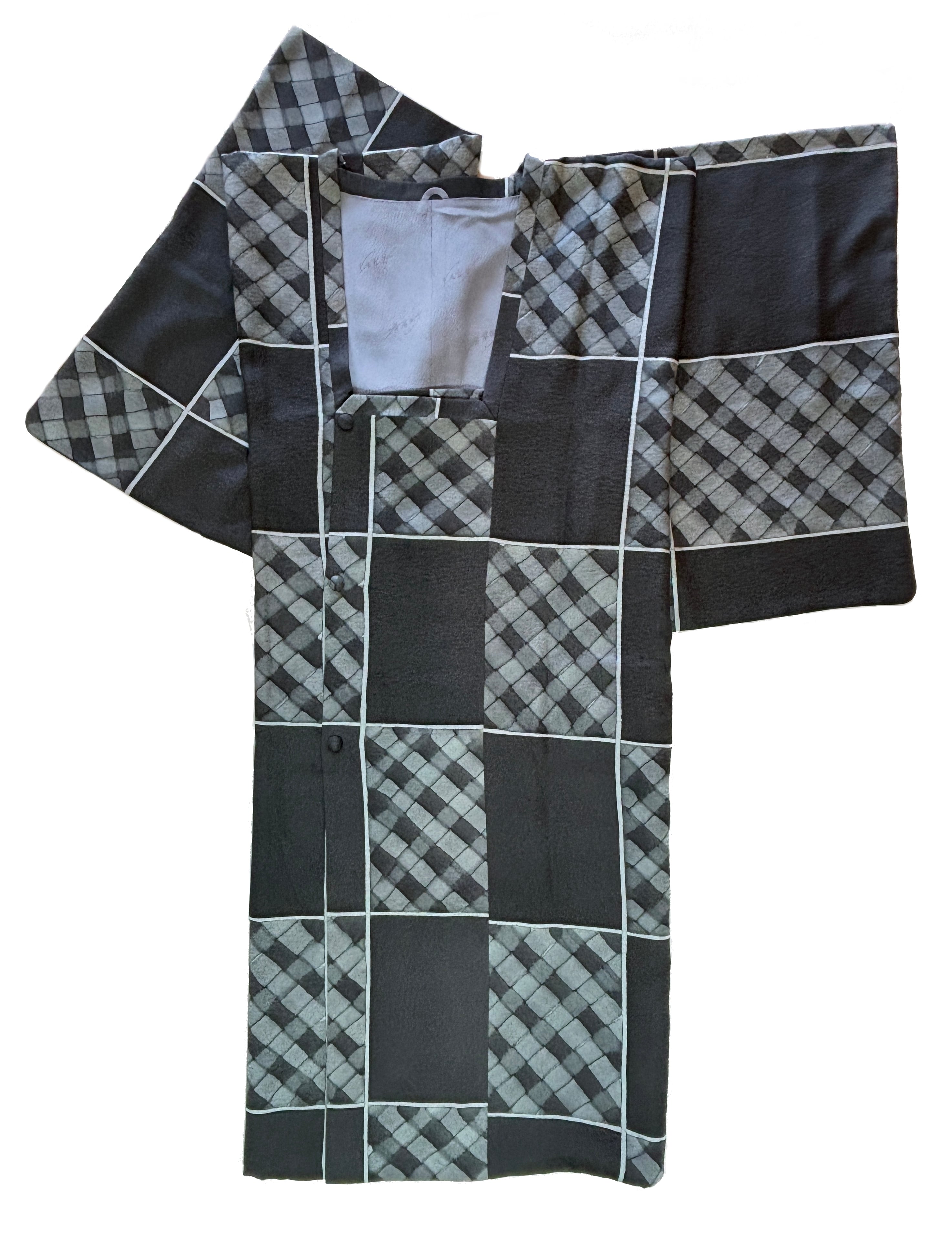濃淡の墨色を基調とした市松状の構図は、静かな存在感と洗練された都会的印象を併せ持ち、斉藤三才らしい意匠美が感じられます。