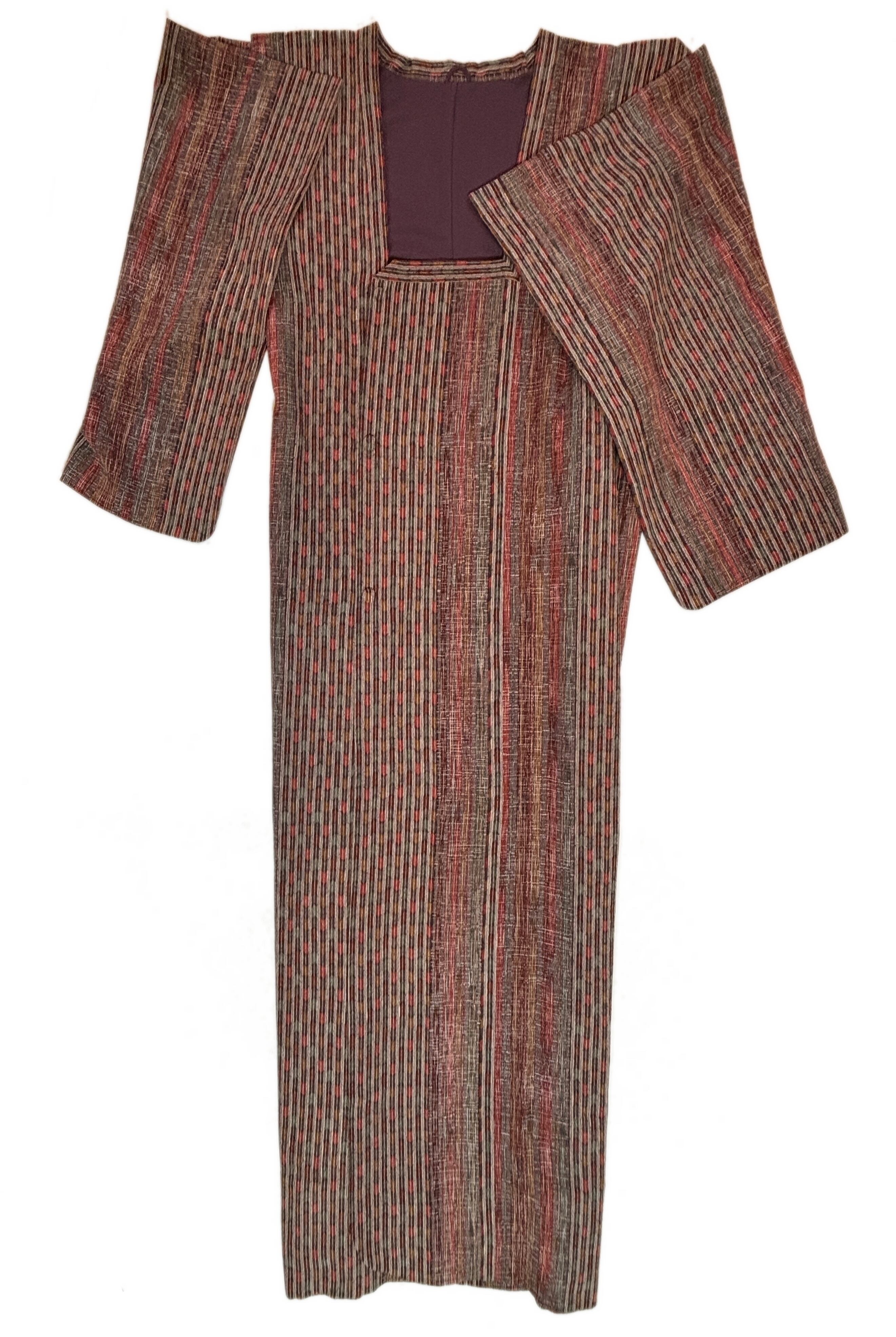 多色を重ねた縦段構成に、擦り染め特有の掠れと滲みを活かしたロング丈の袷コートです。