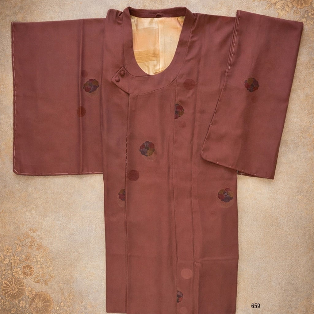 光沢のある綾子生地に、深みのある葡萄色を引き染めにて染め上げ、丸の中に意匠化した梅花文を配した変わり衿コートです。