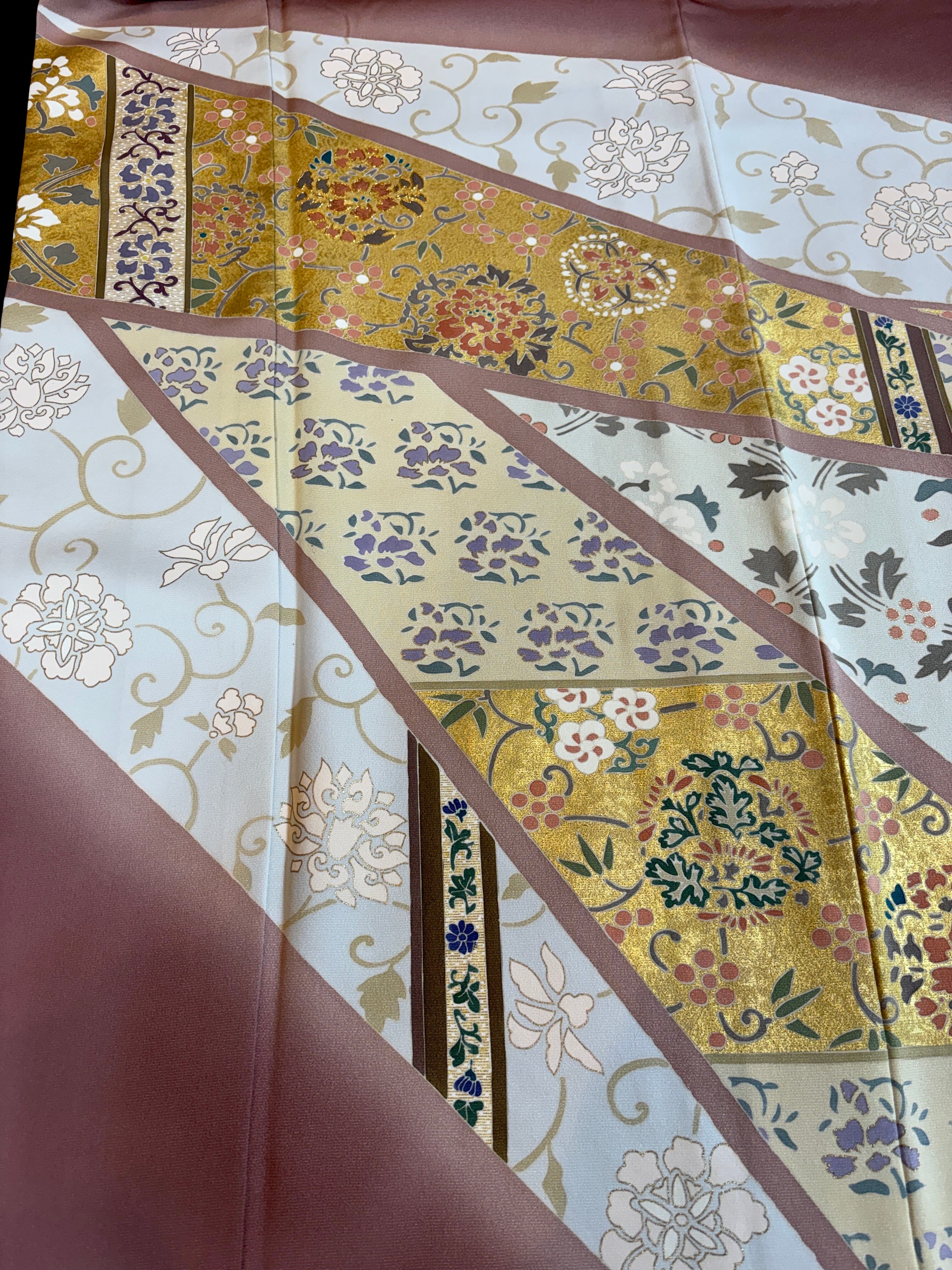 王道の本友禅に加え、金加工・金駒刺繍・色糸刺繍を巧みに用い、