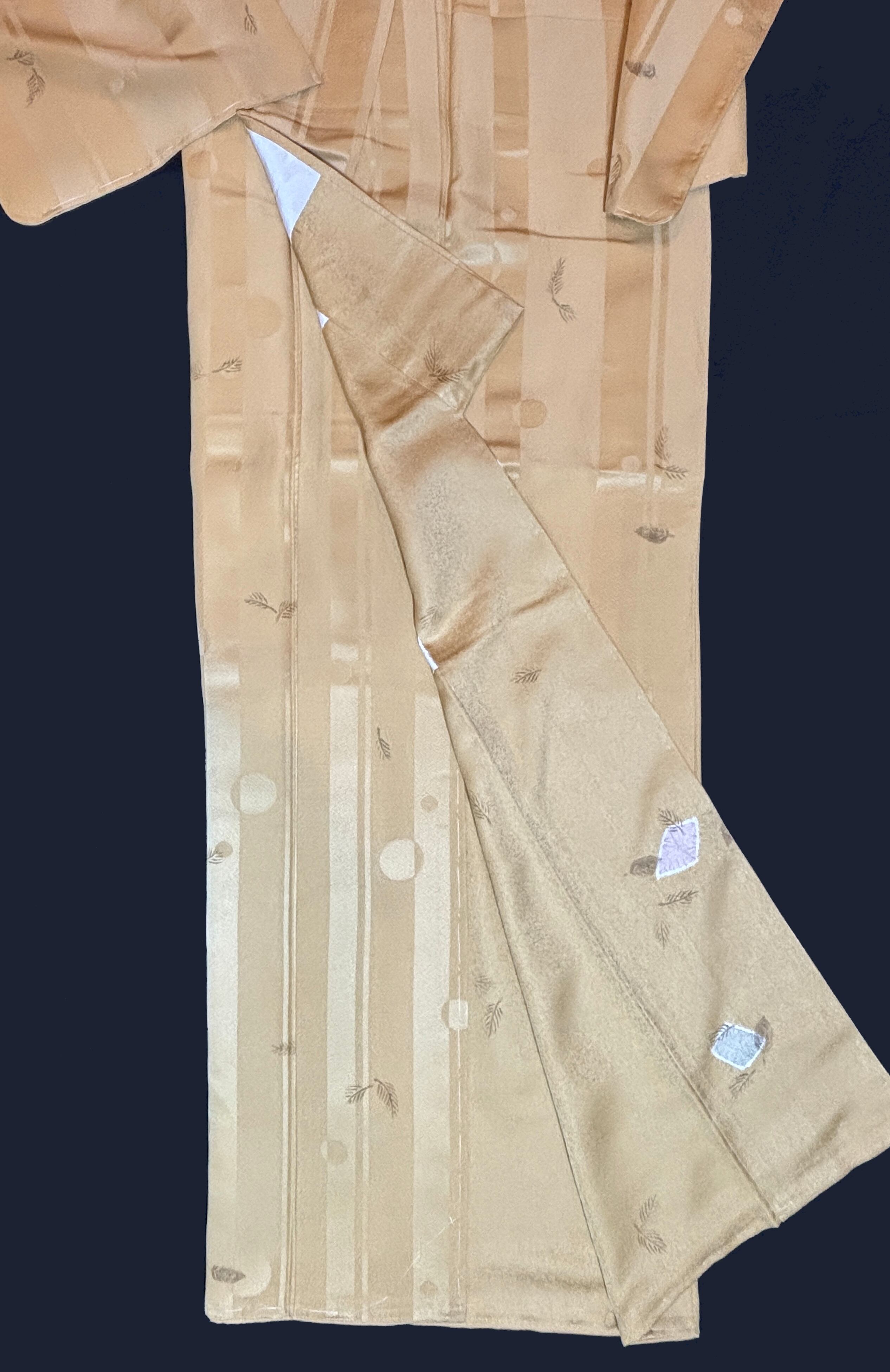 紋意匠綾子地(竹に水玉の地紋)を用い、金糸雀色の地に絞り枠による色紙重ねを染め表し、ところどころに木の葉を添えた意匠の着物です。