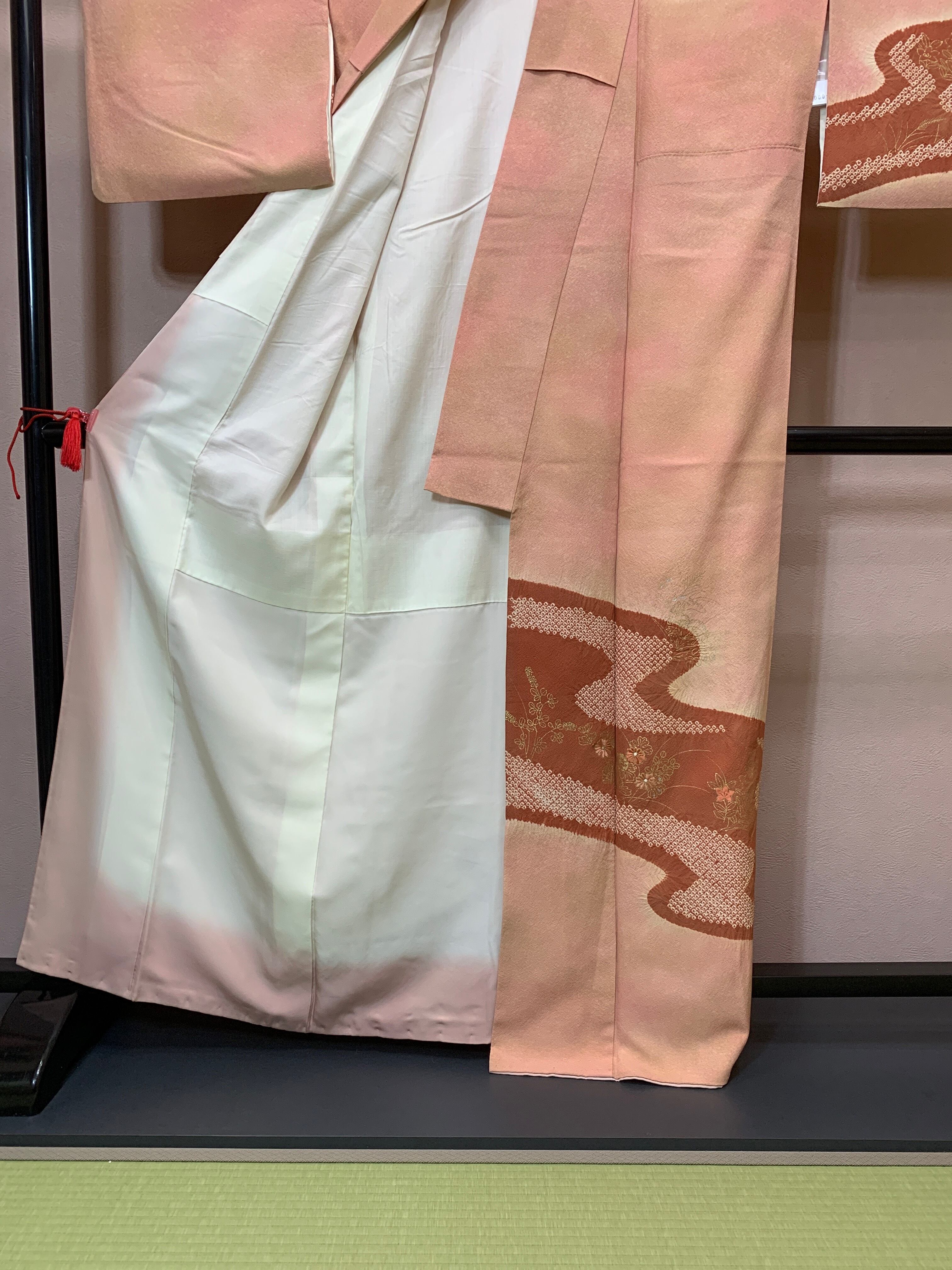 絞り染めの表情、金泥描きの繊細さ、手刺繍のやさしい華やぎが重なり、控えめながらも品格ある装いを演出します。