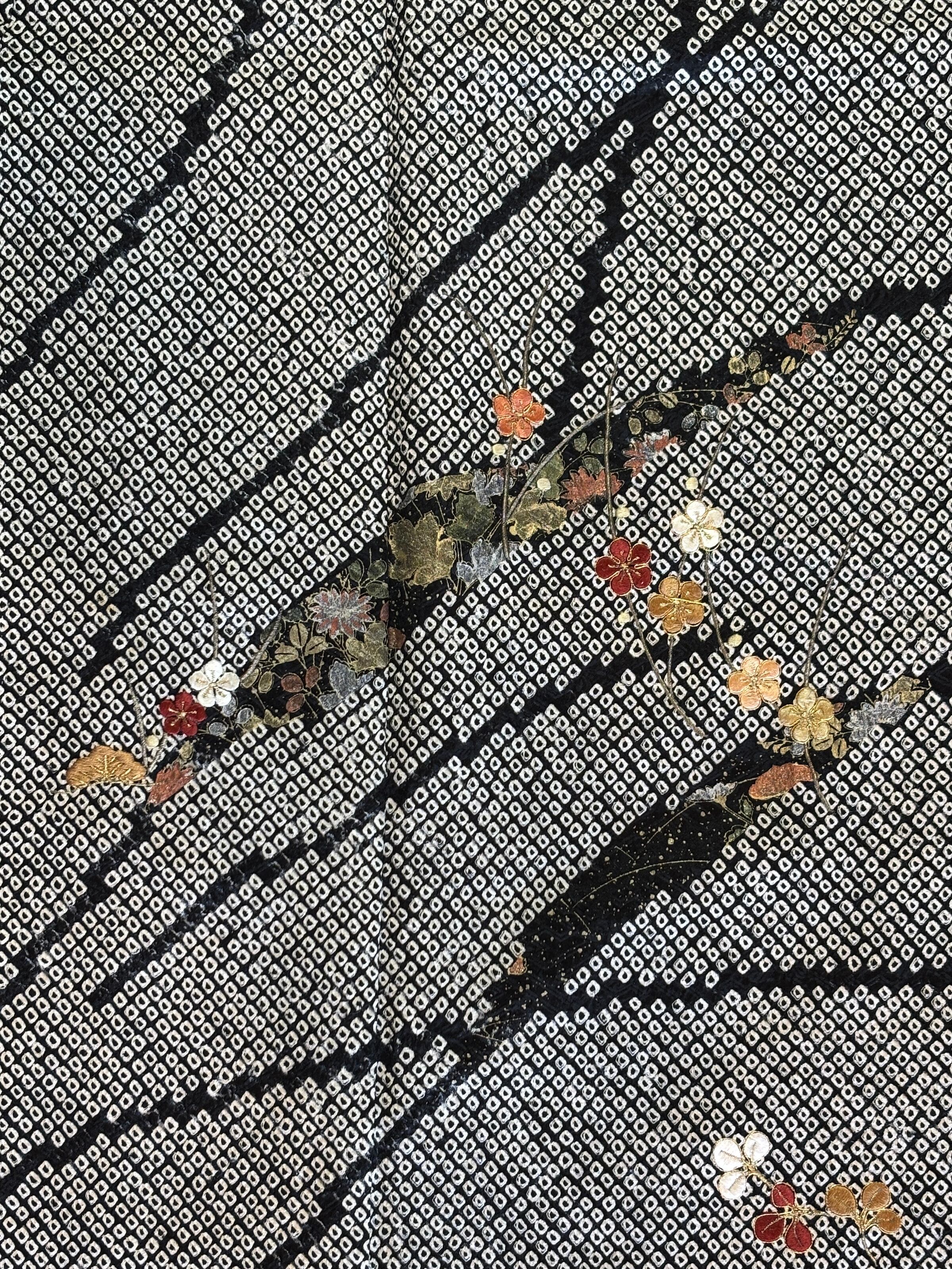 通常の柄構図とは違って本疋田絞りで絵羽柄を逆に表て、刺繍と金泥描きで花を仕上げています。