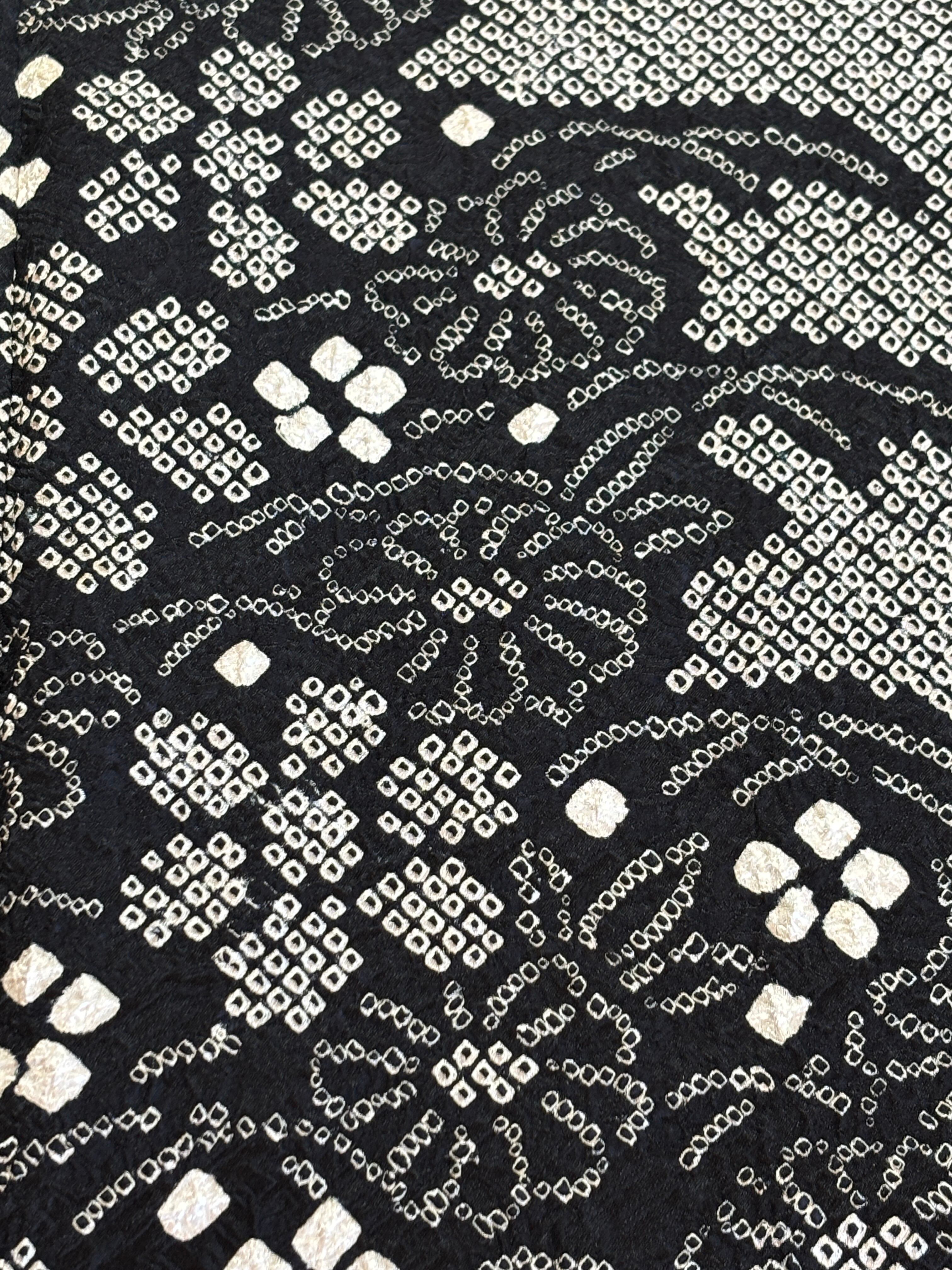 全面に細やかな本疋田を配し、流水端の花文様で大胆に切り替えた意匠は、総絞りならではの迫力と格を備えています。