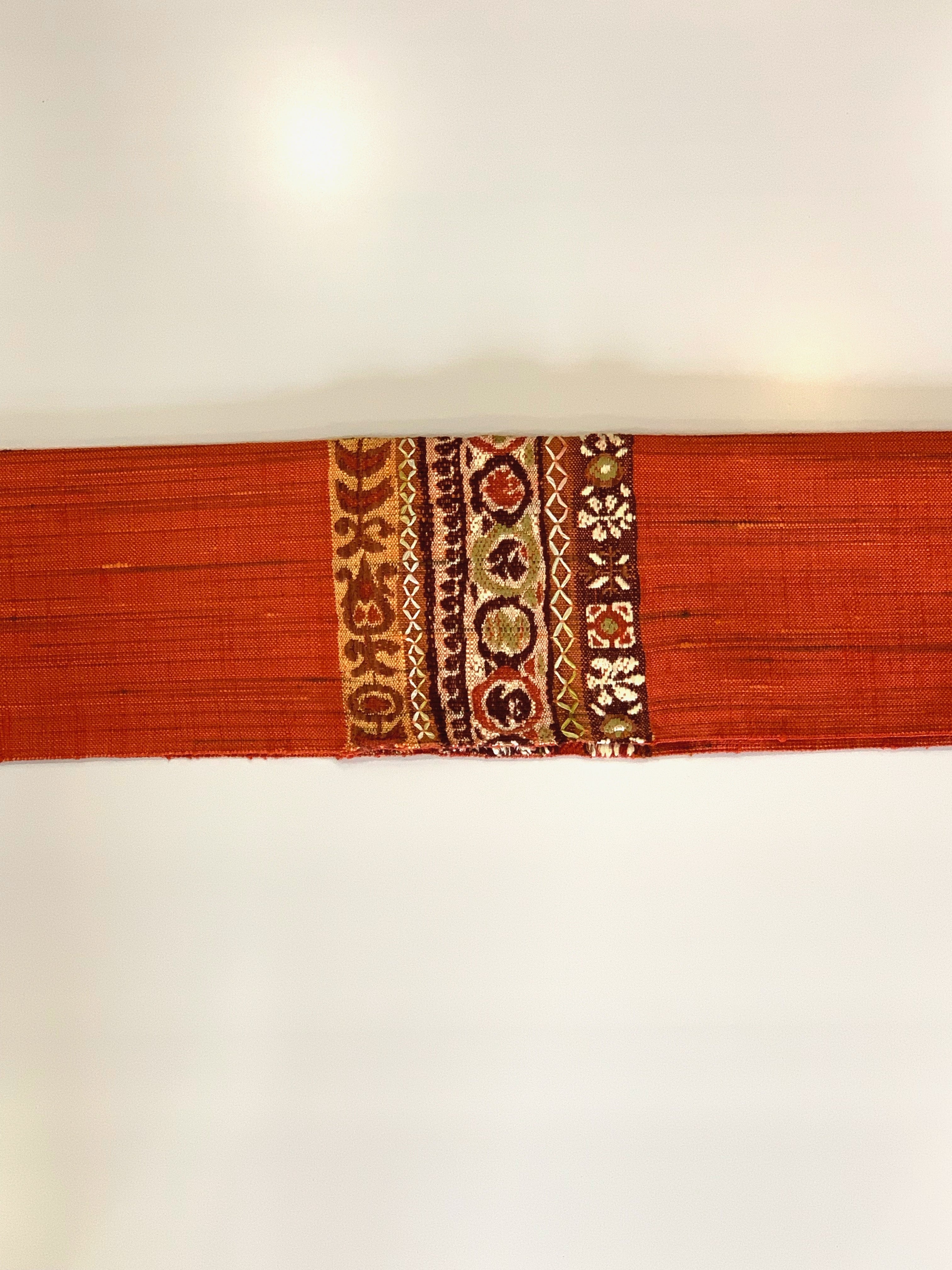 経緯ともに紡いだ節が特徴に織り上げられ、赤茶地色に横段のインド唐草柄も手織りの風合いが現れていてモダンです。