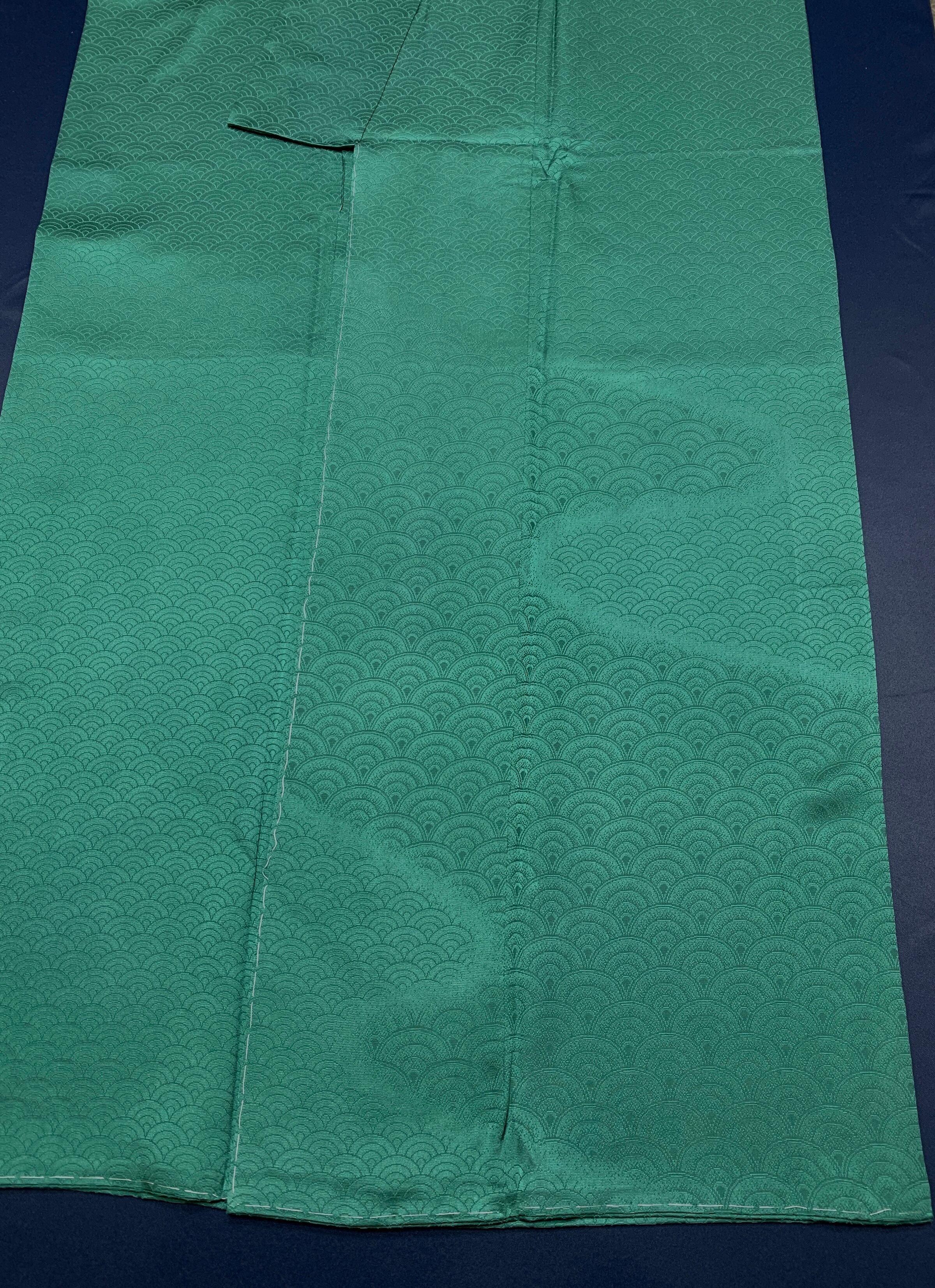 青海波文を附下調に綾子織で表した白生地を、やわらかな青緑系に別染めした袷きものです。