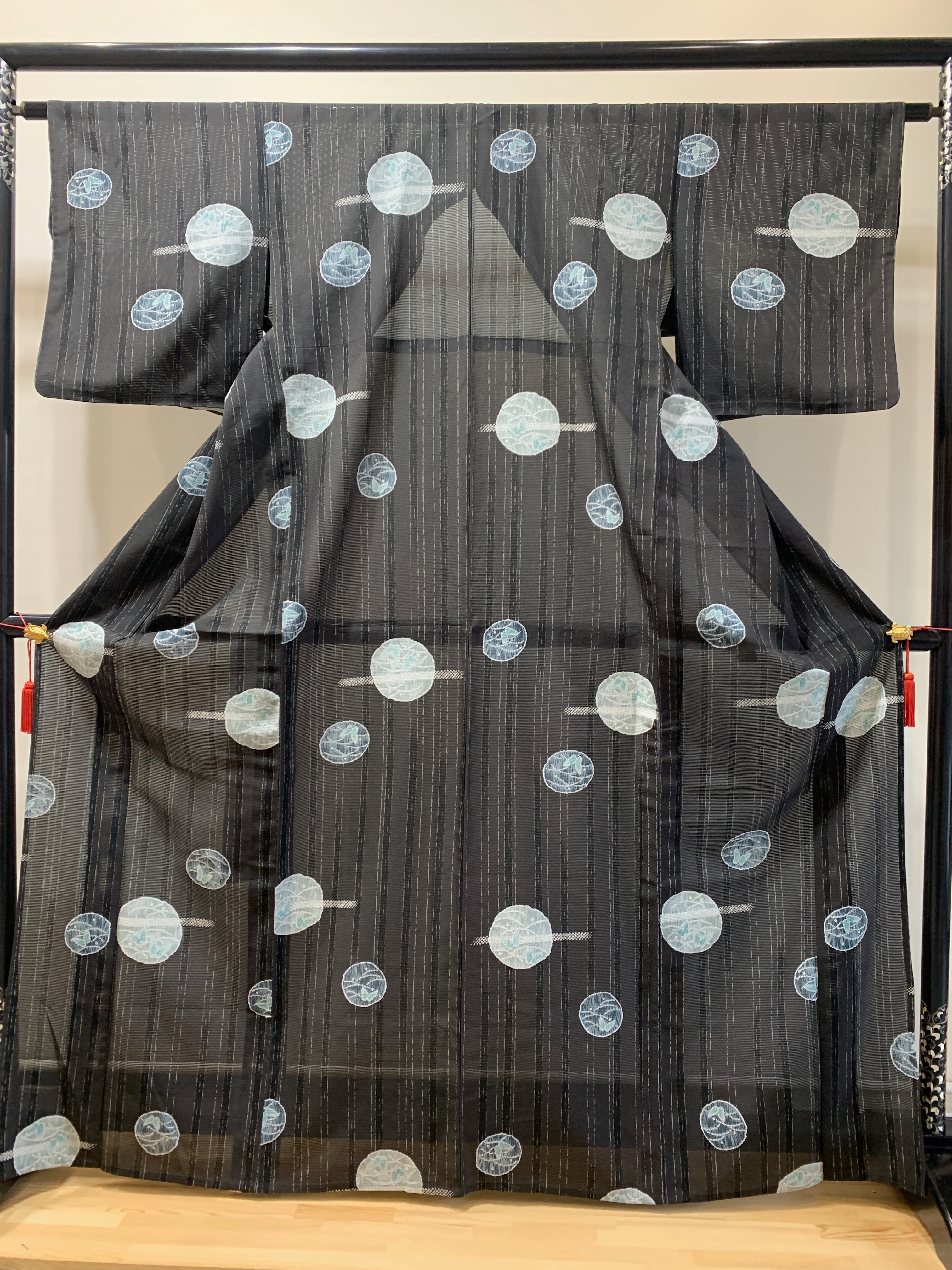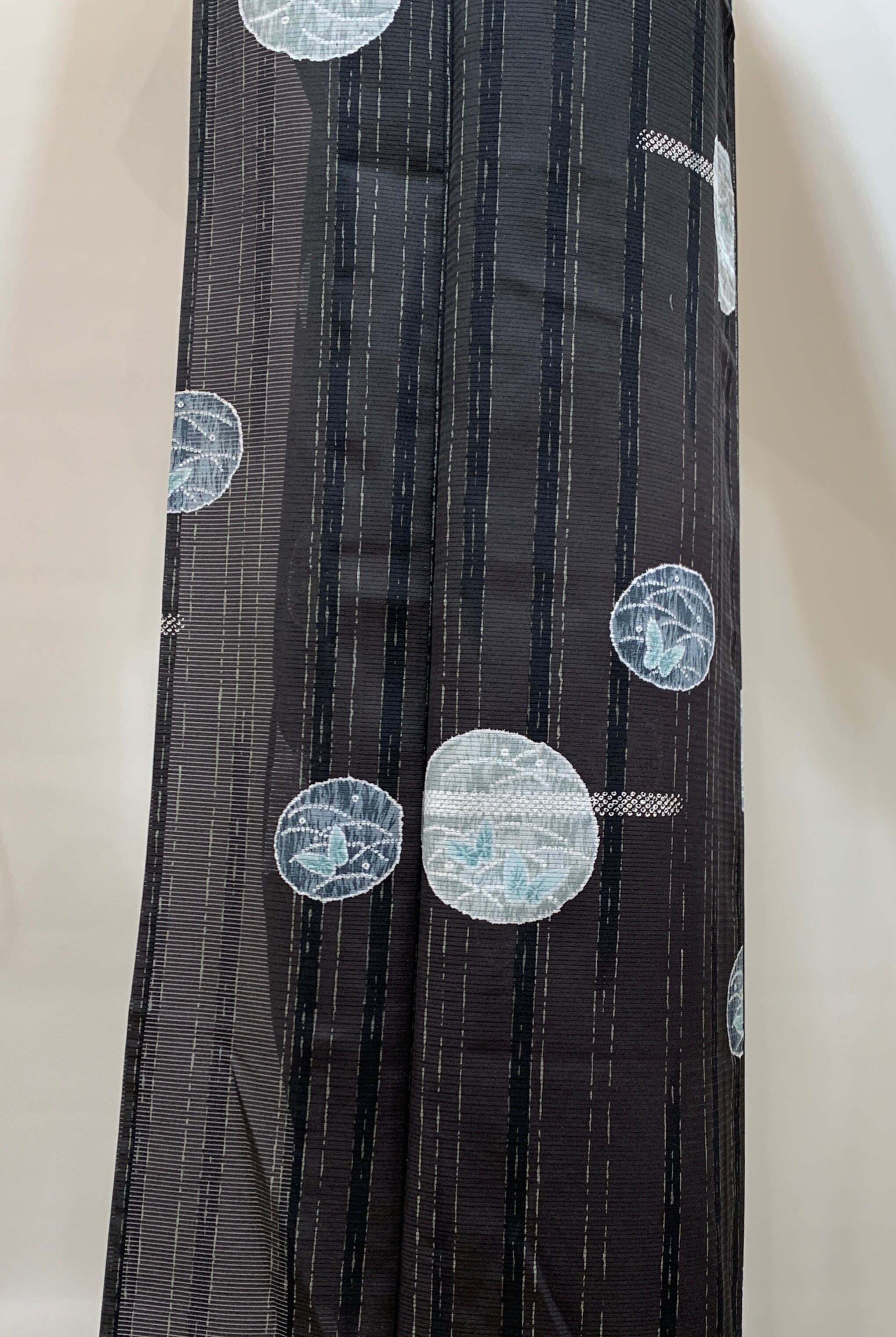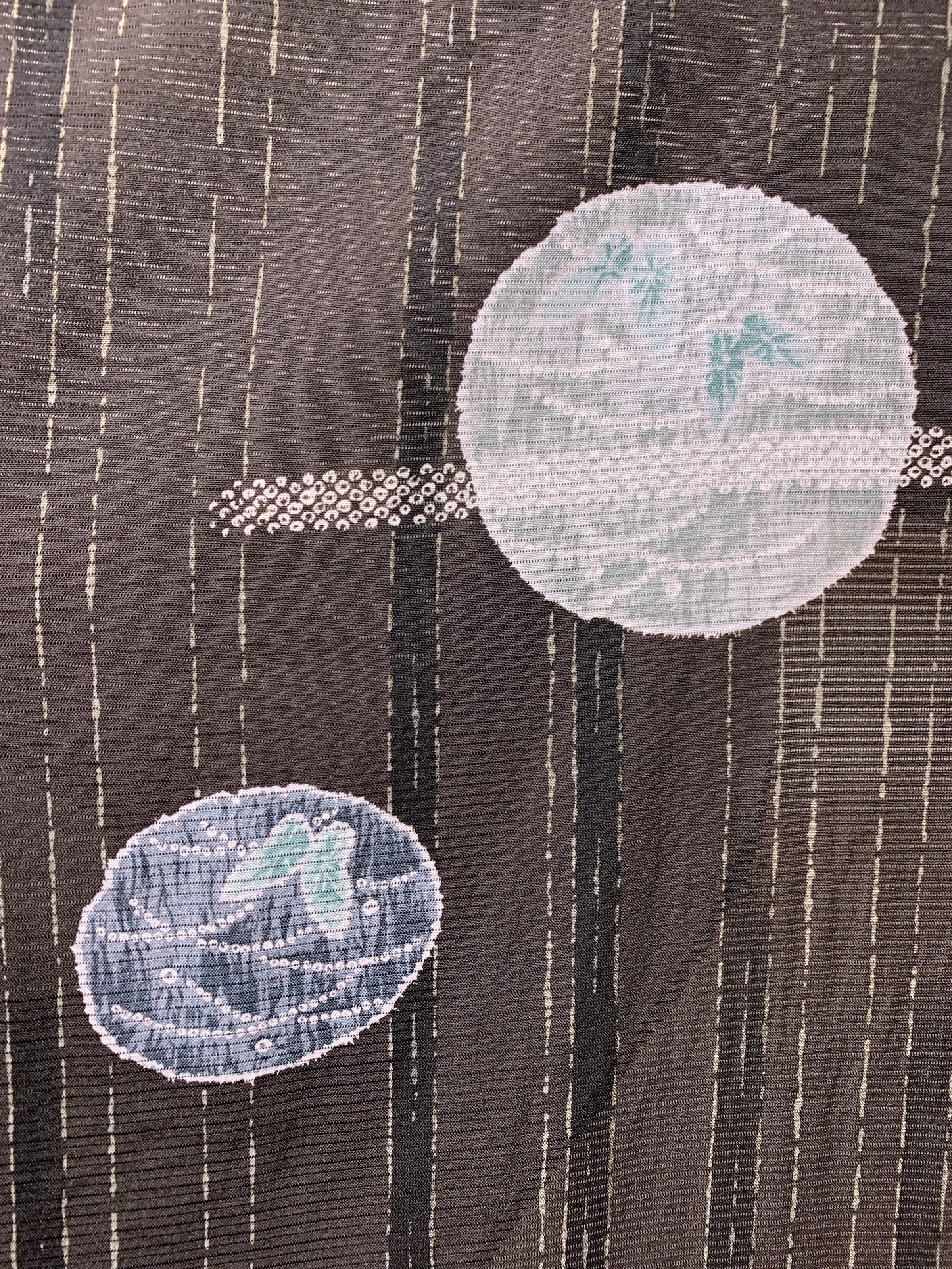 撮影では黒褐色から濃紺のように地色が写っていますが、実際の地色は焦げ茶地に黒の太線、細いグレイの途切れ線を縦に、そして絞り模様の丸紋(中には露芝に蝶)を飛び柄として配置しています。