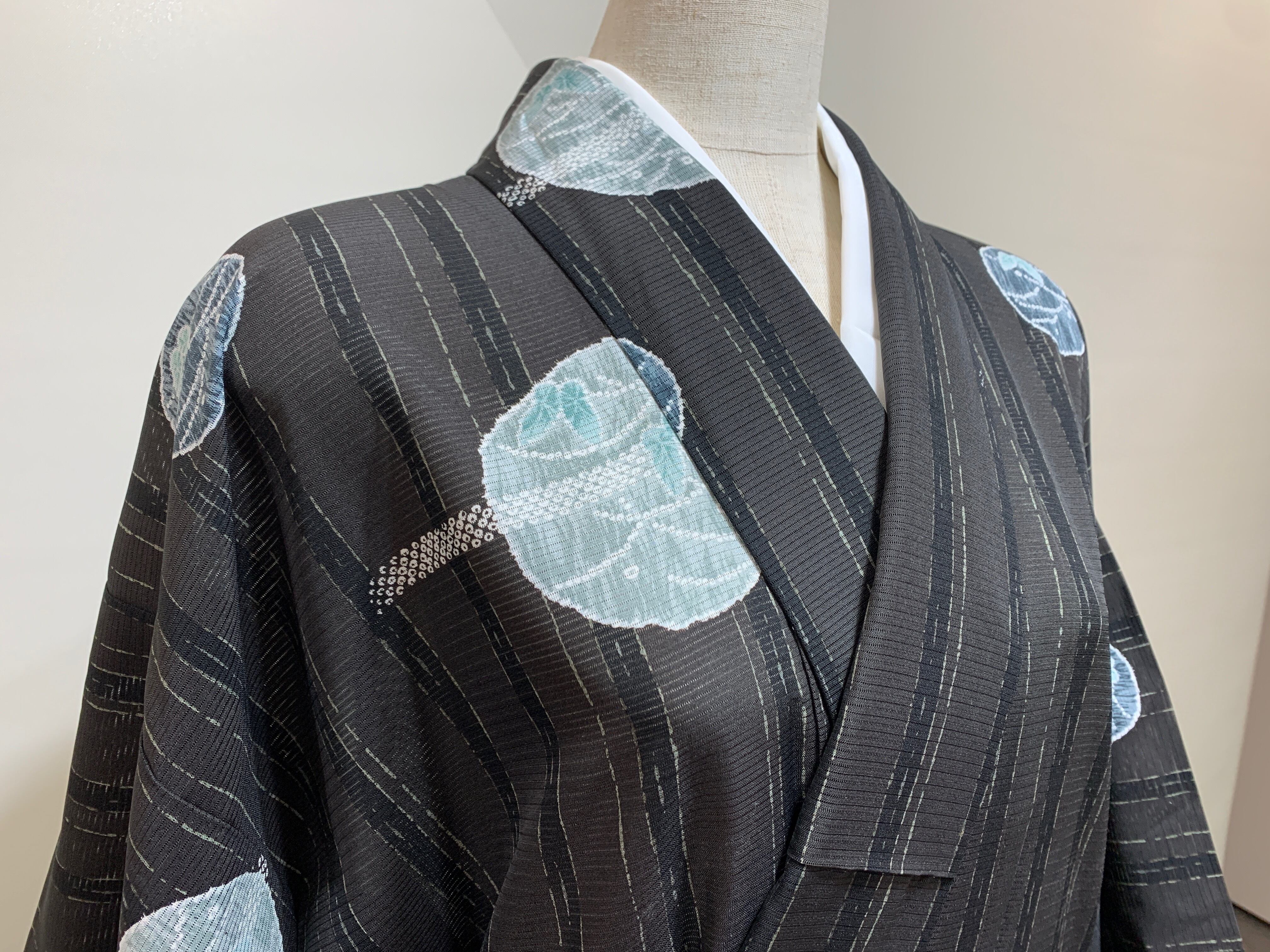 表地ポリエステルの洗える着物で、百貨店でのディスプレイ品です。