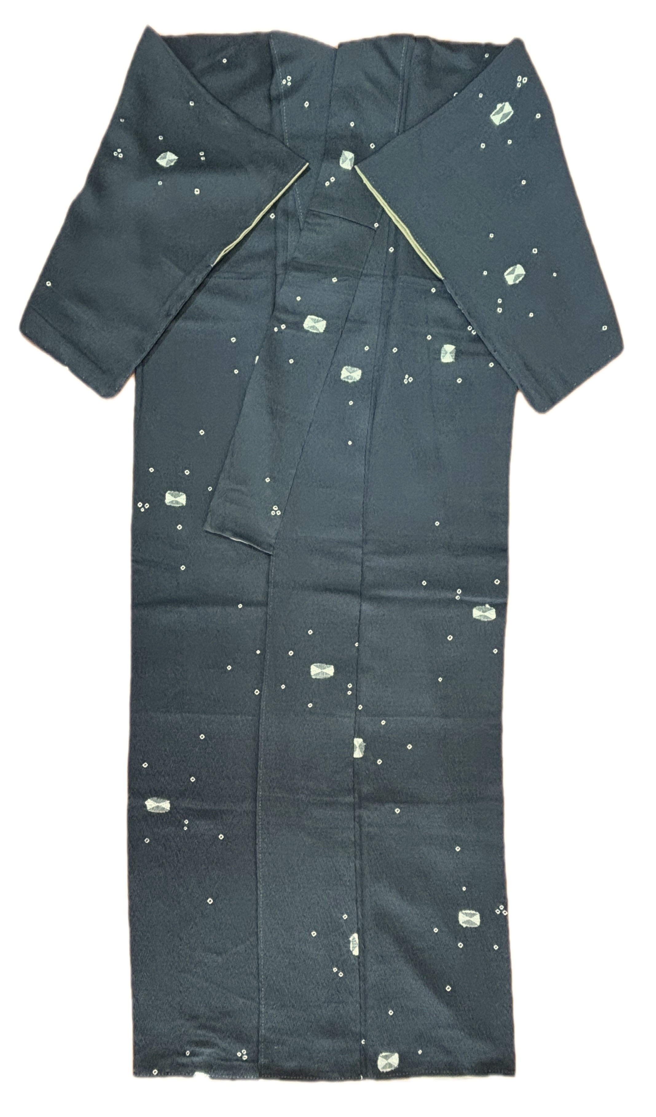 立枠に波状の地紋を織り上げた生地に、手絞りを駆使して包み柄を表した可愛らしい小紋柄です。