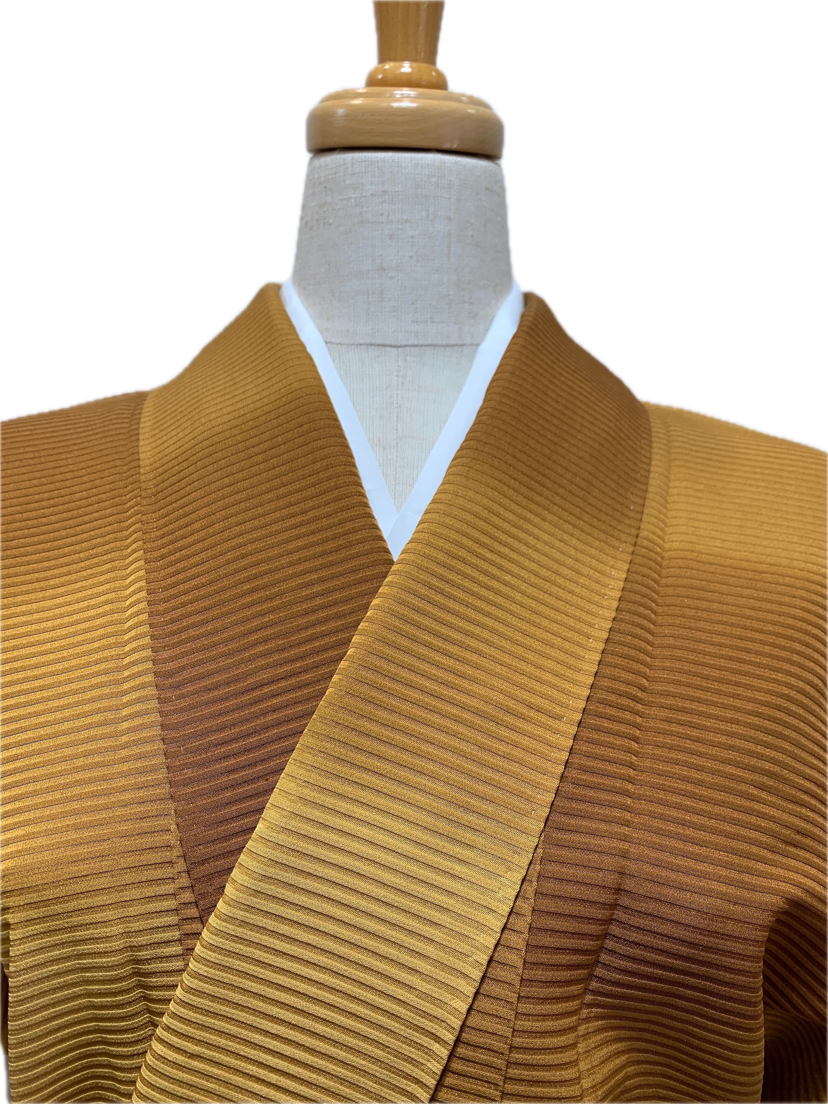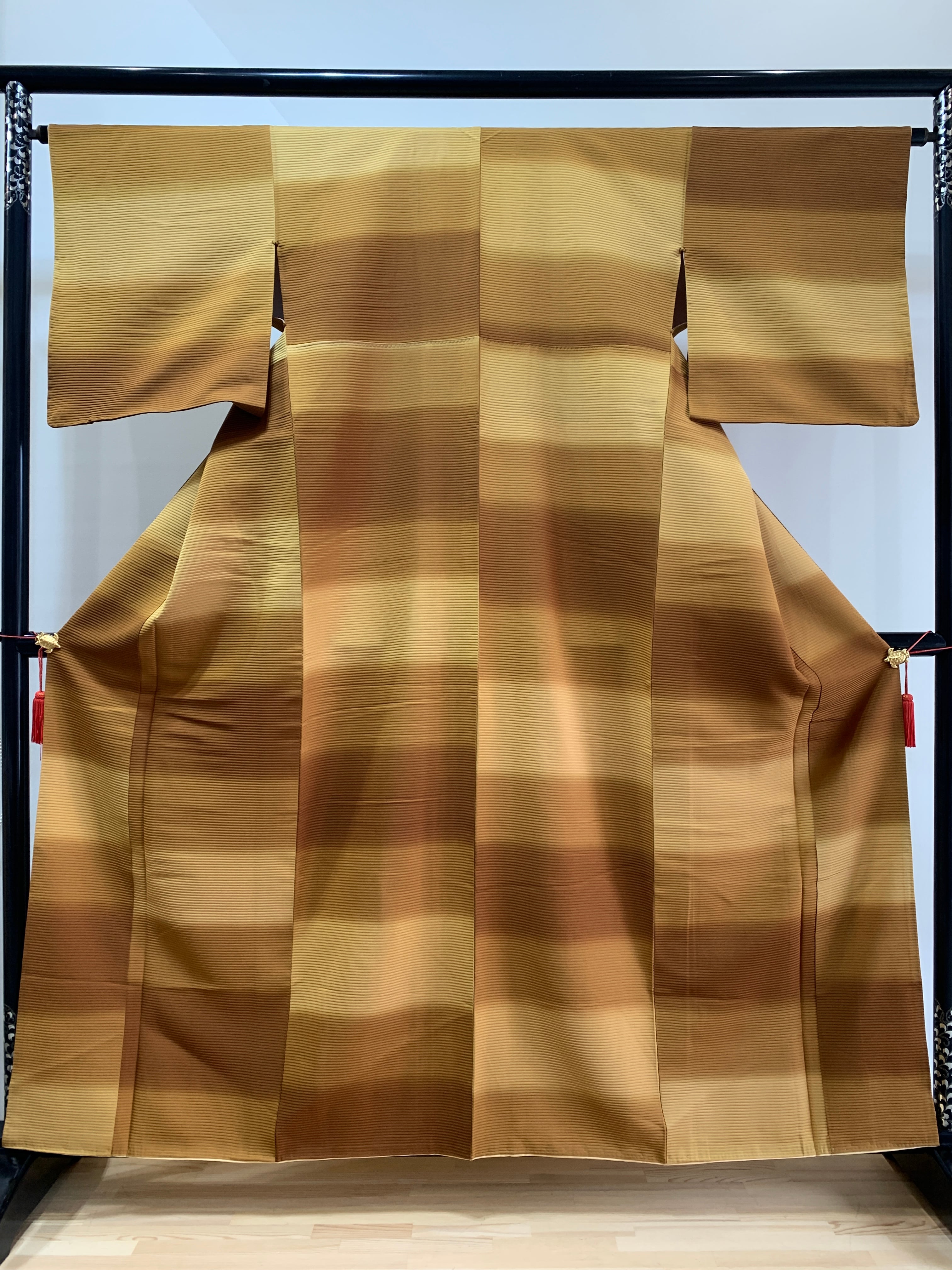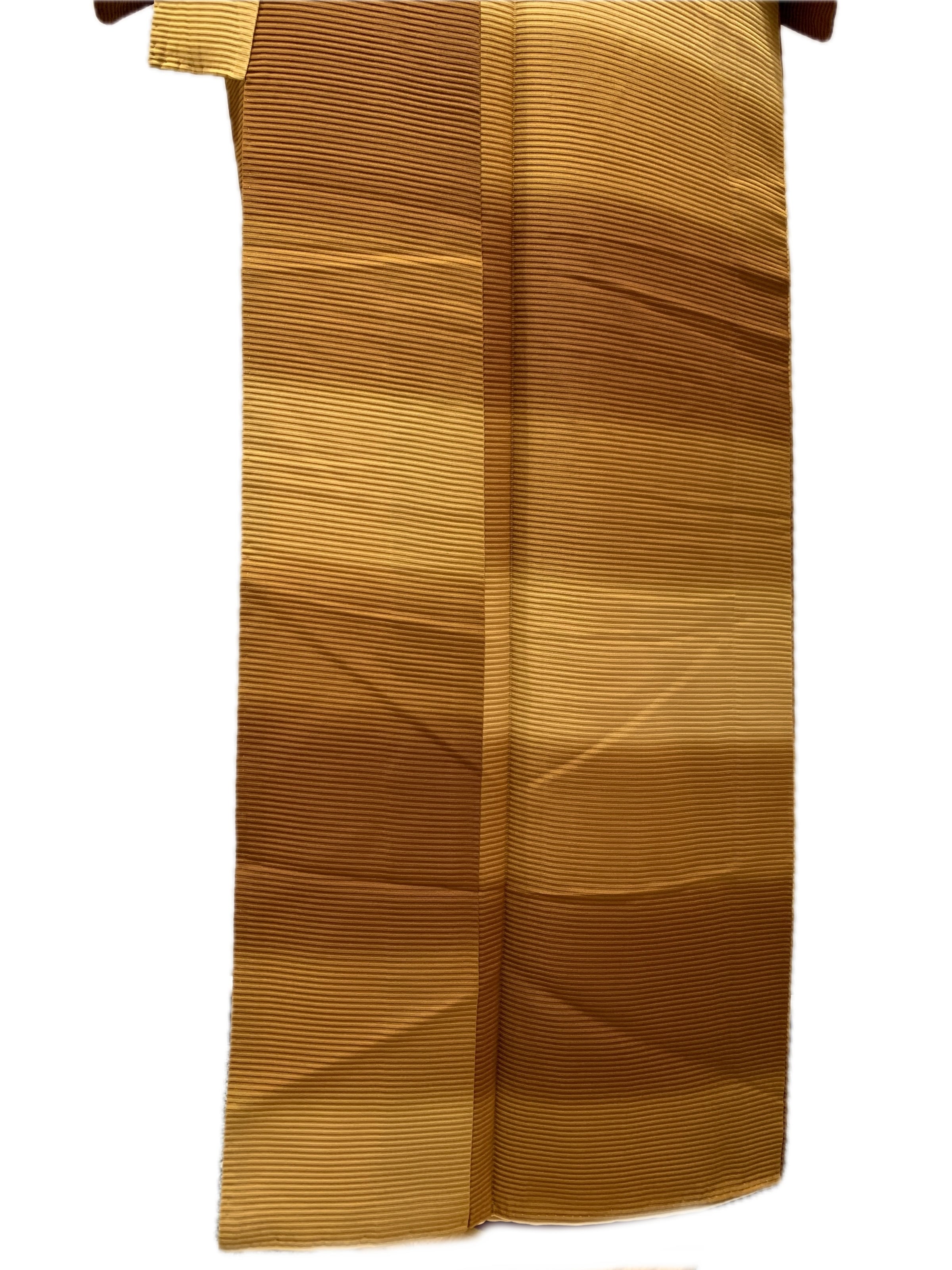 変わり織による横段の地紋を生かし、黄金色から土色系へと穏やかに移ろうぼかしに染め上げた袷着物です。