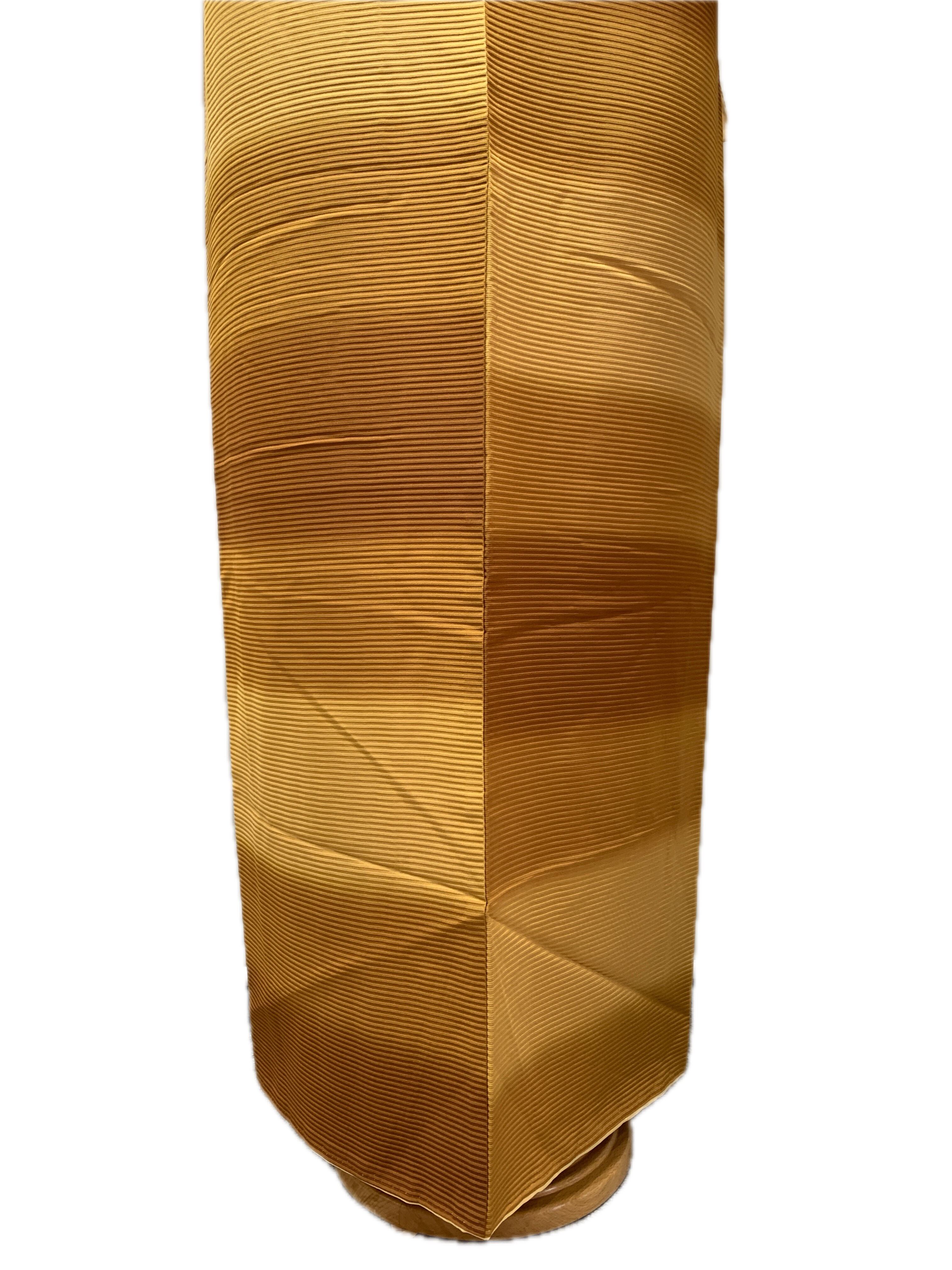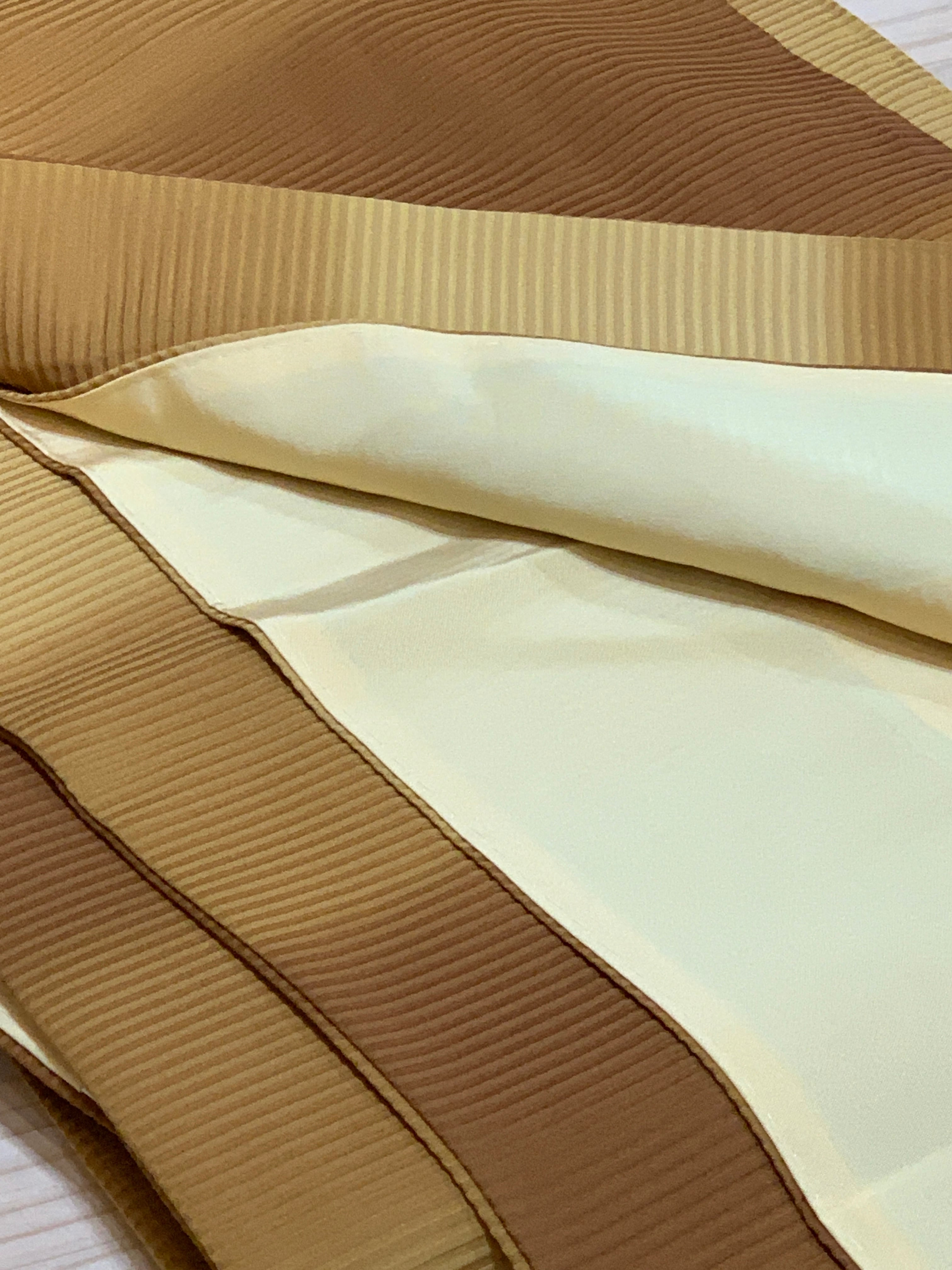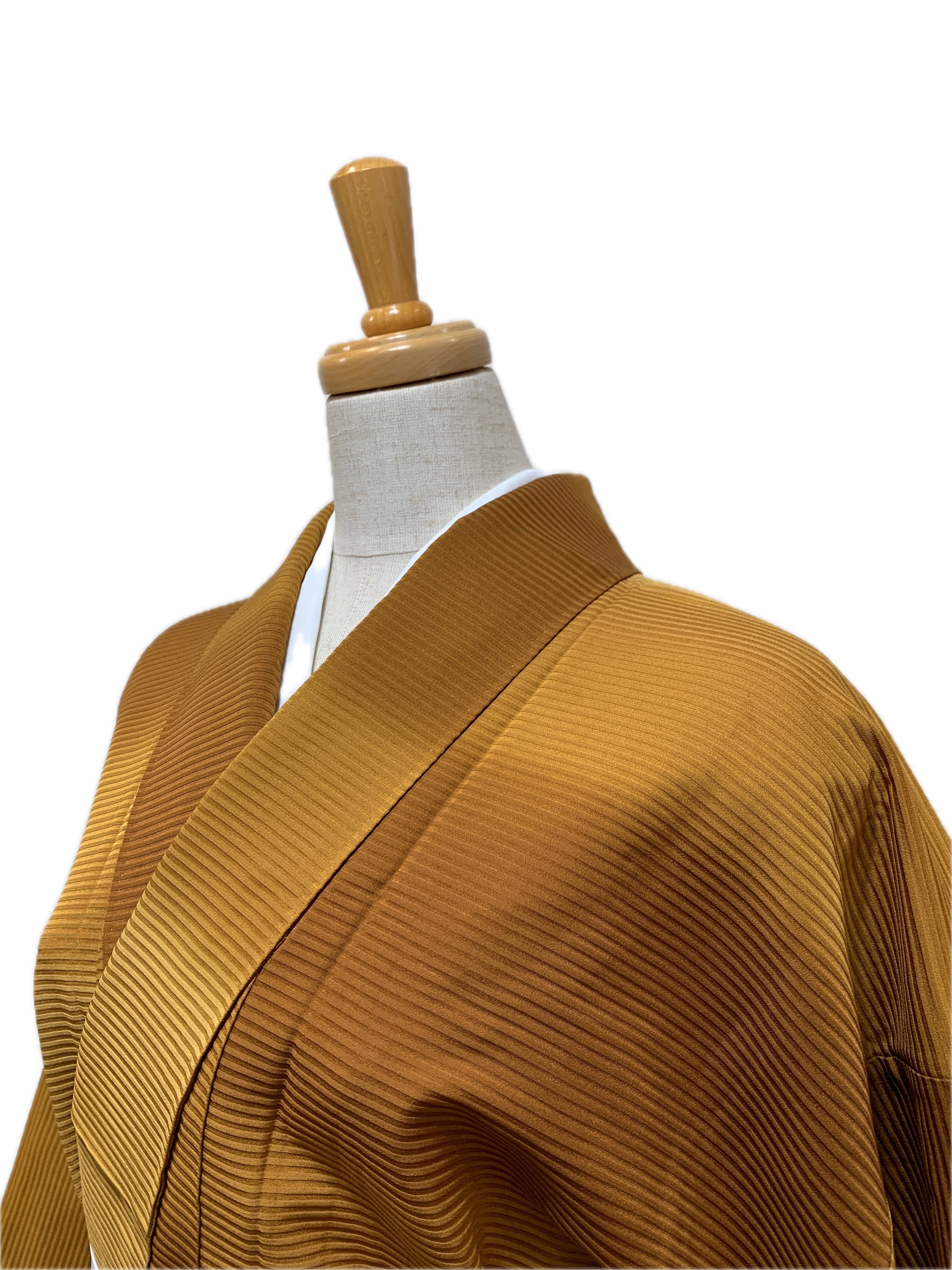 変わり織による横段の地紋を生かし、黄金色から土色系へと穏やかに移ろうぼかしに染め上げた袷着物です。
