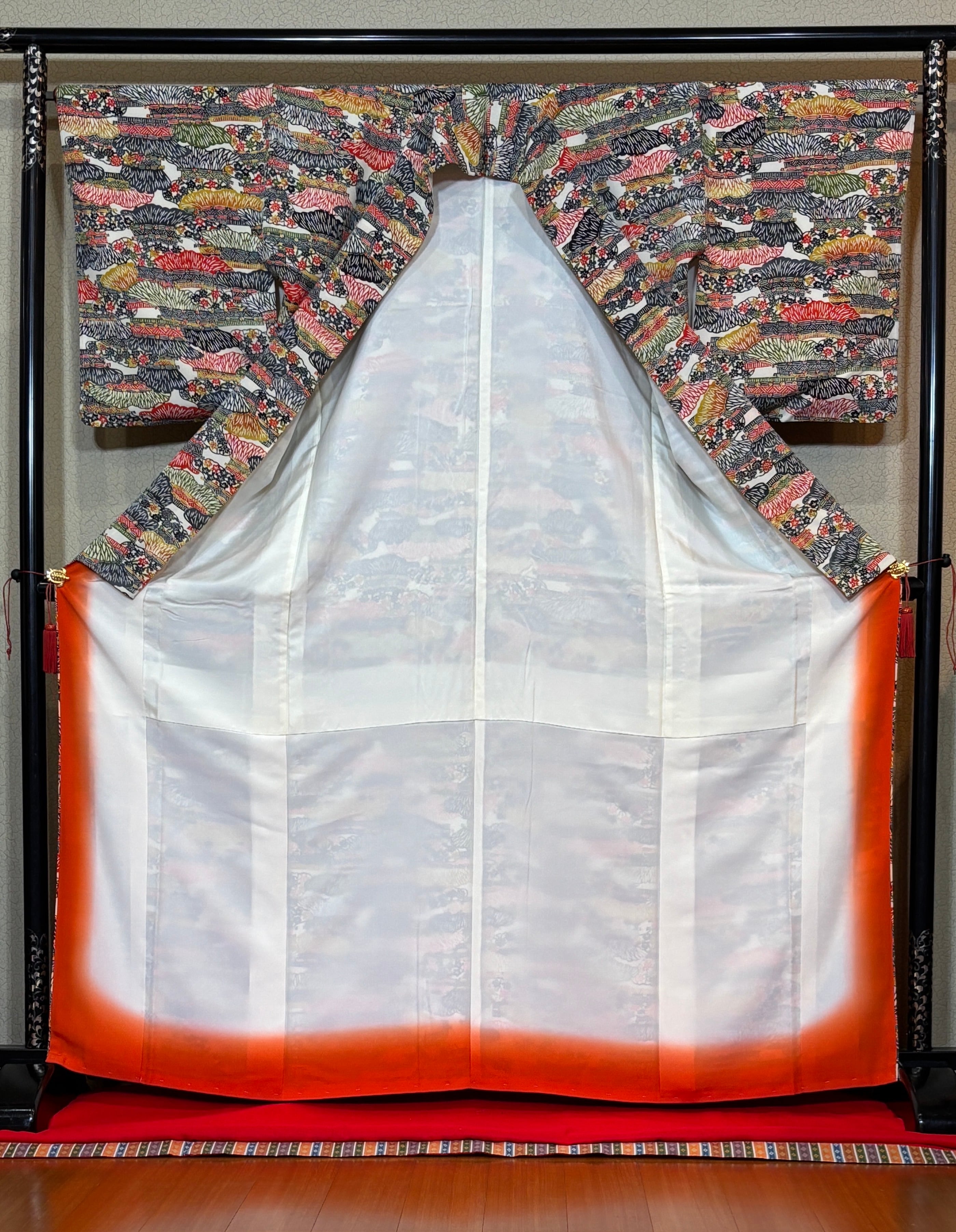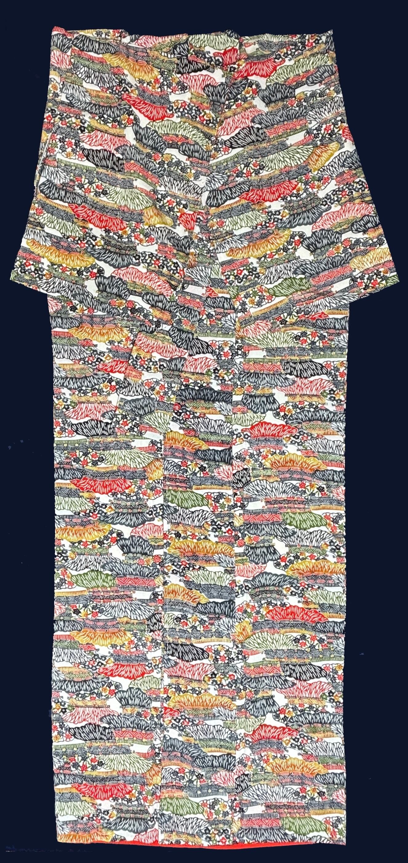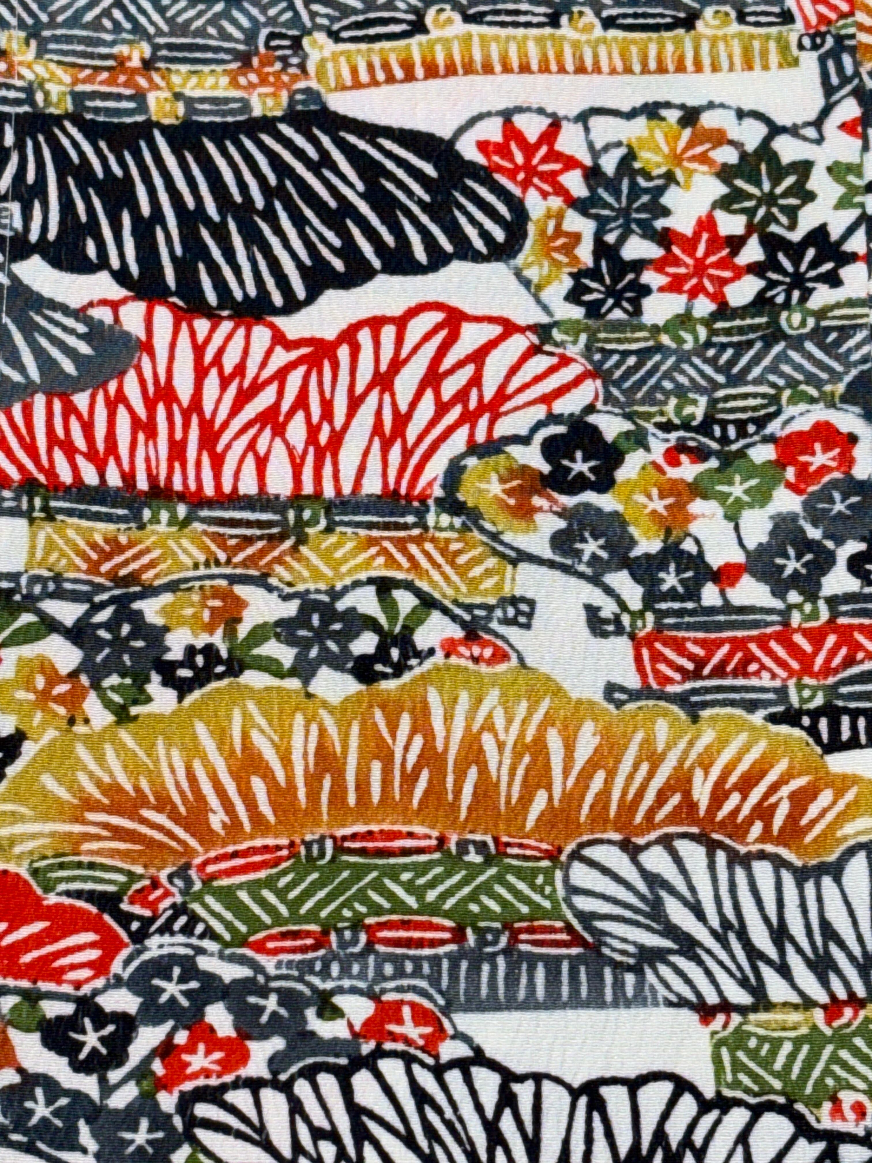 色合いが多色ですので、その分数多くの型紙を使用しなければ染め上げられない、手間を必要とした細かい柄の京紅型らしい色柄の趣です。