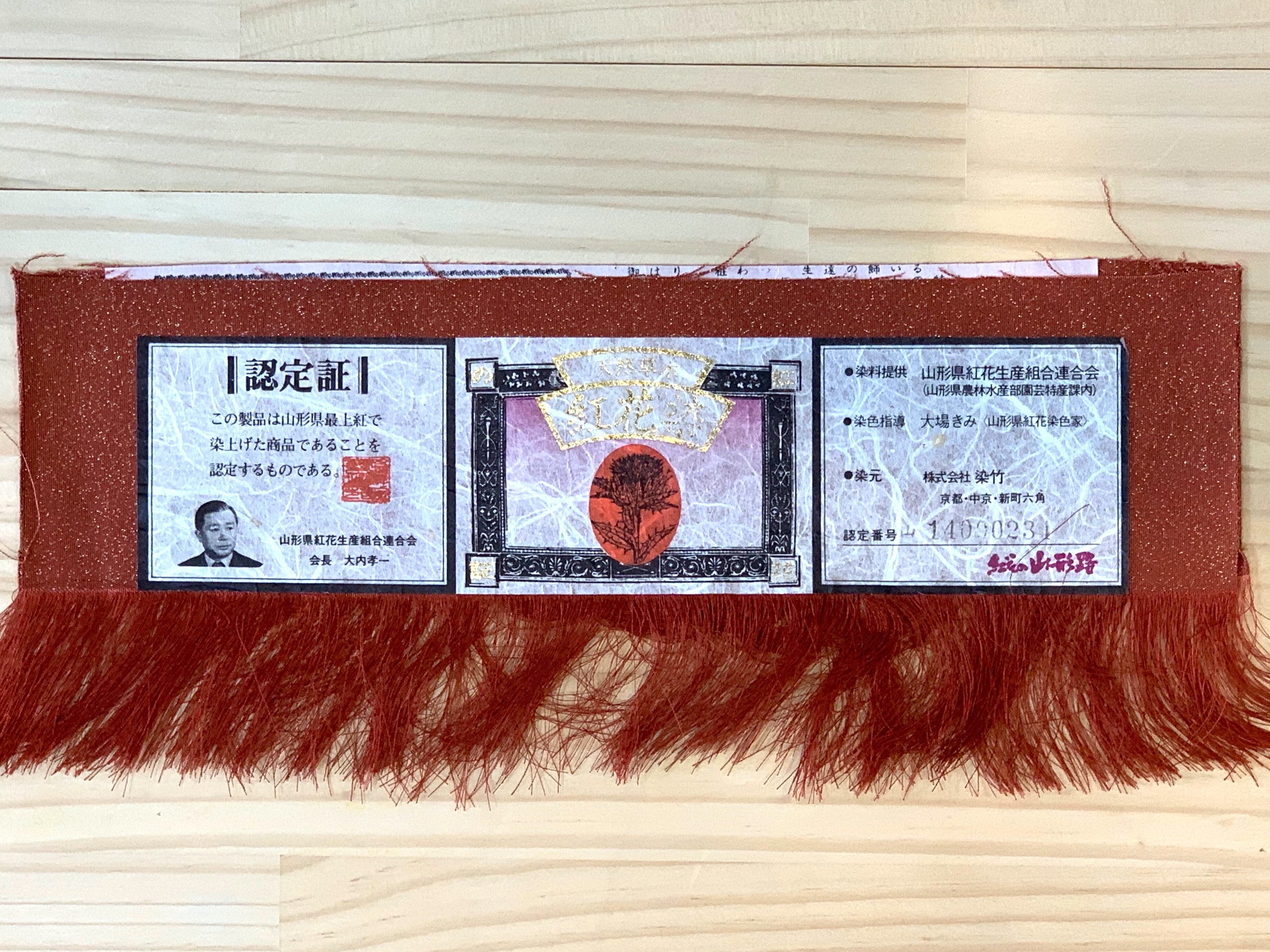 天然の草木染めの代表格である紅花染めにて染めた糸を使い、単色の中にも横糸に金糸を織り込み上品さを演出。