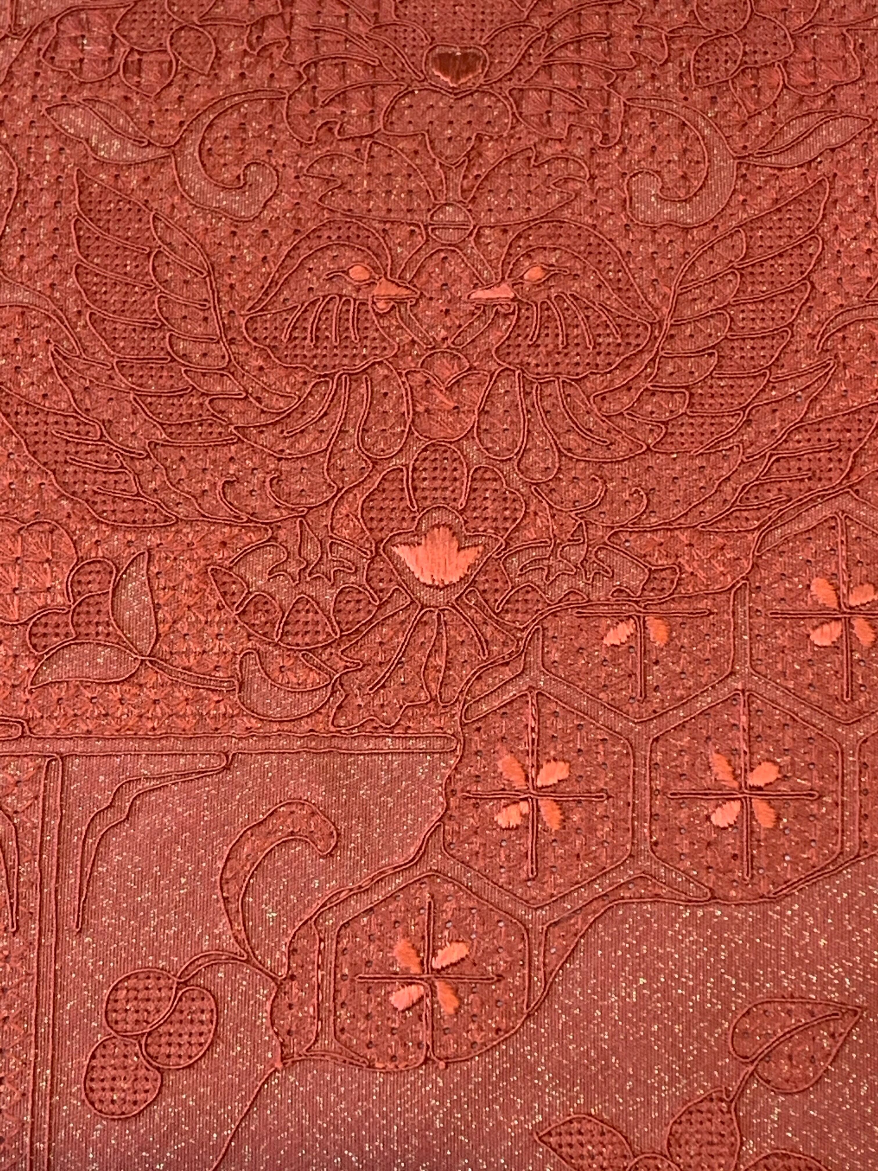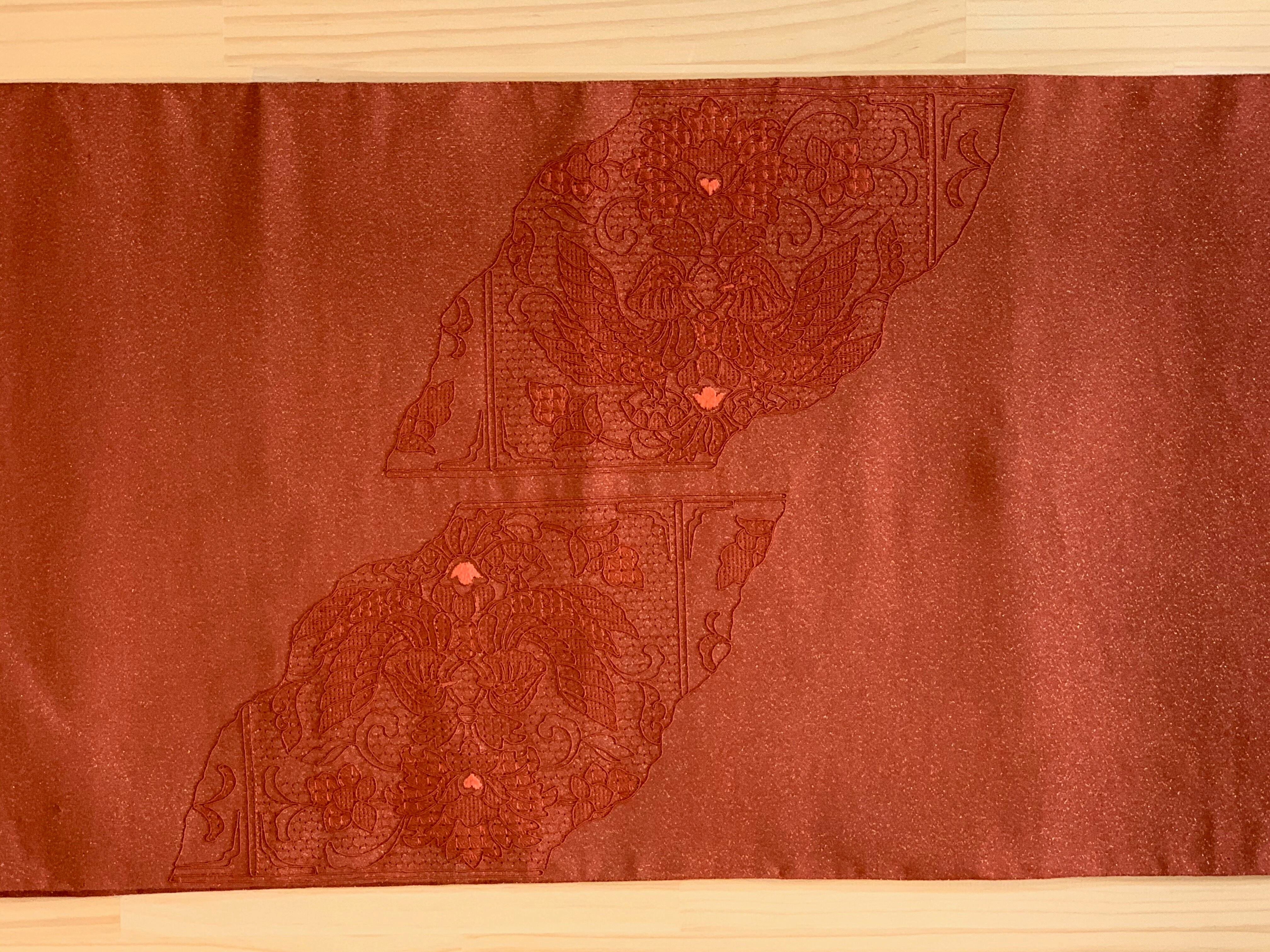 最上の天然草木染『紅花』で染め上げた糸にて汕頭刺繍で柄を織り上げた袋帯です。