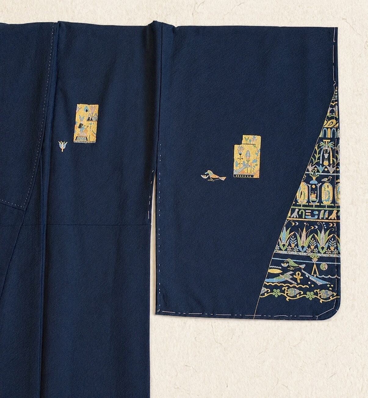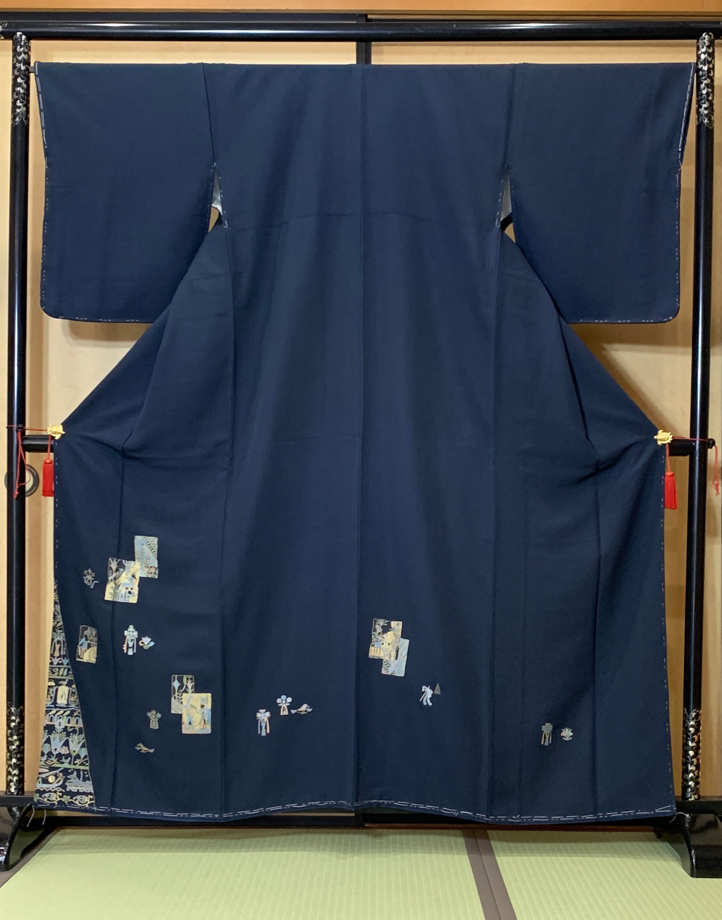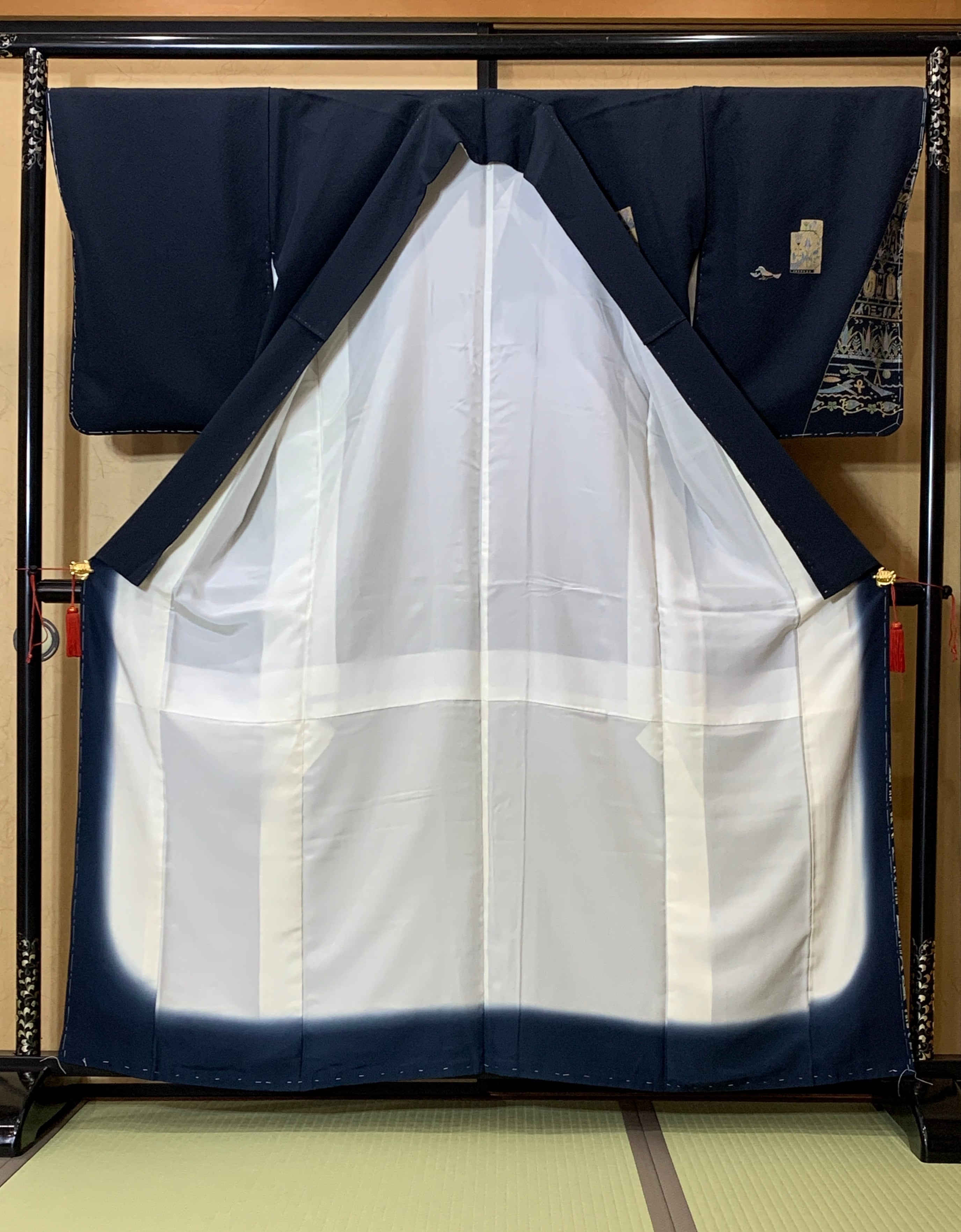 深みのある紺地に対し、文様は控えめながらも印象的に配され、裾へ向かって静かに趣を深めていく構成となっています。