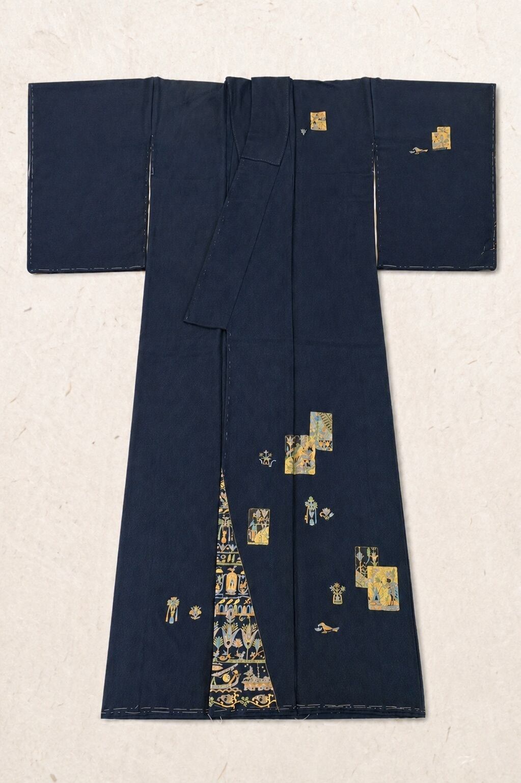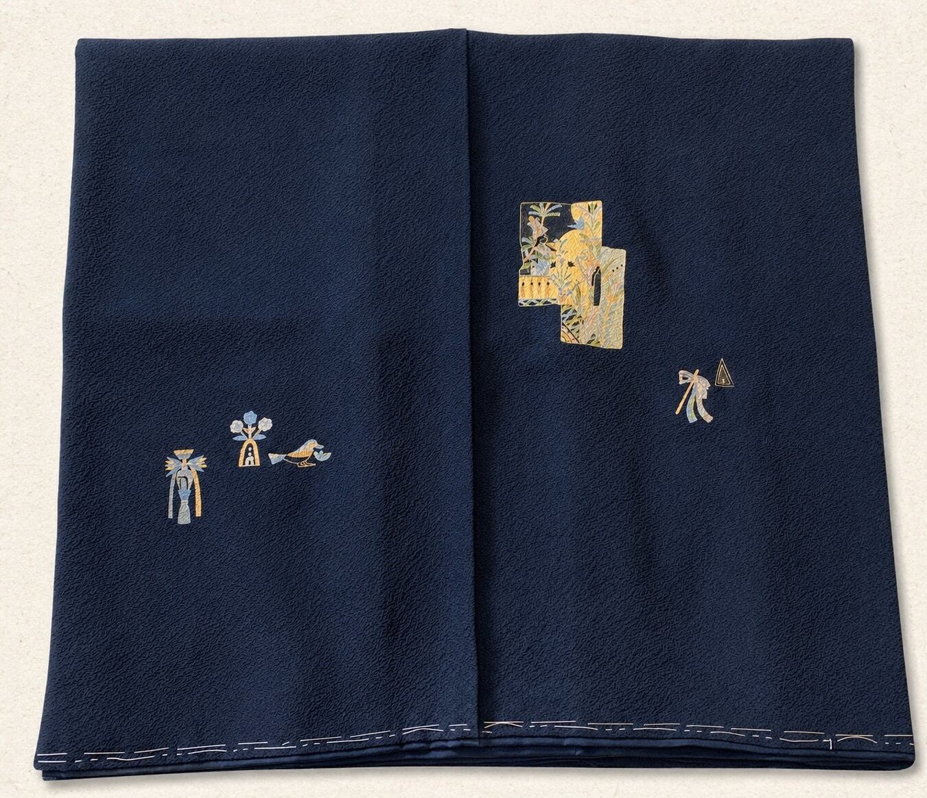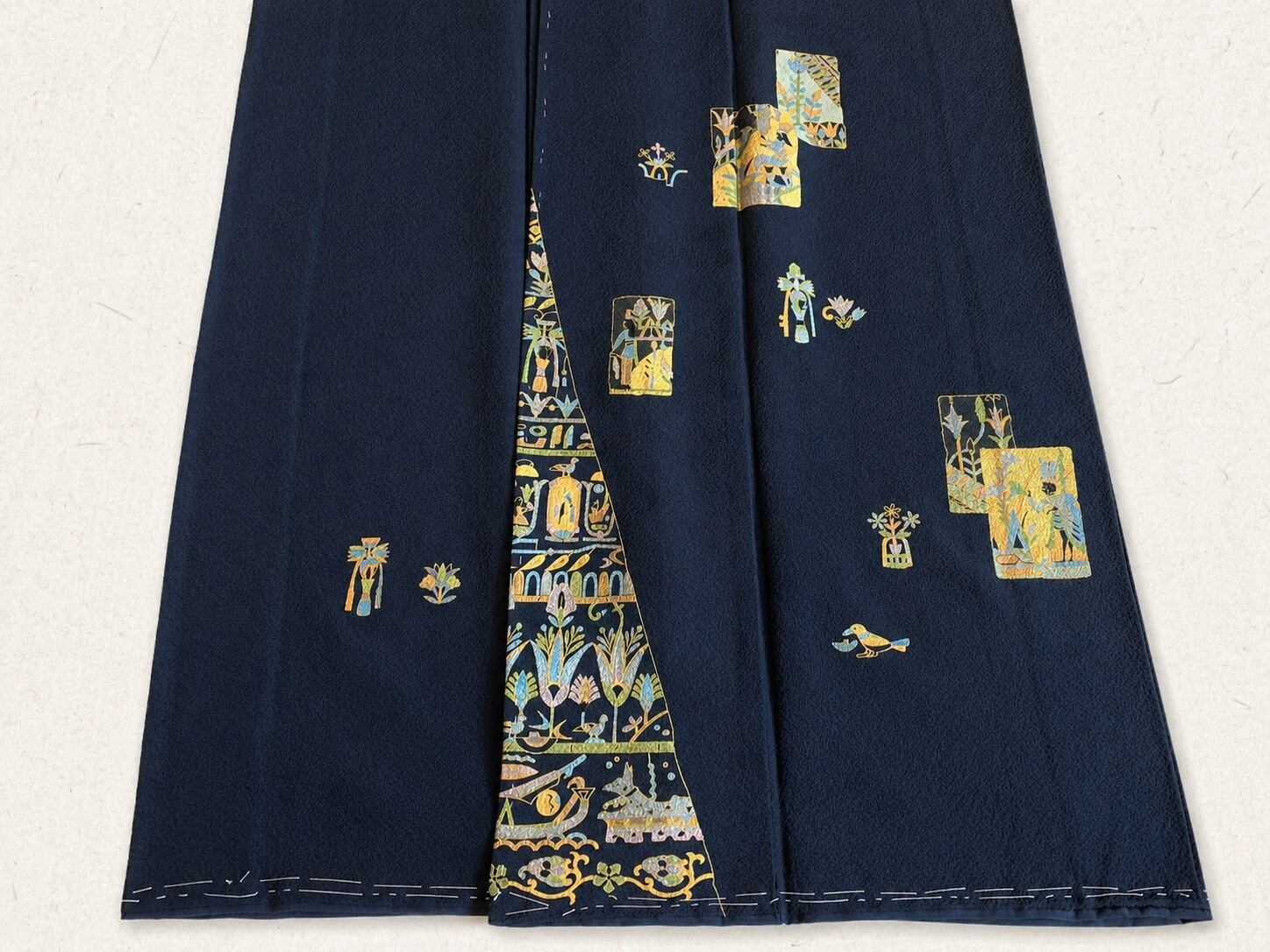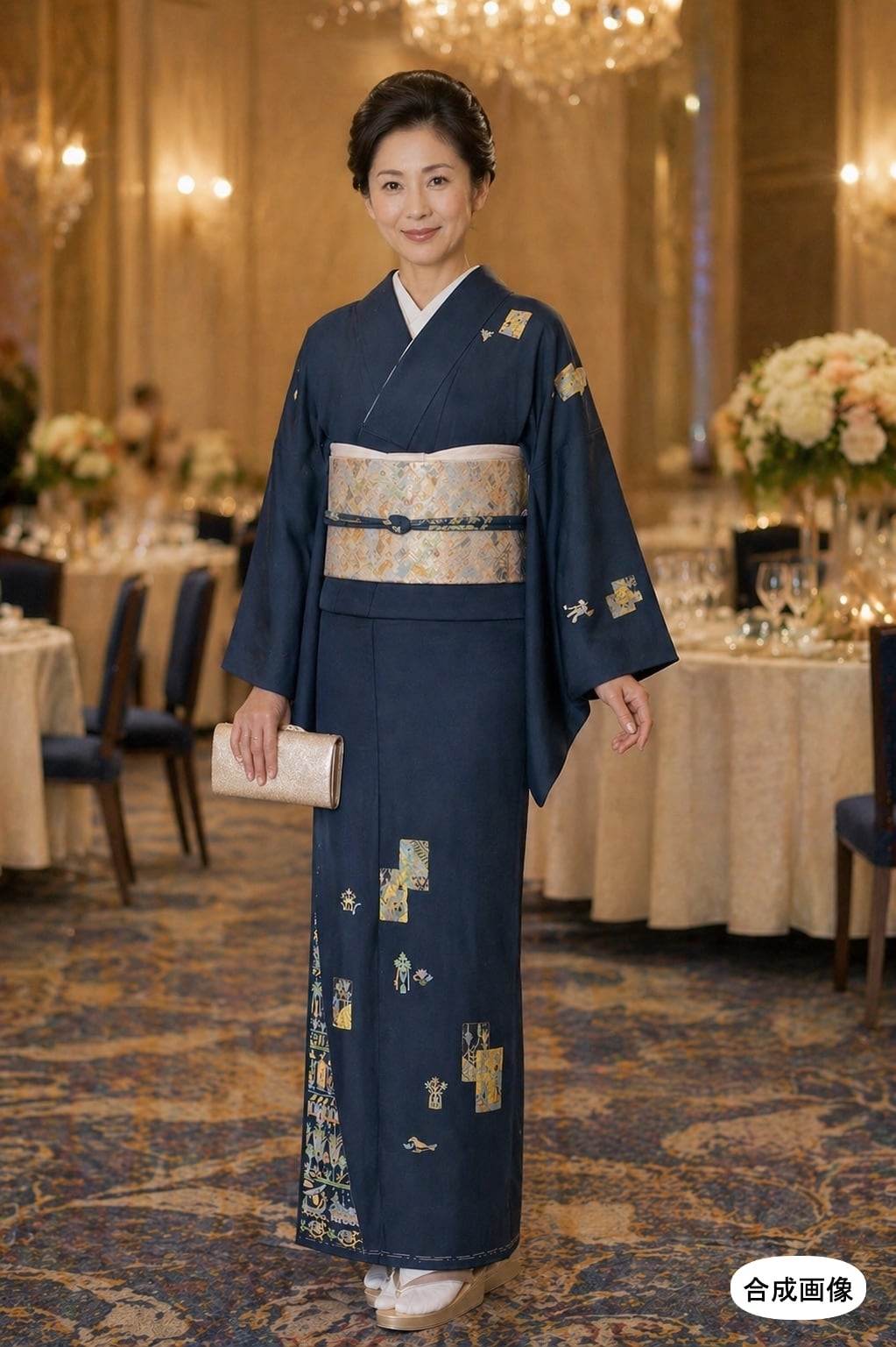 深みのある紺地に対し、文様は控えめながらも印象的に配され、裾へ向かって静かに趣を深めていく構成となっています。