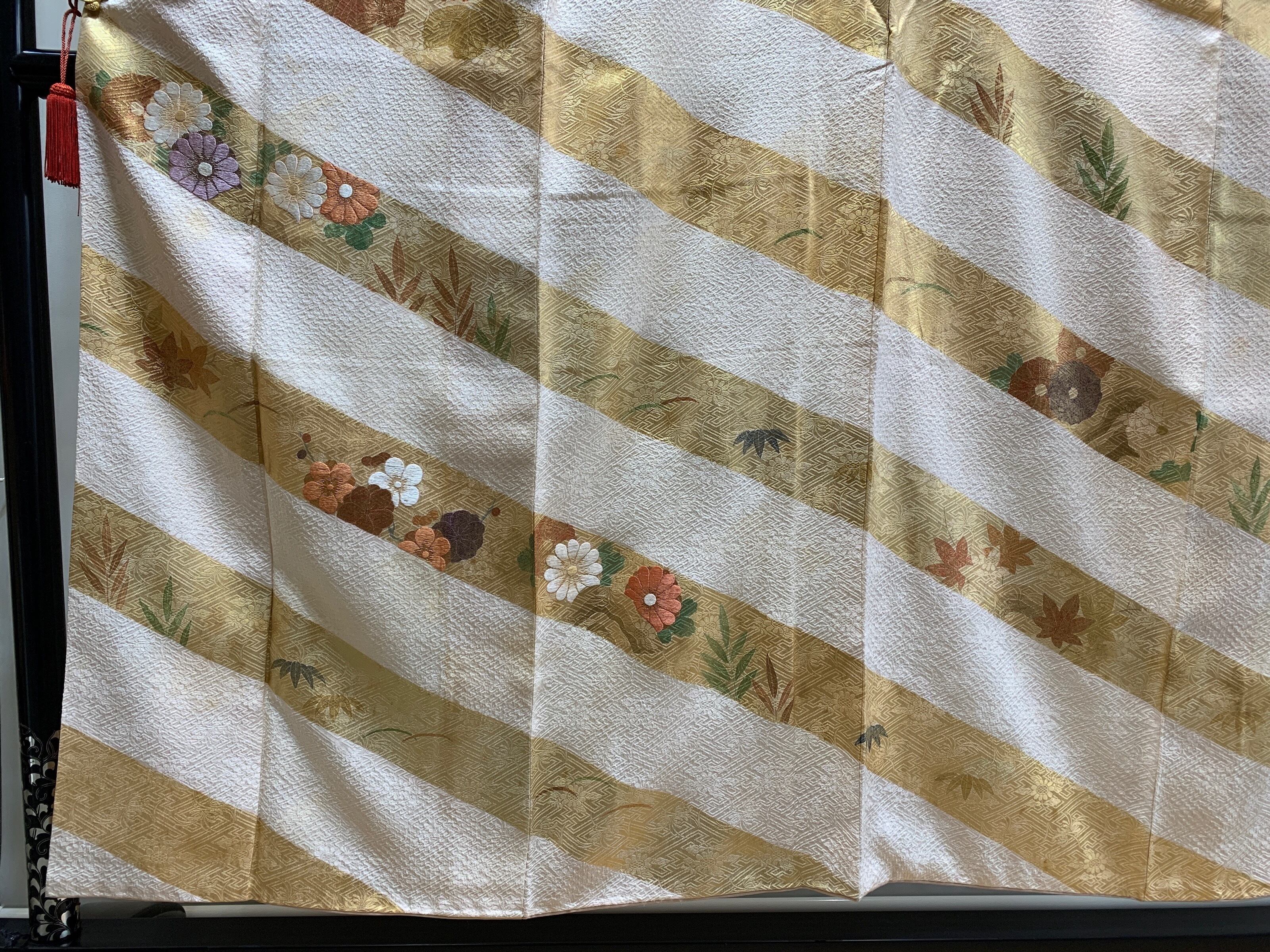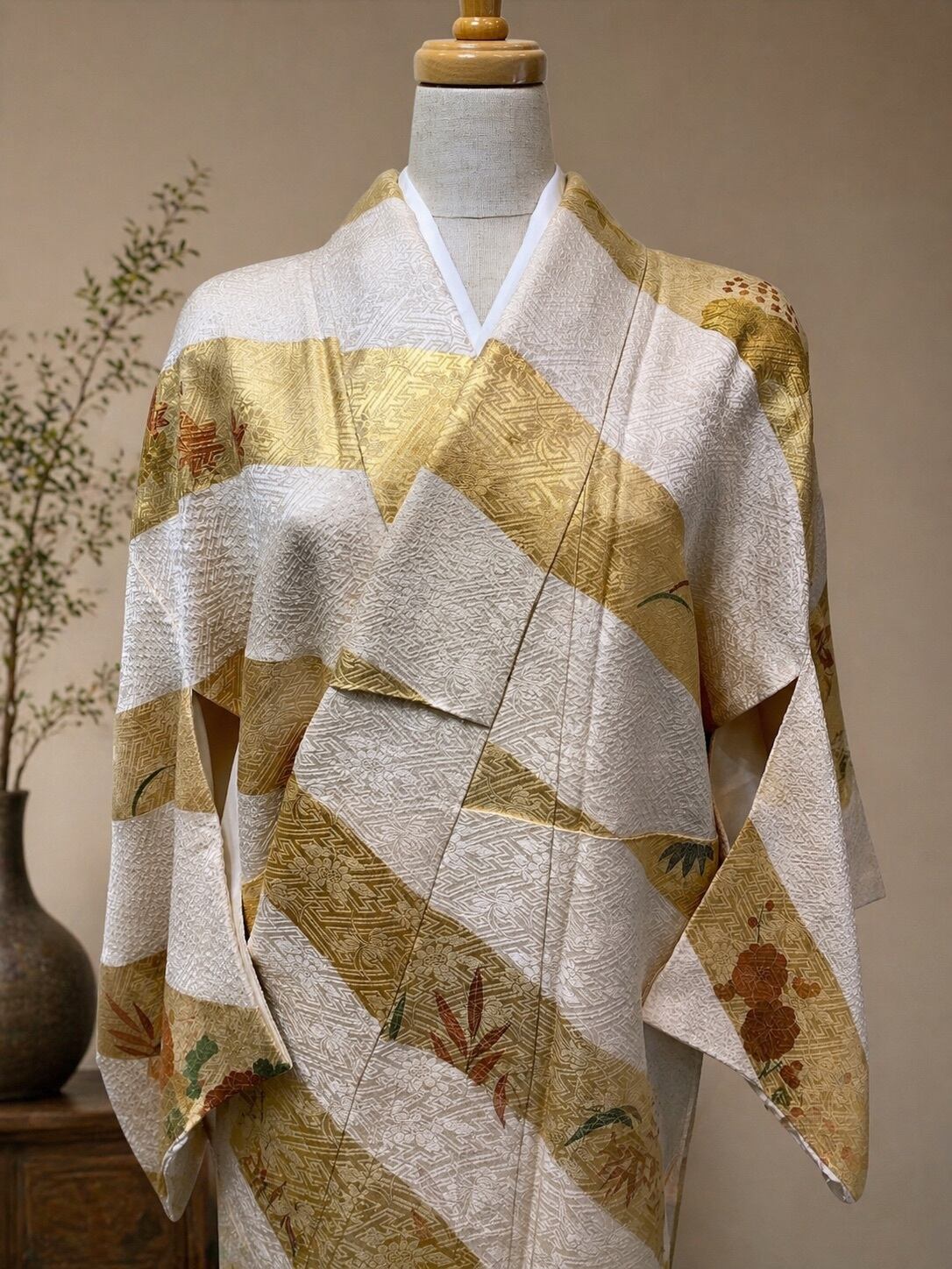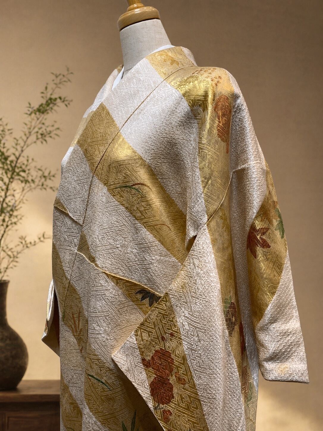 金箔を大胆に斜段で配した構成は、能装束や古典意匠の流れを感じさせながらも、重々しさを抑えた現代的な感覚を備えています。