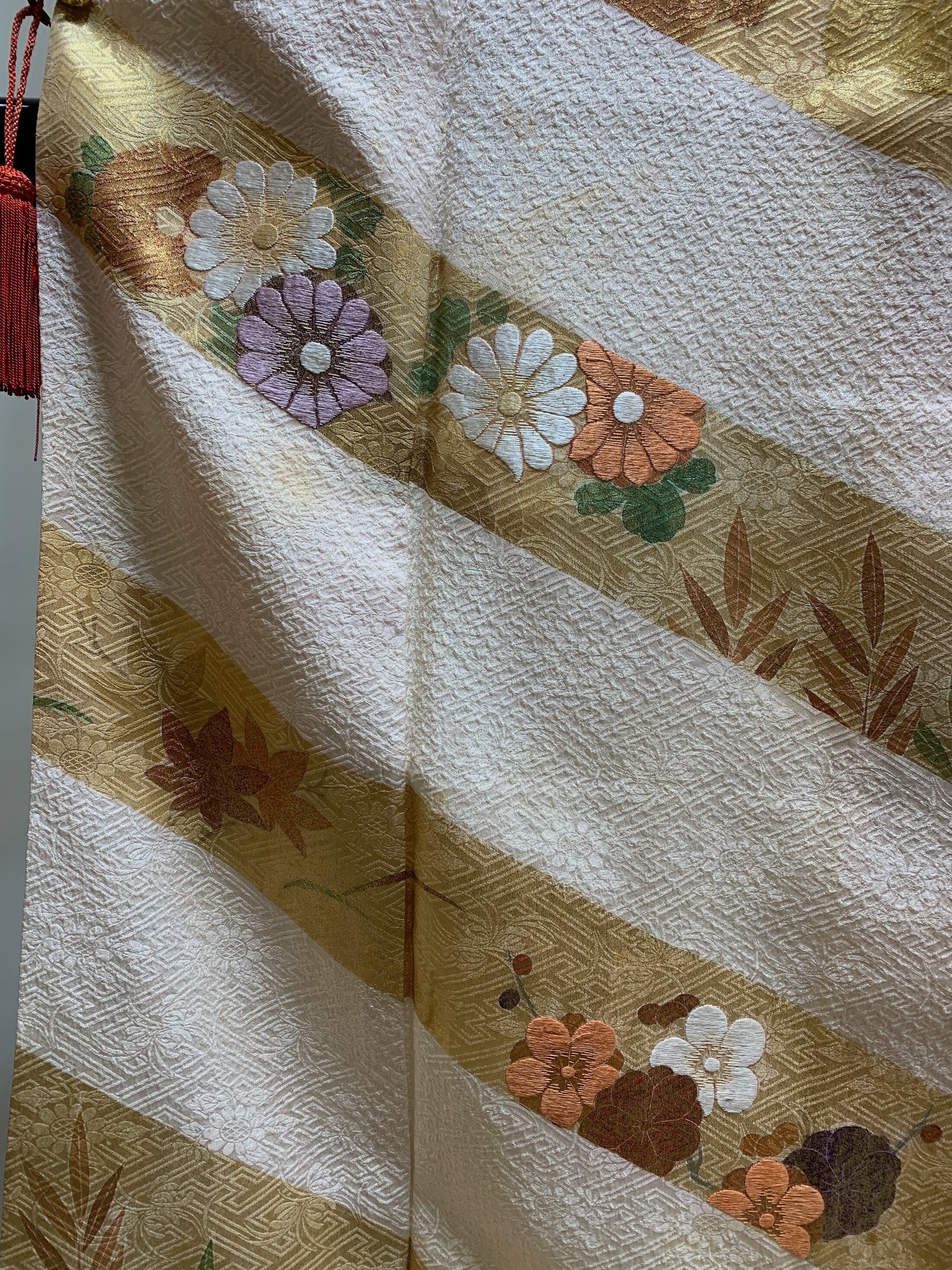 さらに金箔以外の部分には草花文様を配したうえで一部に手刺繍を加えるなど、手仕事の趣も感じられる仕上がりとなっています。