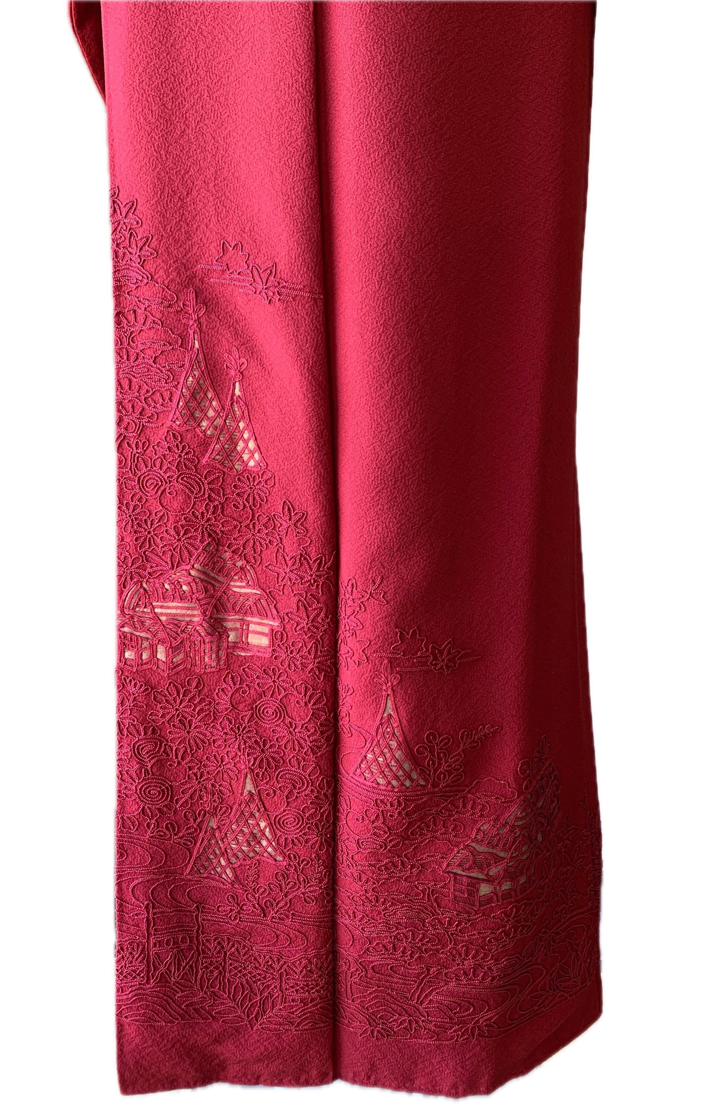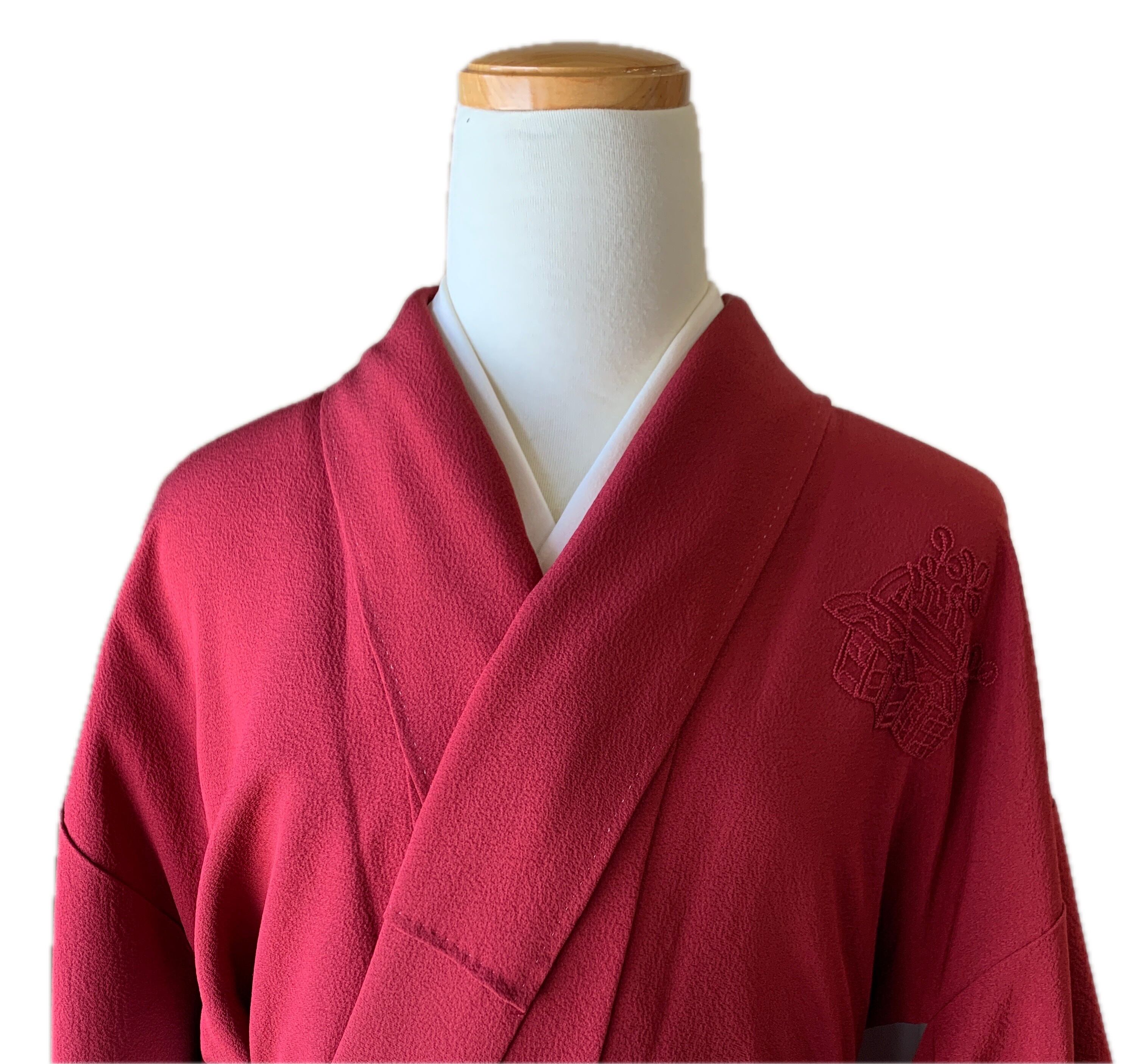 しぼの細かい上質な縮緬地を用い、深みのあるワイン色(赤茶系)に染め上げた附下袷着物です。
