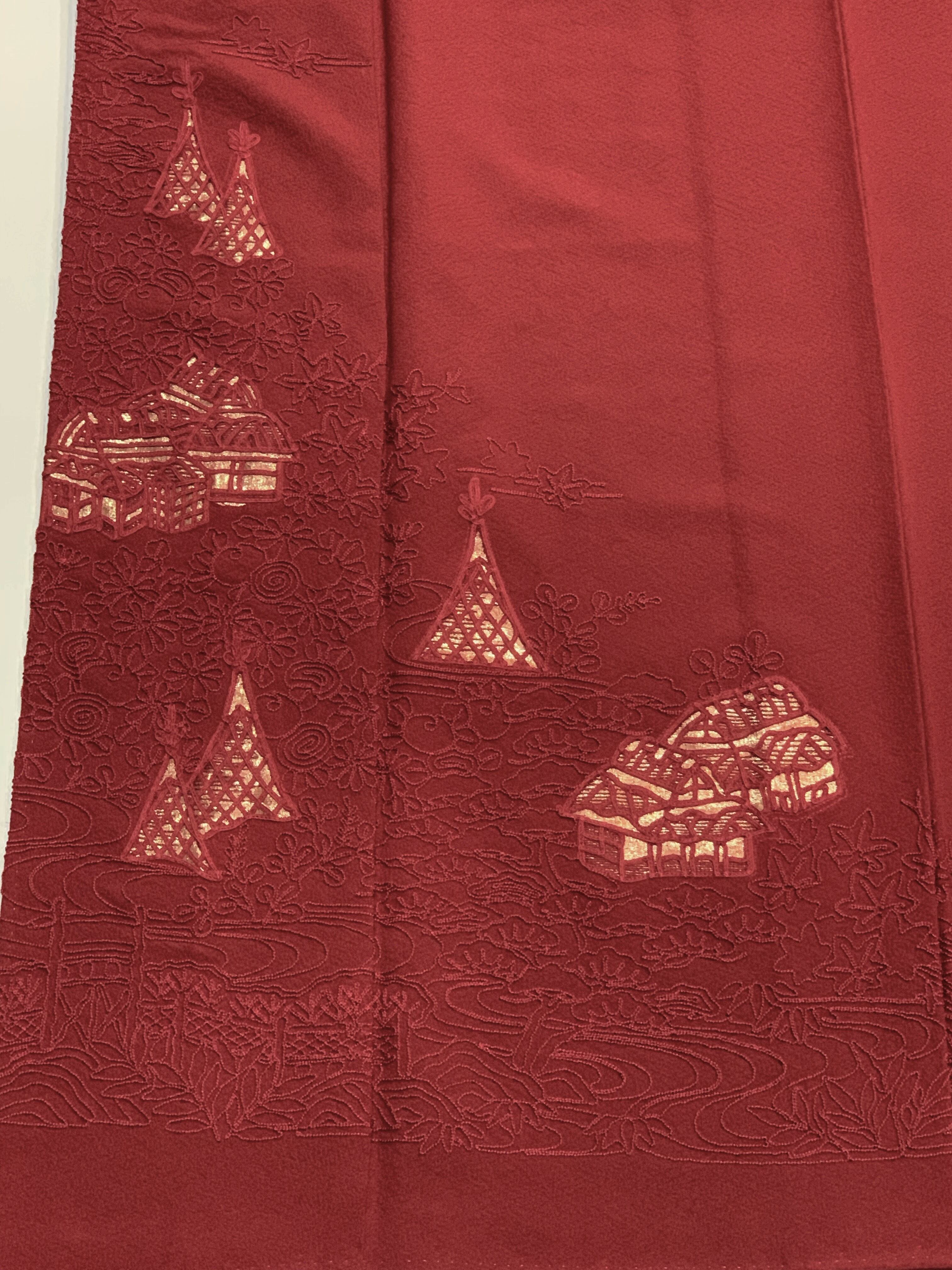 意匠は絵羽付けにて山村の景を相良刺繍で表し、さらに片喰の三つ紋を配した格のある一枚です。