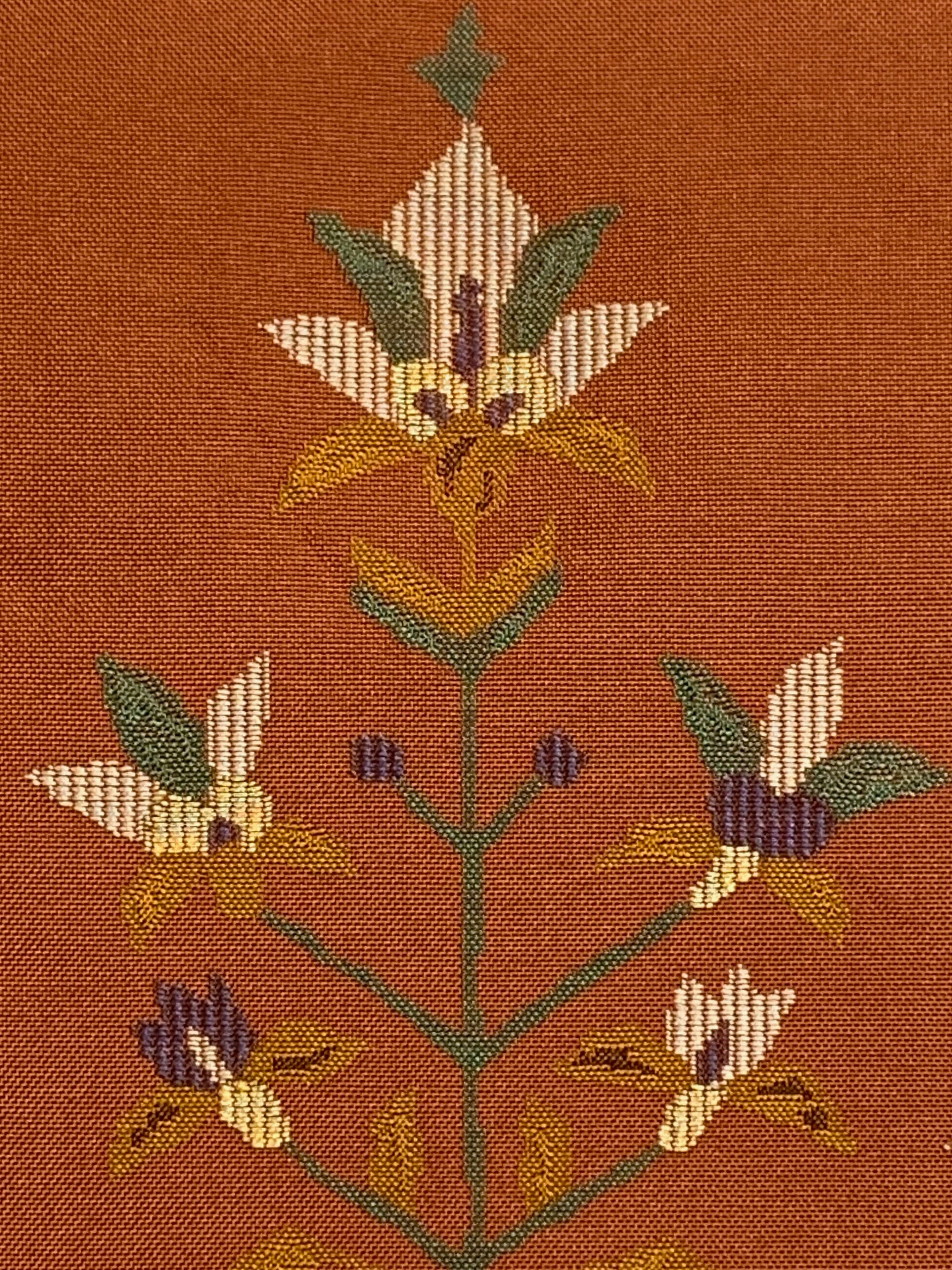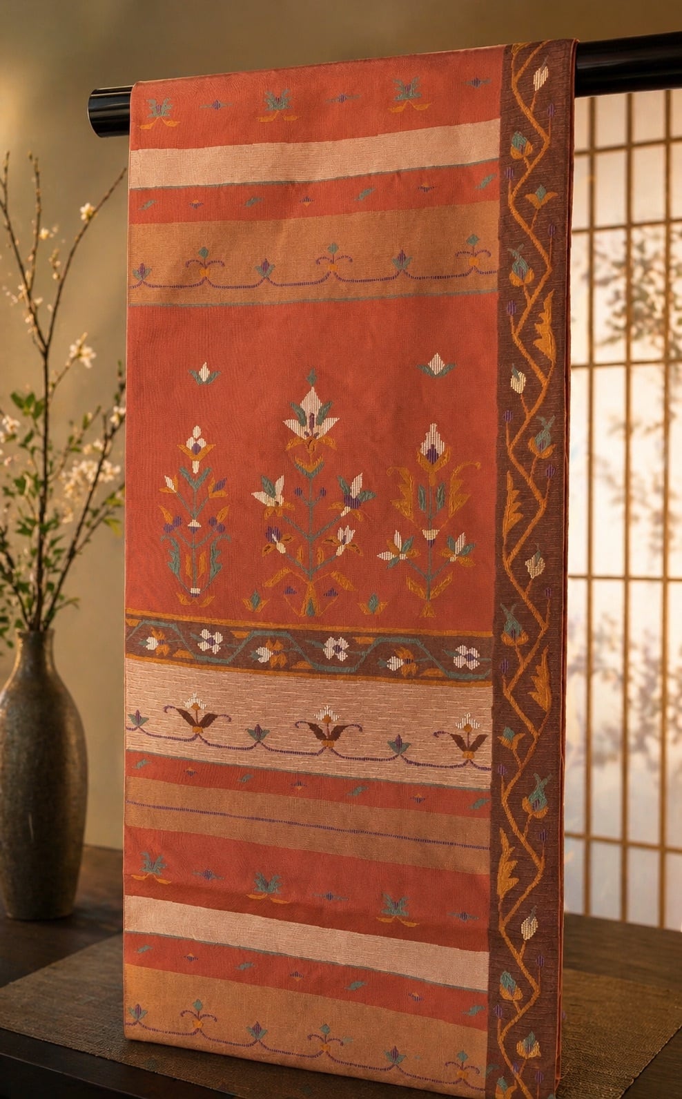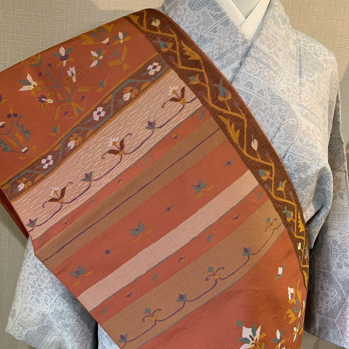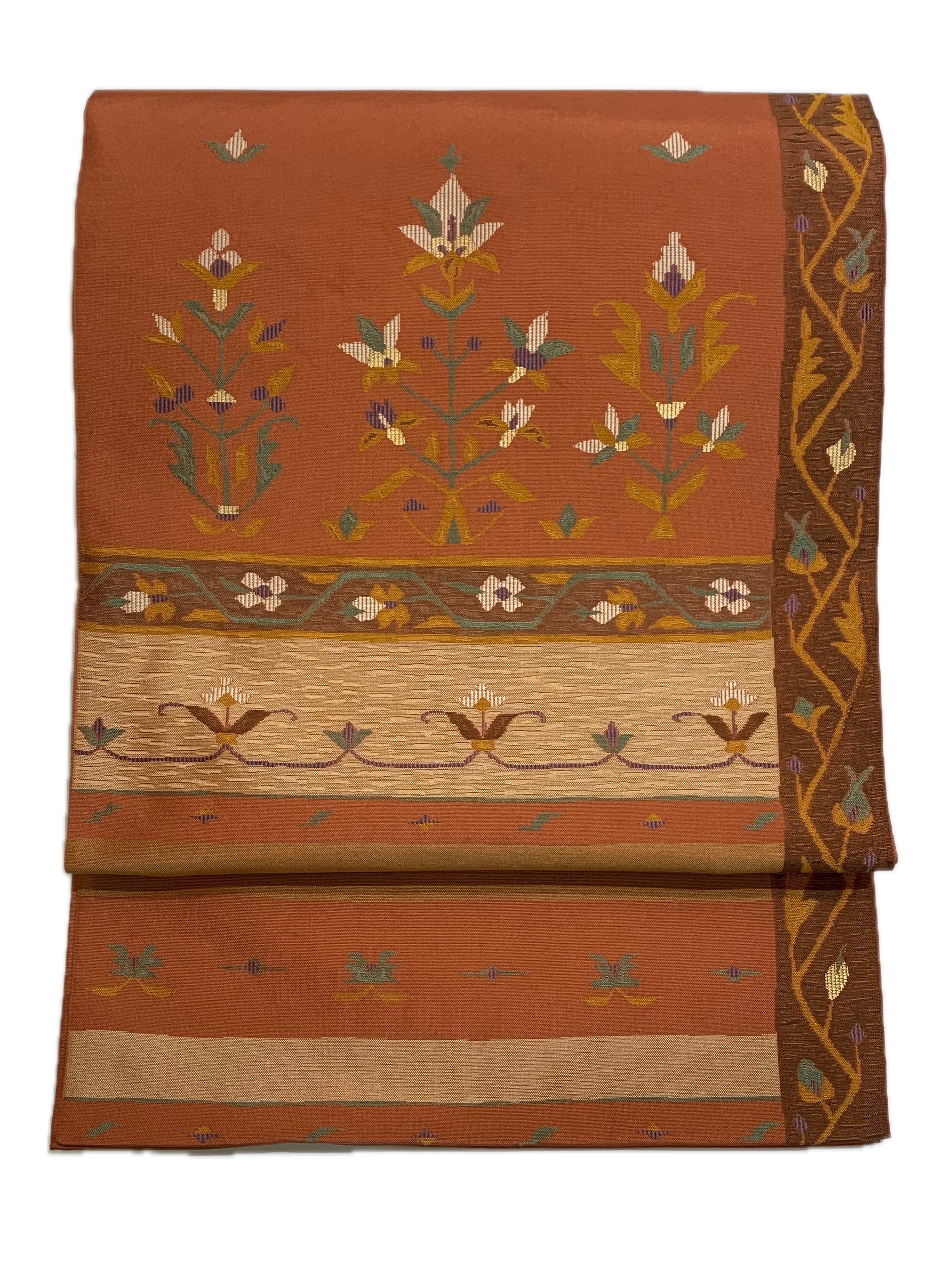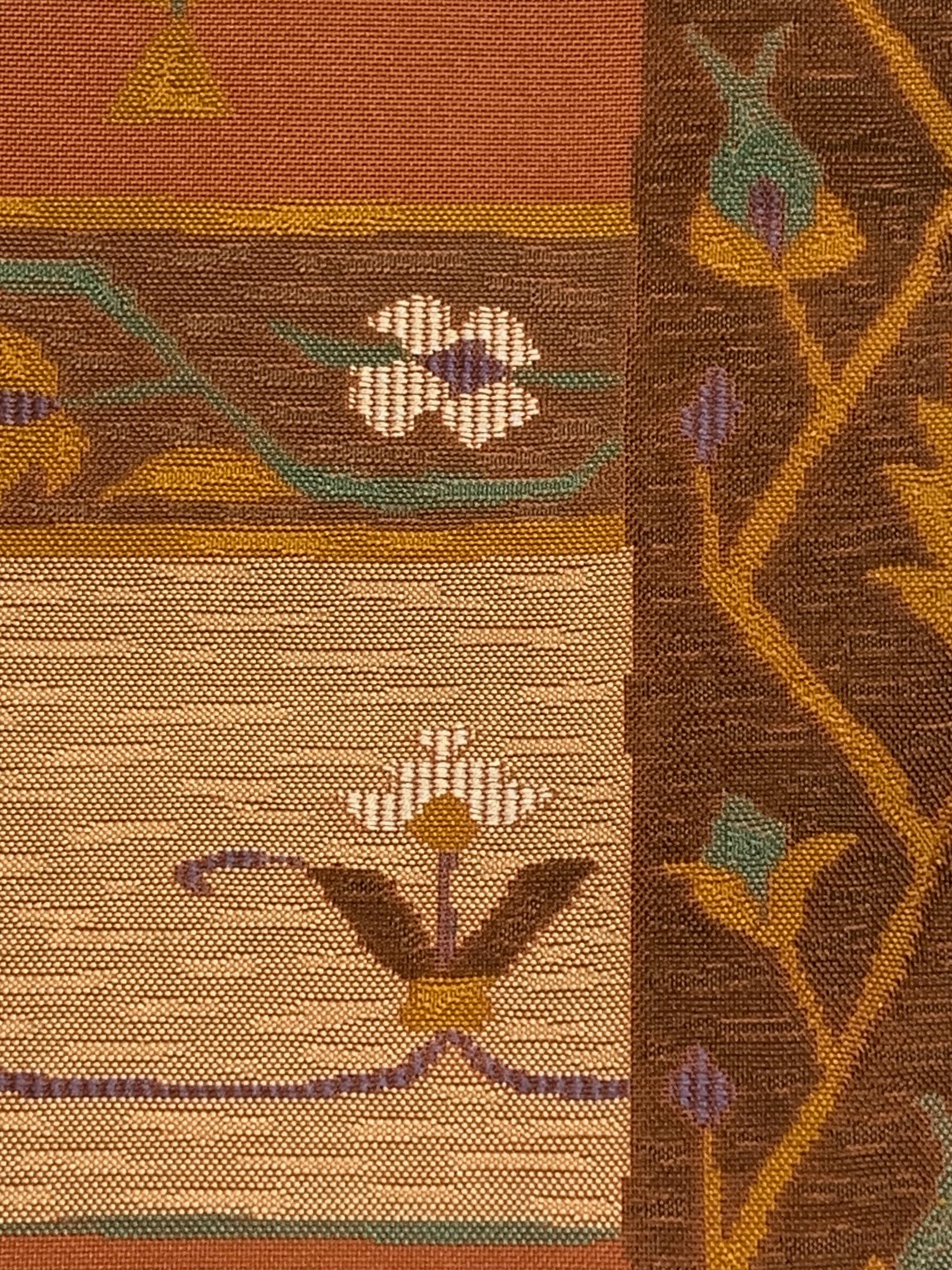 温かみのある赤茶系の地に、更紗調の花紋や草花文様を横段構成で織り上げた意匠。