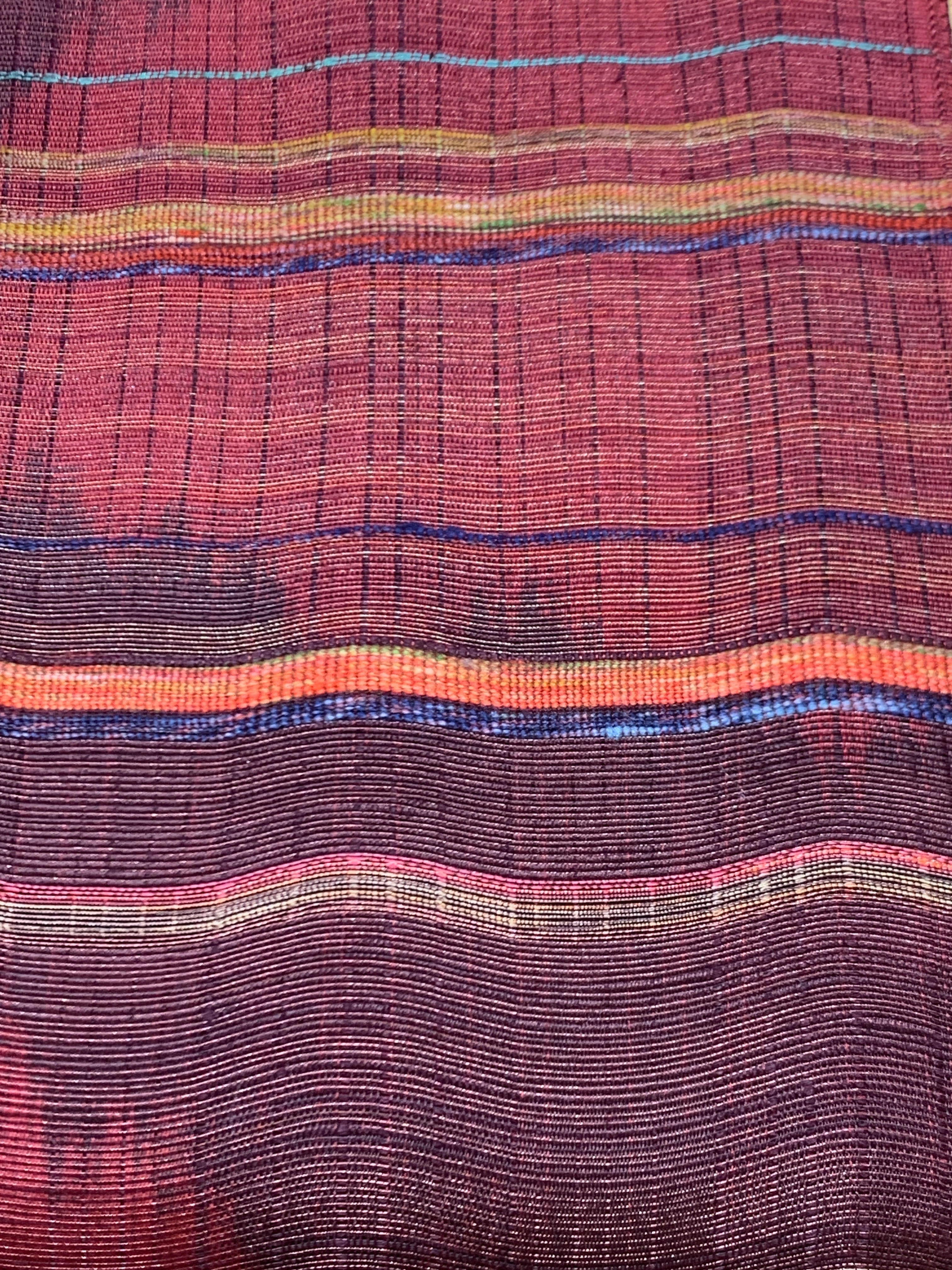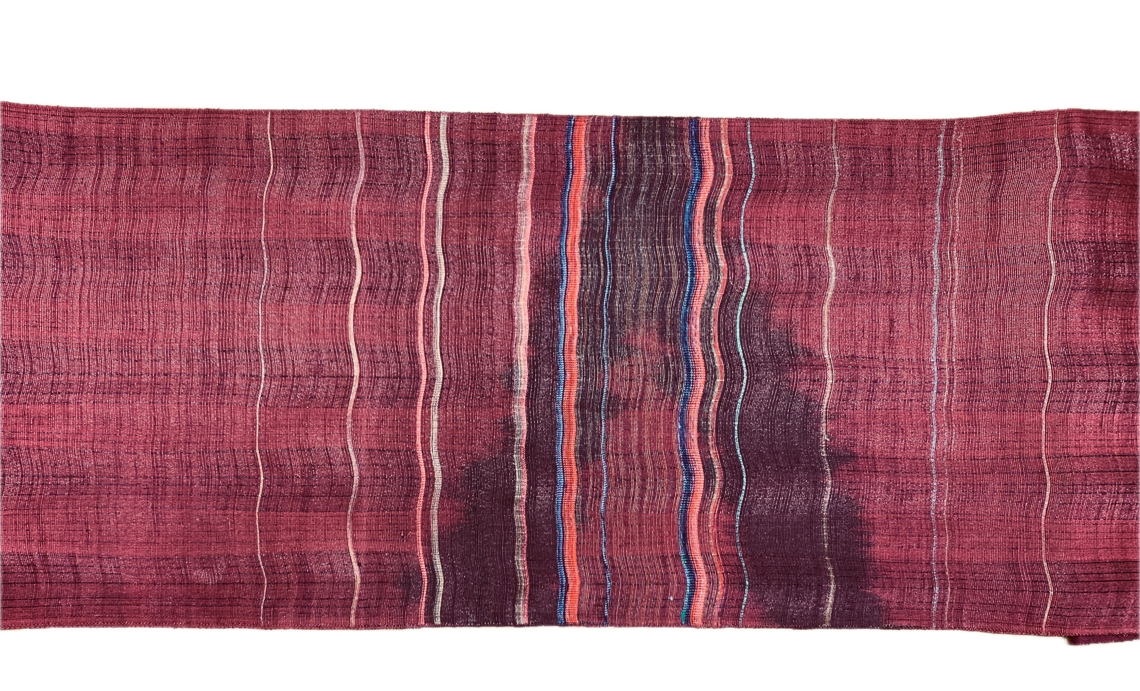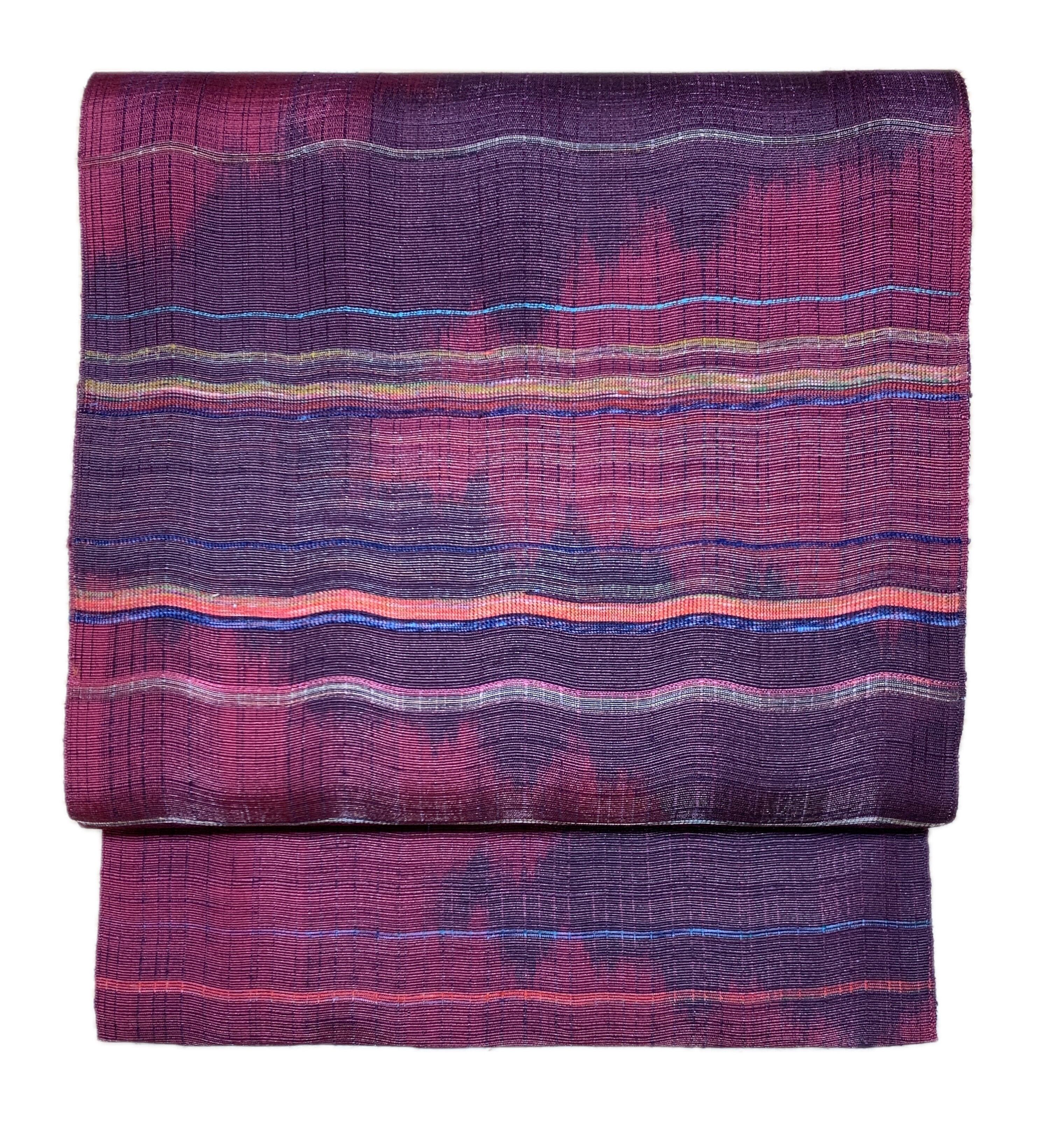 臙脂の色を主に横段に波線を表し金糸も織り込んでいます。(帯地は写真を参照してください。)