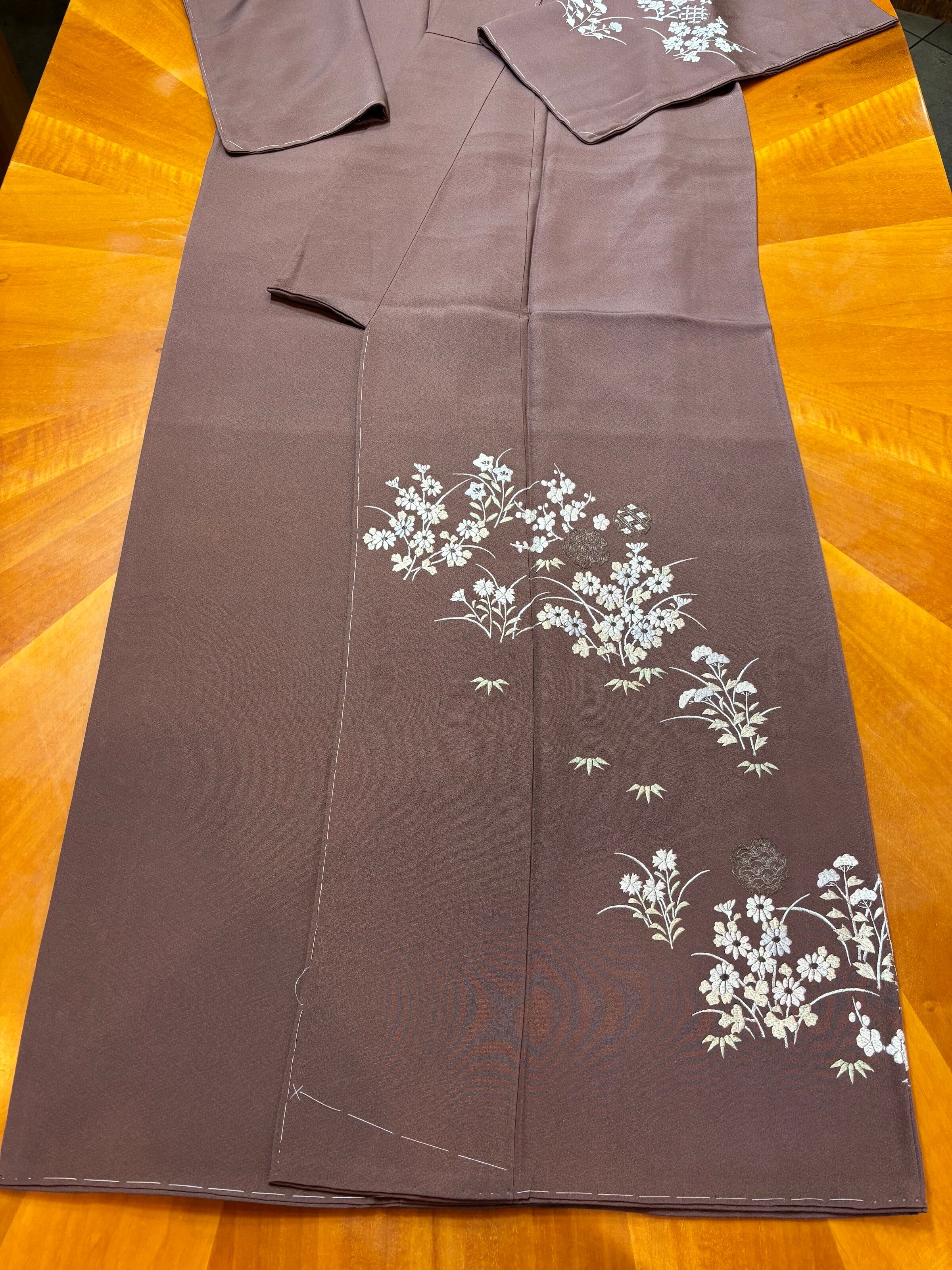 この着物は重め一越縮緬地に[葡萄鼠/ぶどうねずみ/#705b67]〜[紫鳶/むらさきとび/#5f414b]色にて引き染めしたあと、訪問着付け配置にて秋草花、雪輪亀甲紋を刺繍で仕上げた逸品ものの訪問着になります。